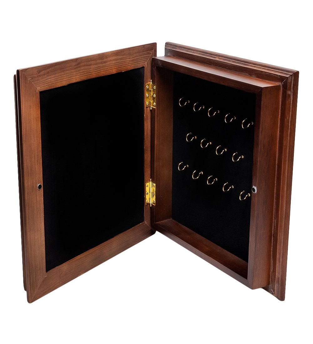 Деревянная ключница. Декоративная часть выполнена из меди методом гальванопластики с последующим никелированием.На медной табличке выгравирован текст о представленном оружии. На знаки нанесены ювелирные эмали. Внутри ключницы 14 крючков, отделка чёрный бачёрный бархат. На крышке магнит. Крышка крепится к основанию при помощи двух латунных петель, на задней стороне подвесы для крепленияключницы на стену.