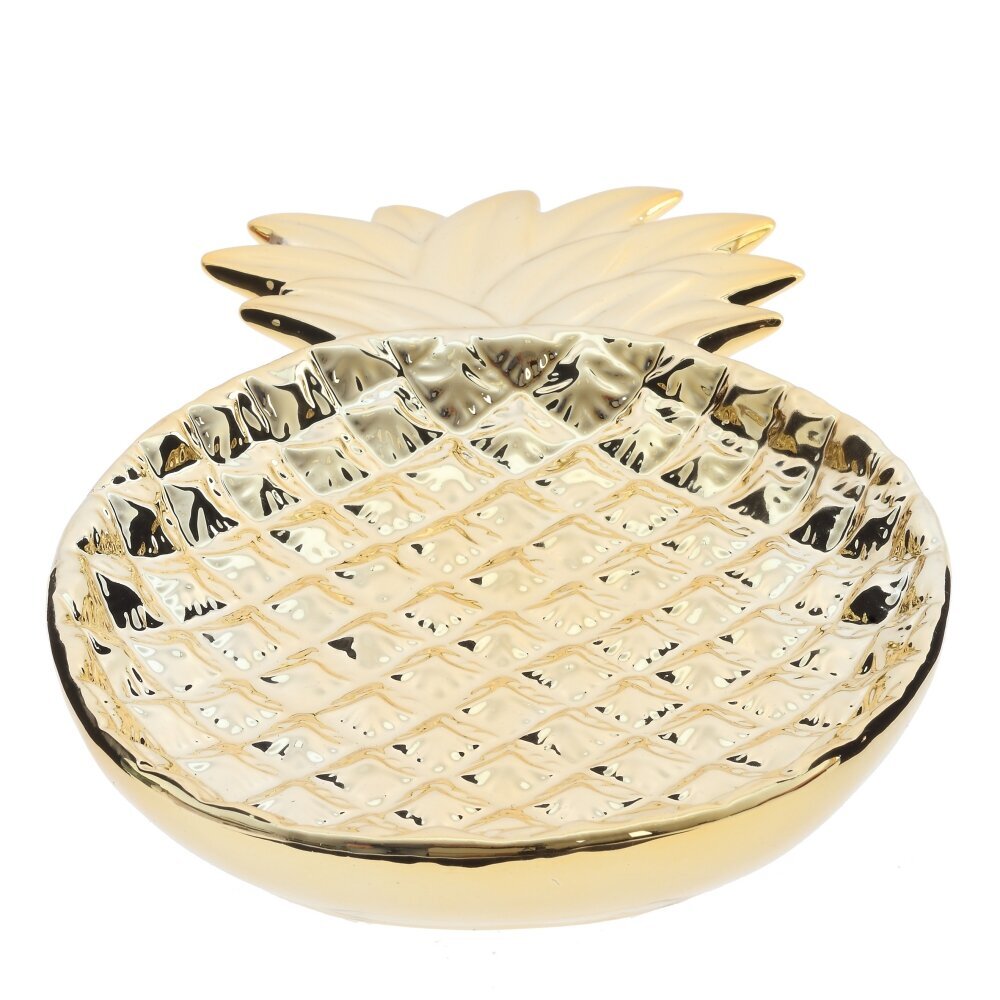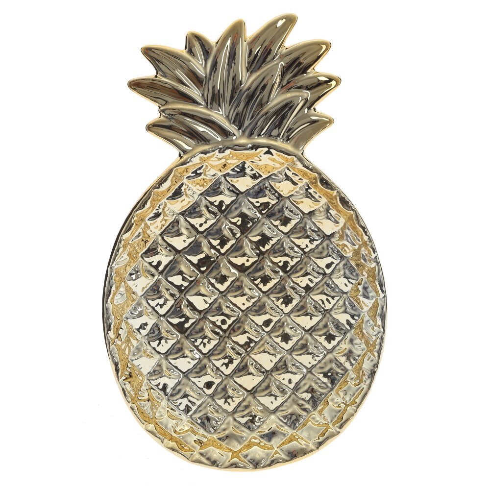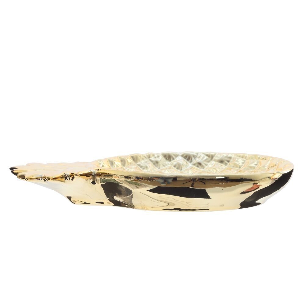 Декоративное блюдо "Ананас" из фарфора — стильный и эффектный аксессуар для вашего интерьера. Его изящная форма повторяет очертания ананаса, а поверхность украшена золотистым глянцевым покрытием с характерным рельефным узором. Такое блюдо прекрасно подойдет для сервировки фруктов, орехов или декоративных мелочей. Оно станет прекрасным украшением праздничного стола, придаст атмосфере изысканности и современности. Высококачественный фарфор обеспечивает долговечность, а оригинальный дизайн привлечет внимание гостей. Блюдо "Ананас" идеально подходит в качестве подарка, который оценит каждый ценитель красоты и уюта в доме.