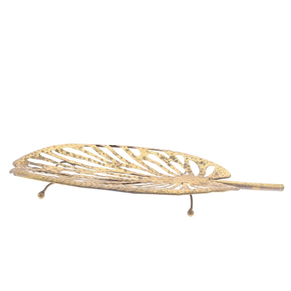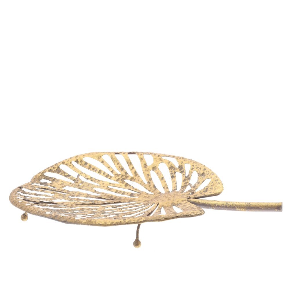 Декоративное блюдо из металла в форме изящного листа монстеры. Ажурные прорези повторяют прожилки, а фактура с легкой чеканкой и покрытие под состаренную латунь придают предмету благородный, теплый оттенок. Изделие стоит на миниатюрных ножках и имеет вытянутый «черешок»-ручку. Подходит для хранения украшений, ключей, часов, сухоцветов, ароматических свечей или упакованных сладостей. Органично смотрится на консоли, журнальном столике или туалетном столике, подчеркивая экостиль, бохо и классическую обстановку. Прочный металл легко протирается и становится выразительным акцентом интерьера.