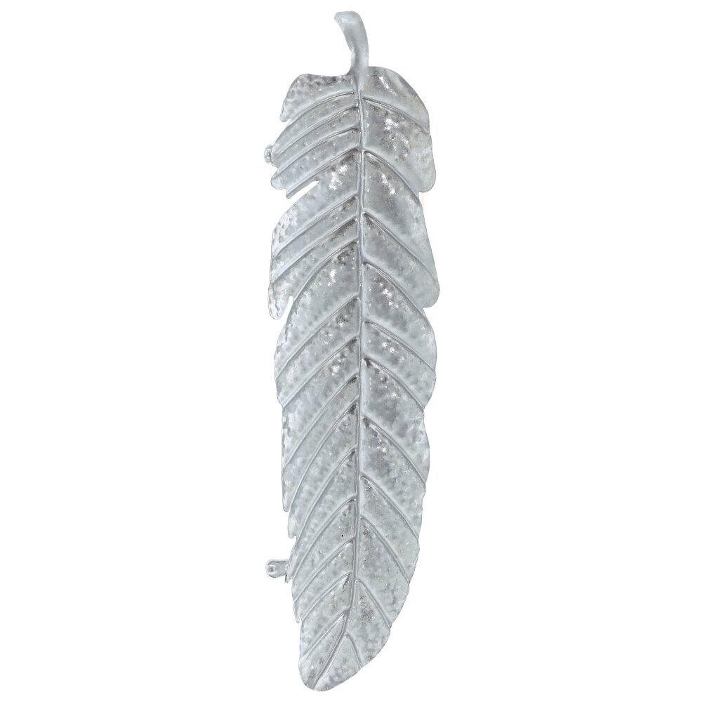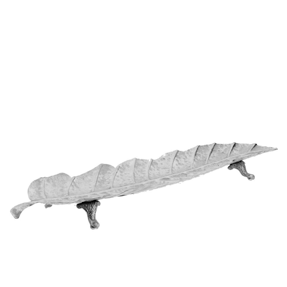 Декоративное блюдо из металла, выполненное в форме вытянутого листа. Рельефные диагональные прожилки и легкая «мятая» текстура создают эффект ручной ковки. Серебристый оттенок с деликатной патиной красиво играет на свету. Края слегка приподняты, кончик листа изящно загнут. Изделие стоит на трех миниатюрных фигурных ножках с растительным орнаментом, что придает устойчивость и легкость. Подходит для подачи фруктов, конфет и канапе или как акцентное декоративное блюдо на консоли, журнальном столике, в прихожей для мелочей и украшений. Органично впишется в классические и современные интерьеры.