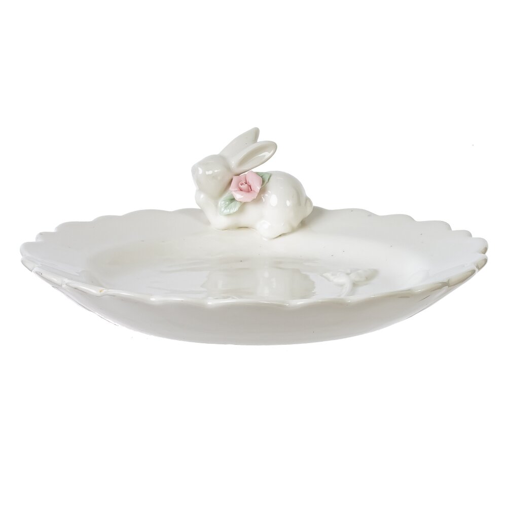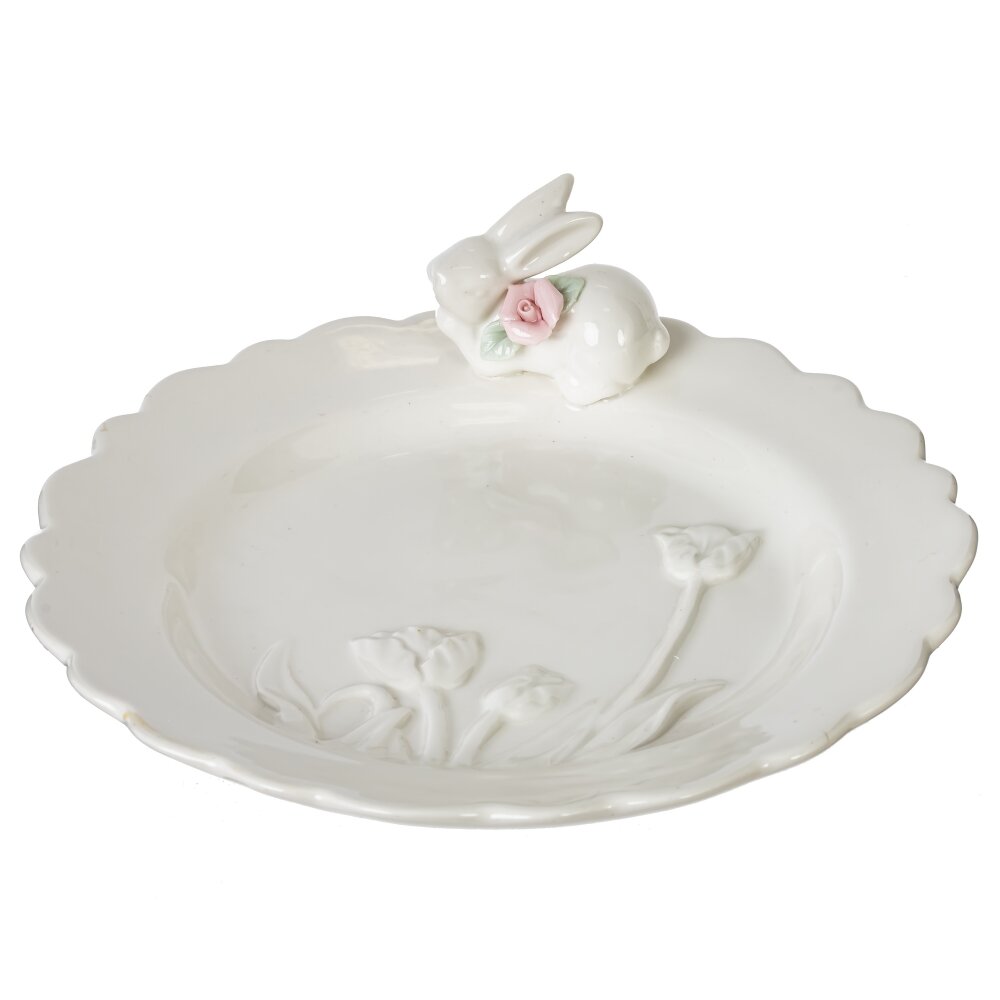 Нежное пасхальное блюдо из белого фарфора станет изюминкой праздничного стола. Края оформлены волнистым бортиком, а внутренняя поверхность украшена рельефными весенними цветами. Особое очарование придаёт фигурка милого зайчика с розовой розой на шейке – традиционный символ Пасхи. Блюдо подойдёт для куличей, пасхи, пирожных, конфет и фруктов, создавая атмосферу уюта и праздника. Качественный фарфор легко моется, устойчив к ежедневному использованию и надолго сохраняет безупречный внешний вид. Прекрасный вариант как для домашнего использования, так и в качестве оригинального подарка к Пасхе.