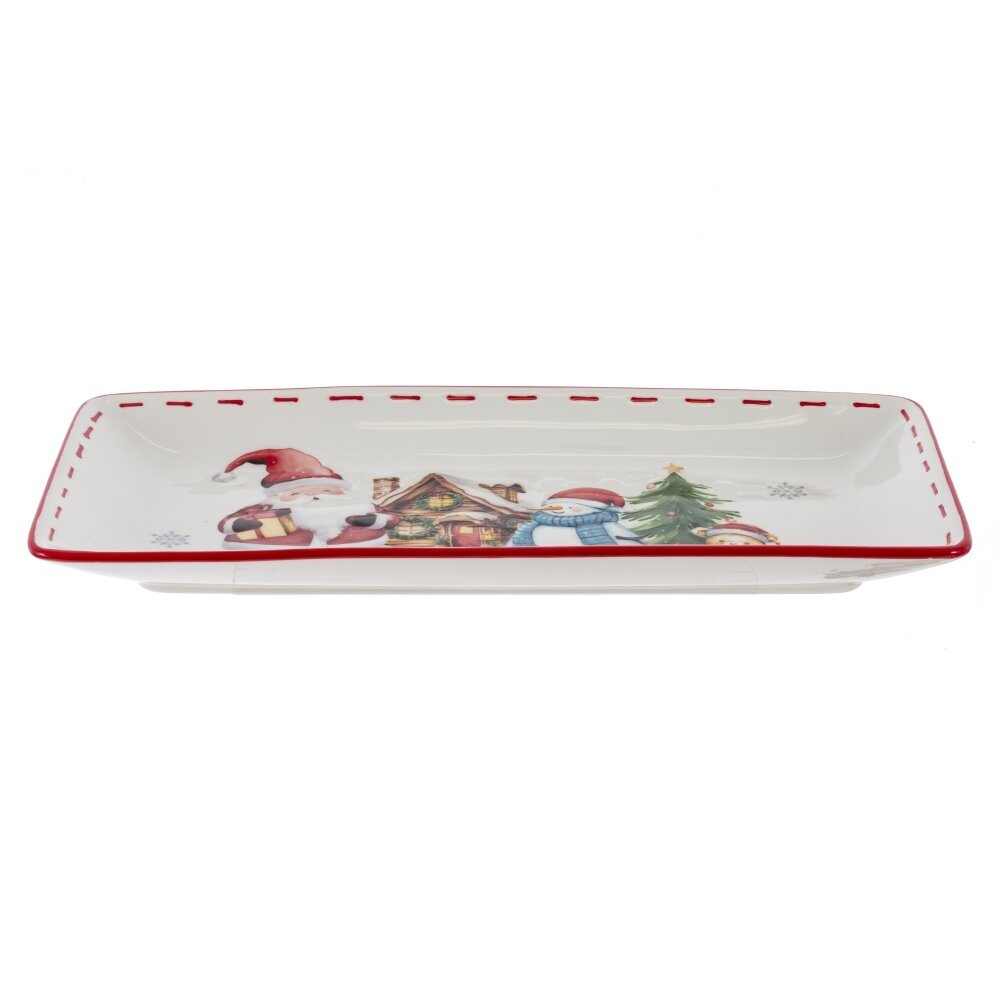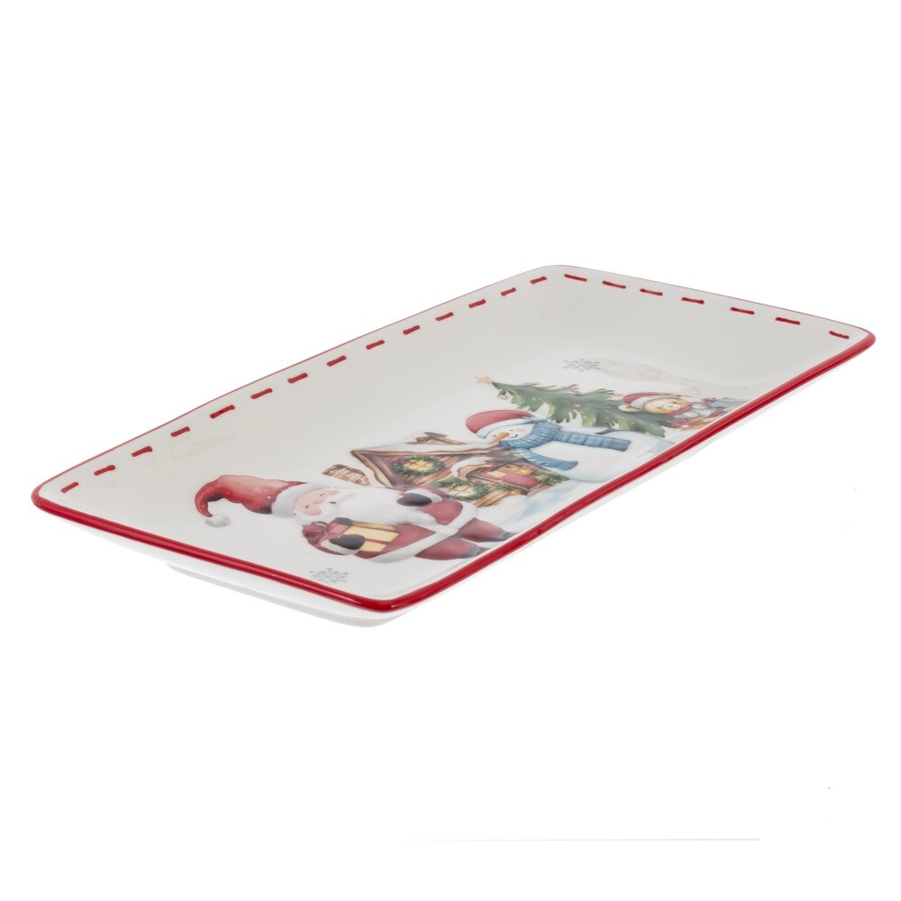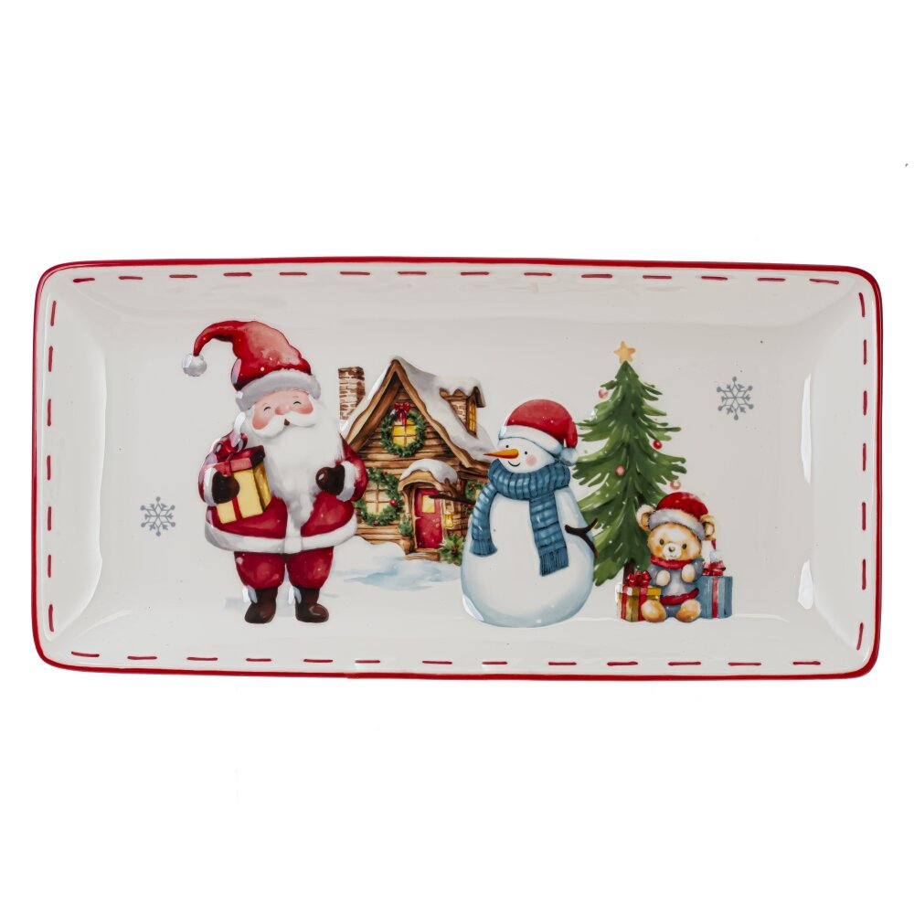 Прямоугольное блюдо "Веселый Новый год" из керамики с изображением Санты, Снеговика и Мишки на фоне домика и елки – идеальный элемент для создания праздничного настроения. Этот предмет яркий и стильный, имеет красную пунктирную кайму, как у всей серии посуды"Веселый Новый год", а также красивую упаковку, что делает его отличным выбором в качестве подарка. Продукция сертифицирована и абсолютно безопасна для контакта с пищевыми продуктами.