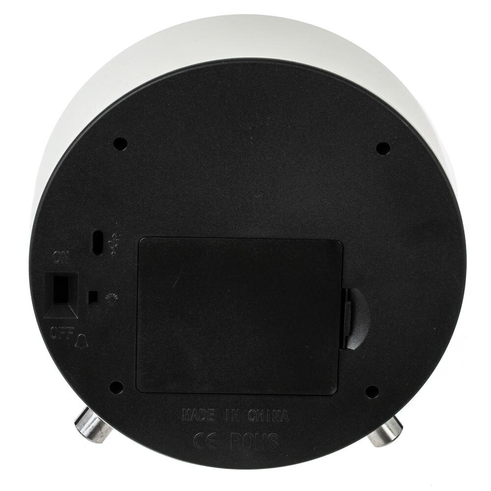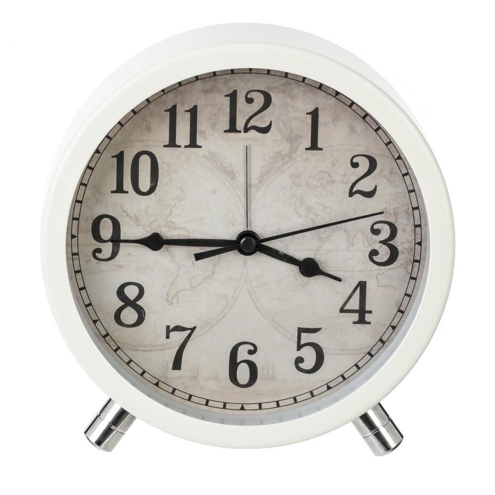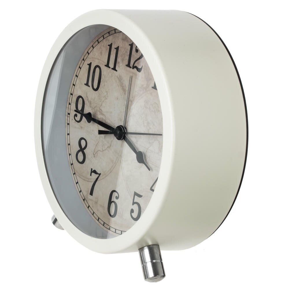 Стильный настольный будильник в классическом круглом корпусе . Белый цвет и лаконичный дизайн гармонично сочетаются с винтажным циферблатом с крупными чёрными цифрами, что обеспечивает отличную читаемость времени. Устойчивые металлические ножки позволяют надёжно разместить будильник на тумбе или рабочем столе. Модель работает от одной батарейки типа AA (в комплект не входит), не требует подключения к сети и удобна для использования дома, в офисе или в поездках. Идеально подойдёт тем, кто ценит простоту, функциональность и уютный ретро?акцент в интерьере. Диаметр циферблата 14 см