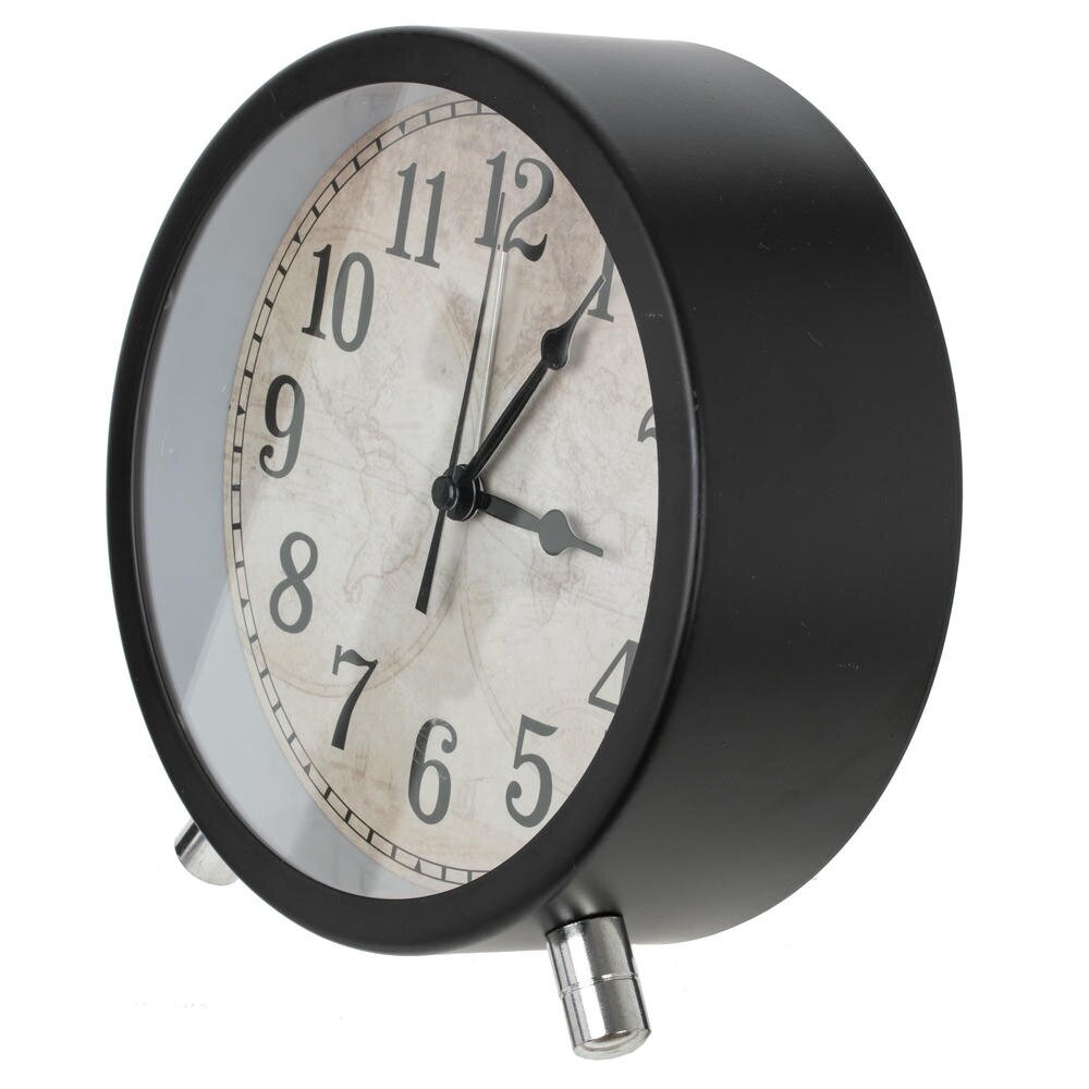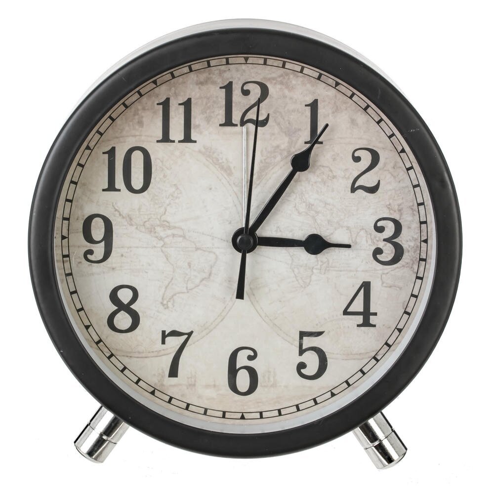 Стильный настольный будильник в классическом круглом корпусе . Черный цвет и лаконичный дизайн гармонично сочетаются с винтажным циферблатом с крупными чёрными цифрами, что обеспечивает отличную читаемость времени. Устойчивые металлические ножки позволяют надёжно разместить будильник на тумбе или рабочем столе. Модель работает от одной батарейки типа AA (в комплект не входит), не требует подключения к сети и удобна для использования дома, в офисе или в поездках. Идеально подойдёт тем, кто ценит простоту, функциональность и уютный ретро?акцент в интерьере. Диаметр циферблата 14 см