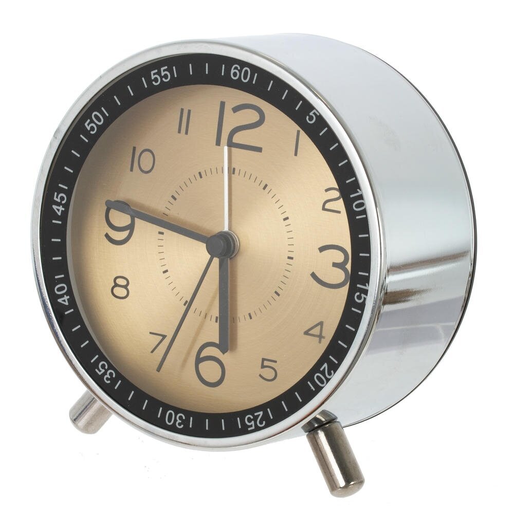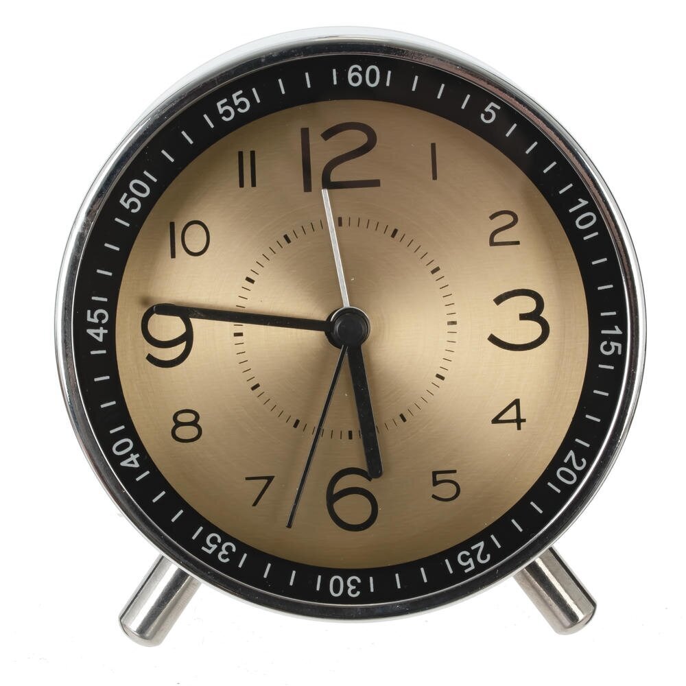 Стильный настольный будильник с лаконичным круглым корпусом станет ярким акцентом на прикроватной тумбе, рабочем столе или полке. Корпус из прочного металла с хромированным покрытием гармонично сочетается с золотистым циферблатом под прозрачным стеклом. Крупные арабские цифры и контрастные стрелки обеспечивают хорошую читаемость времени даже издалека. Надёжные полимерные элементы защищают внутренний механизм и продлевают срок службы изделия. Будильник работает от двух батареек типа АА (в комплект не входят), не требует подключения к сети и удобен для использования дома, в офисе или в поездках. Компактный размер, устойчивые ножки и современный ретро?дизайн делают его практичным и стильным аксессуаром для любого интерьера. Диаметр циферблата 8,5 см.