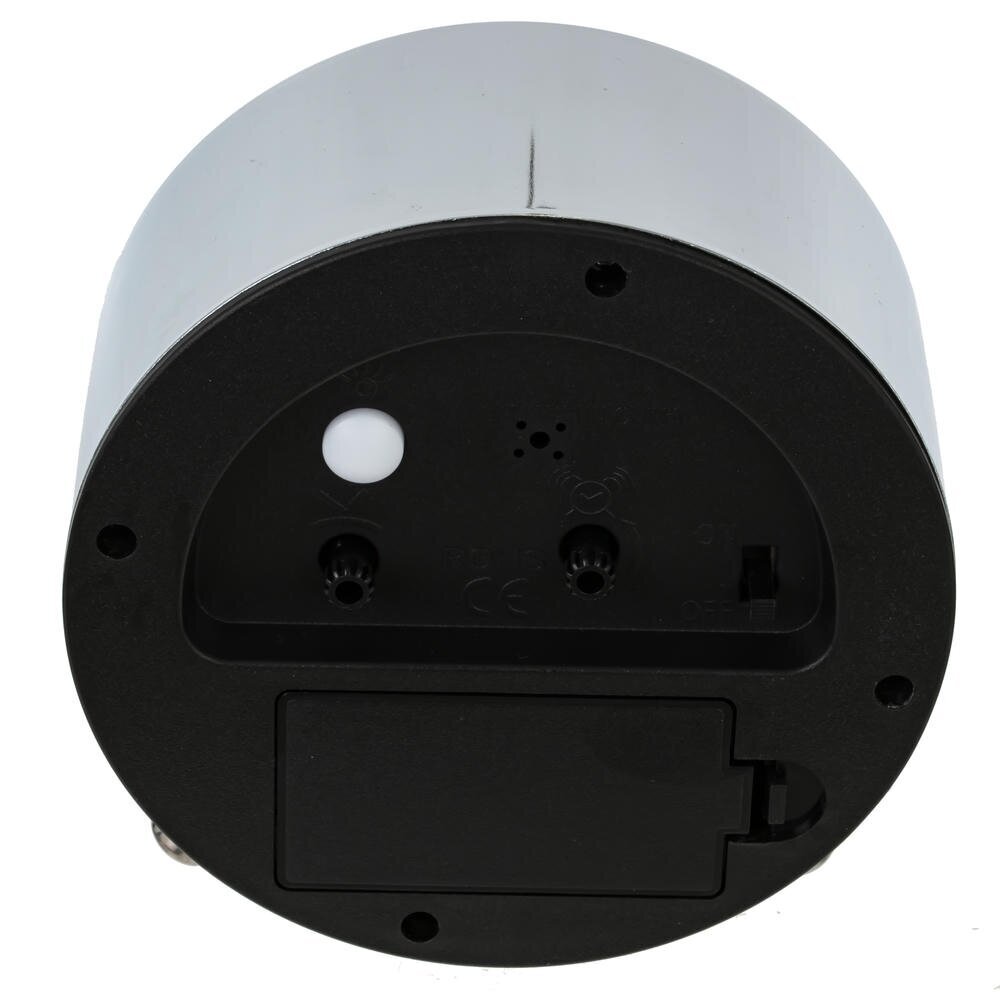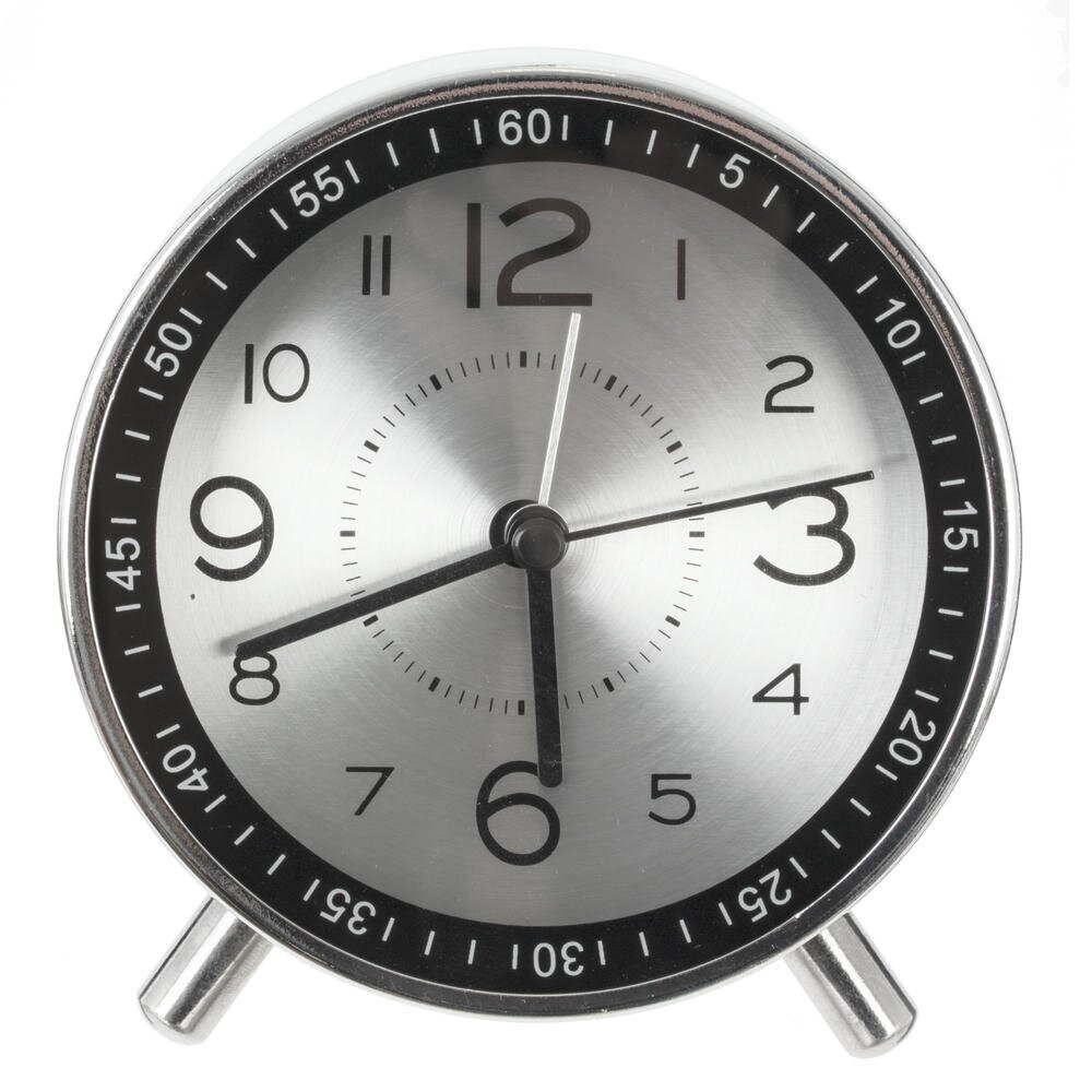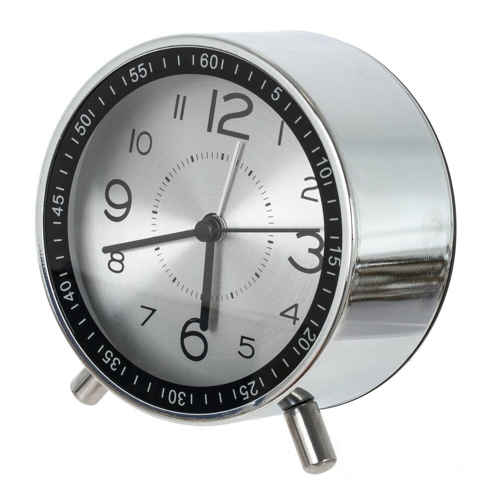 Стильный настольный будильник с лаконичным круглым корпусом станет ярким акцентом на прикроватной тумбе, рабочем столе или полке. Корпус из прочного металла с хромированным покрытием гармонично сочетается с серебряным циферблатом под прозрачным стеклом. Крупные арабские цифры и контрастные стрелки обеспечивают хорошую читаемость времени даже издалека. Надёжные полимерные элементы защищают внутренний механизм и продлевают срок службы изделия. Будильник работает от двух батареек типа АА (в комплект не входят), не требует подключения к сети и удобен для использования дома, в офисе или в поездках. Компактный размер, устойчивые ножки и современный ретро?дизайн делают его практичным и стильным аксессуаром для любого интерьера. Диаметр циферблата 8,5 см.