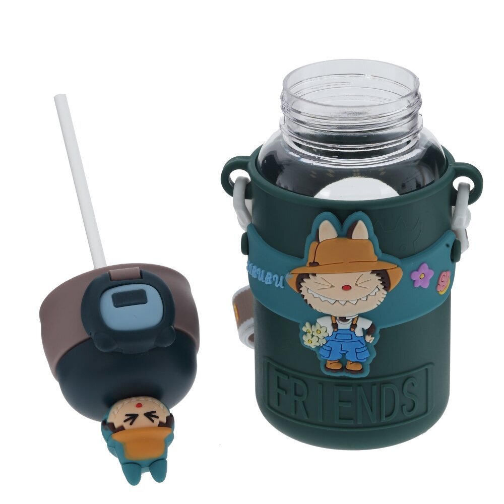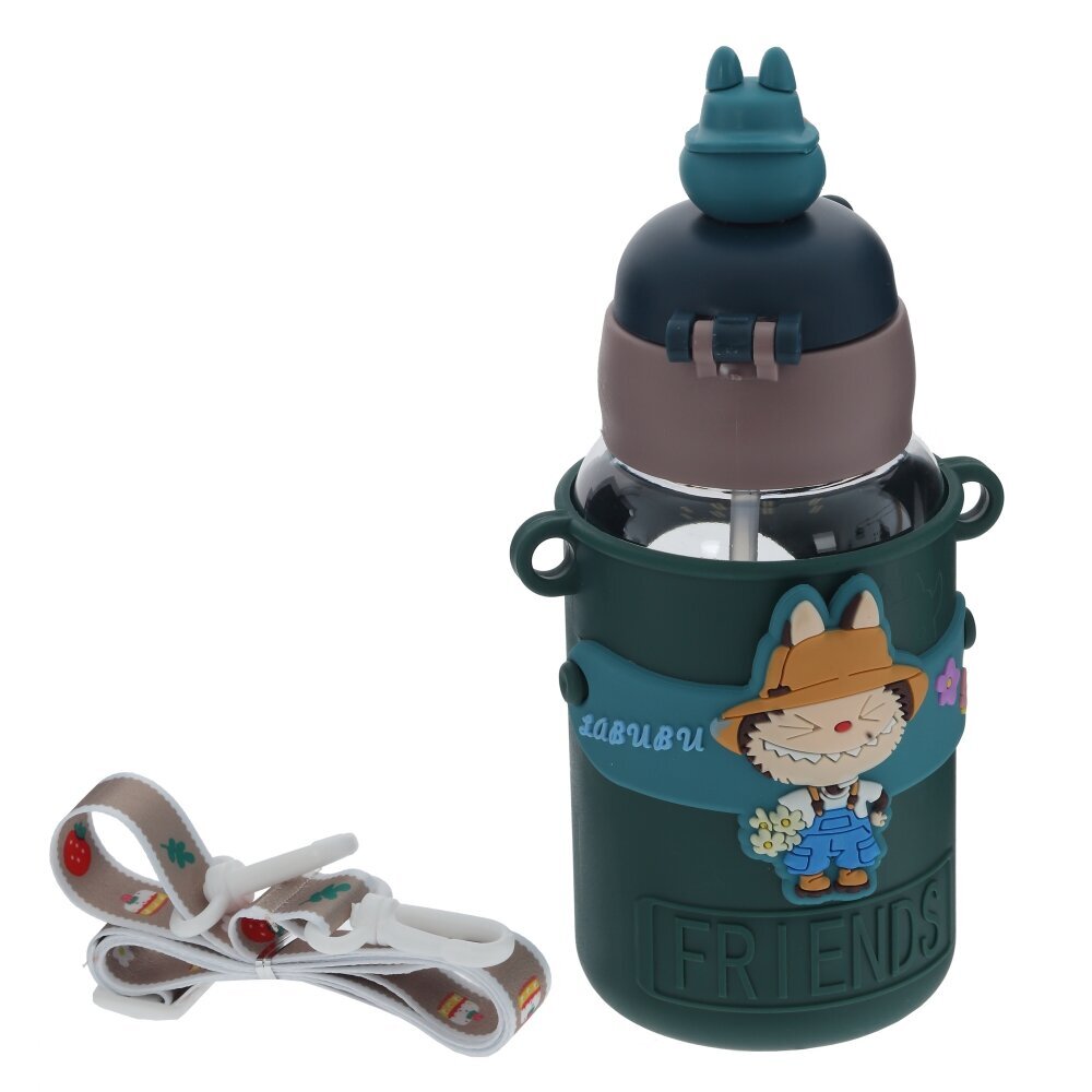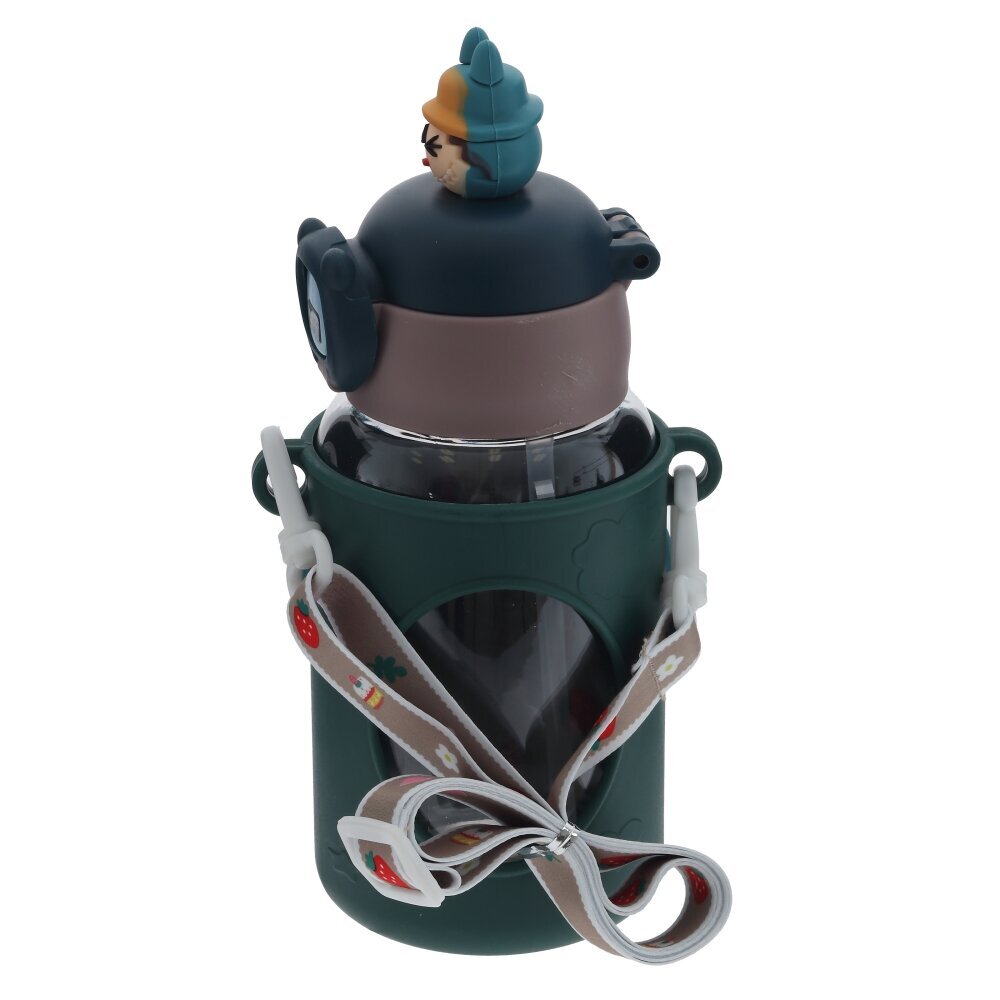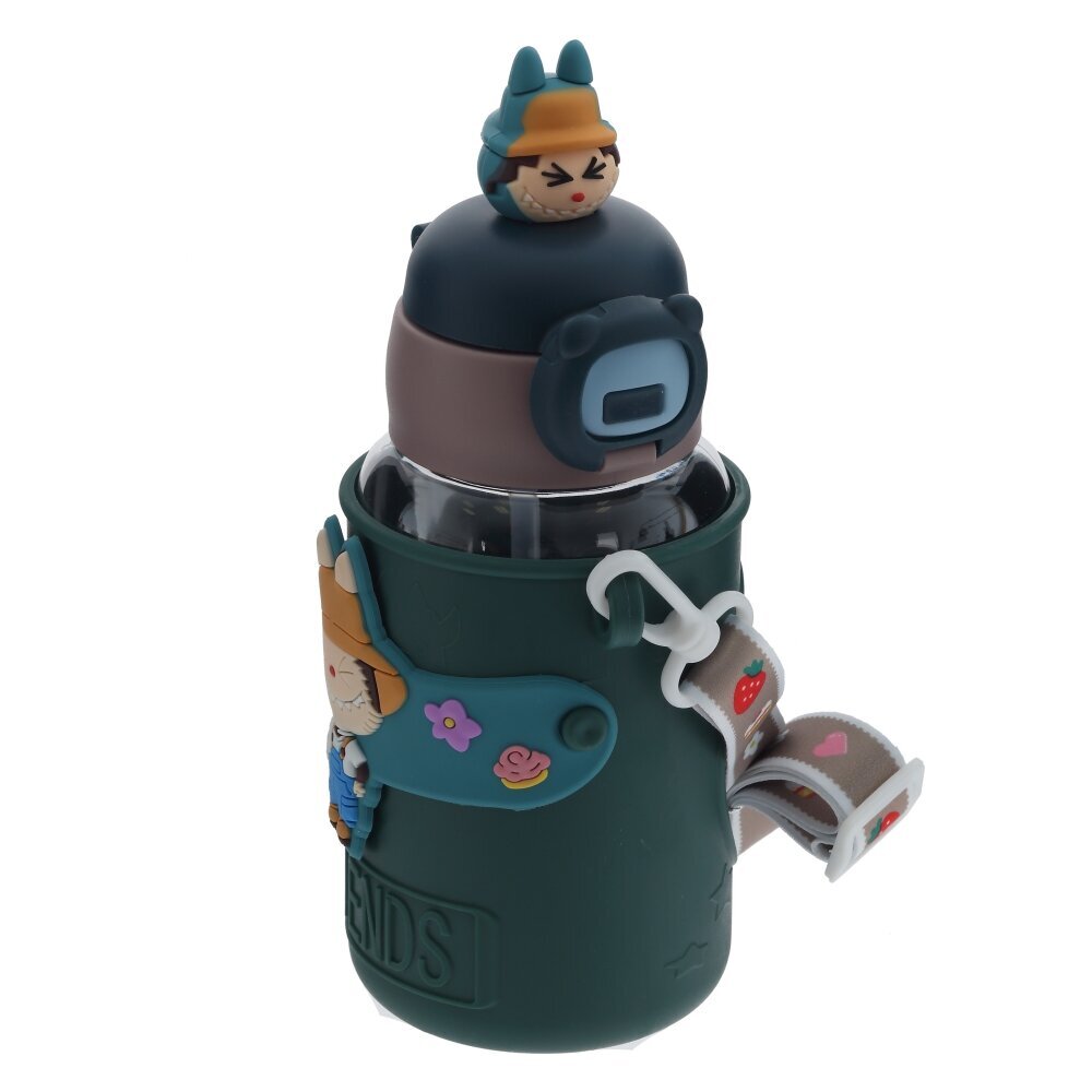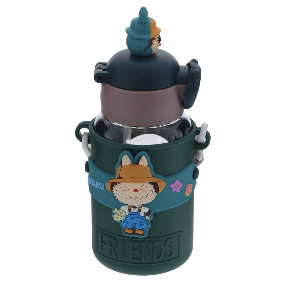 Яркая бутылка для напитков объёмом 590 мл из полимерных материалов. Прозрачный корпус позволяет контролировать остаток жидкости, сверху — удобная откидная крышка с трубочкой, защищающая от проливаний и пыли. Мягкий чехол глубоко?зелёного цвета украшен объёмным фигурным рисунком, который понравится ребёнку и делает бутылку нескользкой в руке. Надёжный ремешок позволяет носить её на плече или крепить к рюкзаку. Подходит для воды, сока и других прохладных напитков на прогулке, в саду, школе или поездке. Лёгкая, прочная и простая в уходе – оптимальный вариант для ежедневного использования.