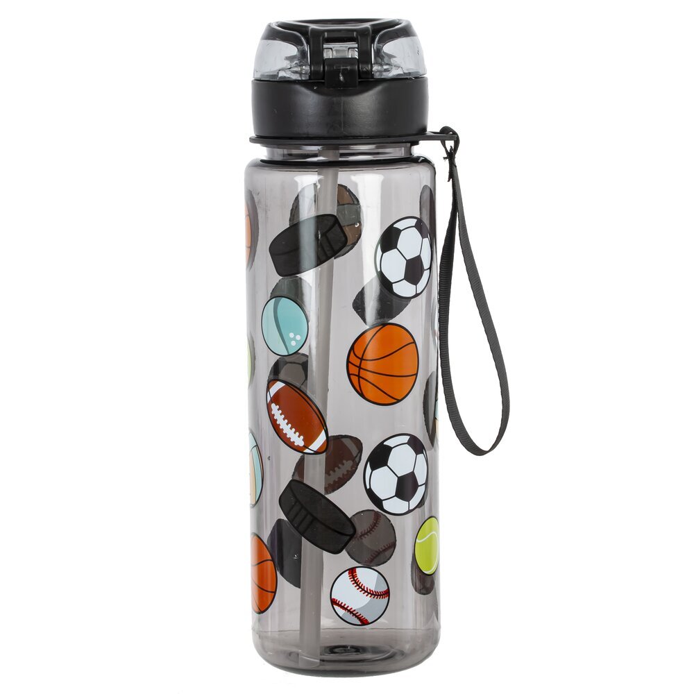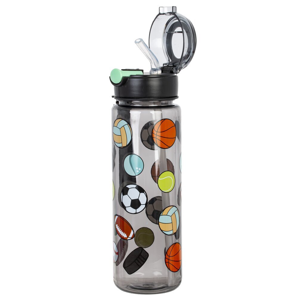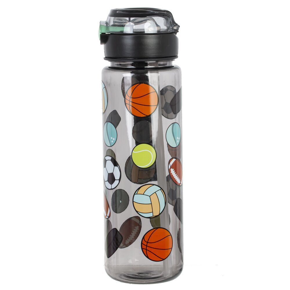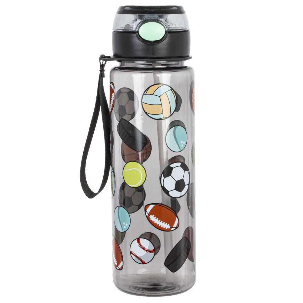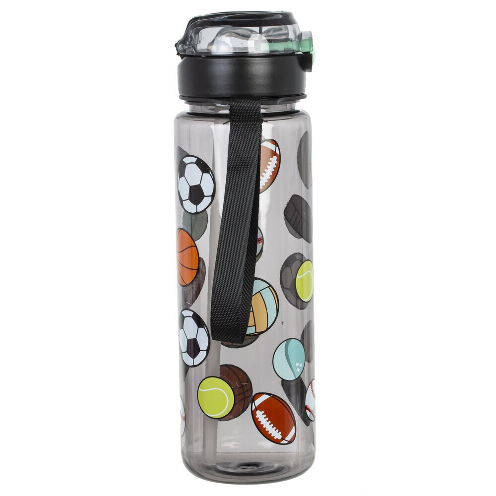 Бутылка объемом 650 мл, выполненная из прочных полимерных материалов. Её прозрачный корпус украшен яркими рисунками различных спортивных мячей, среди которых можно заметить футбольный, баскетбольный, теннисный, бейсбольный и другие. Черная крышка снабжена герметичной защелкой и удобной прозрачной крышкой, что предотвращает проливание жидкости во время использования. Кроме того, к бутылке прикреплен удобный черный ремешок для переноски, который позволяет брать её с собой на тренировки, прогулки или в школу. Такая бутылка идеально подойдет для активных детей и подростков, ведущих спортивный образ жизни, а также станет отличным аксессуаром во время занятий спортом или отдыха на природе.