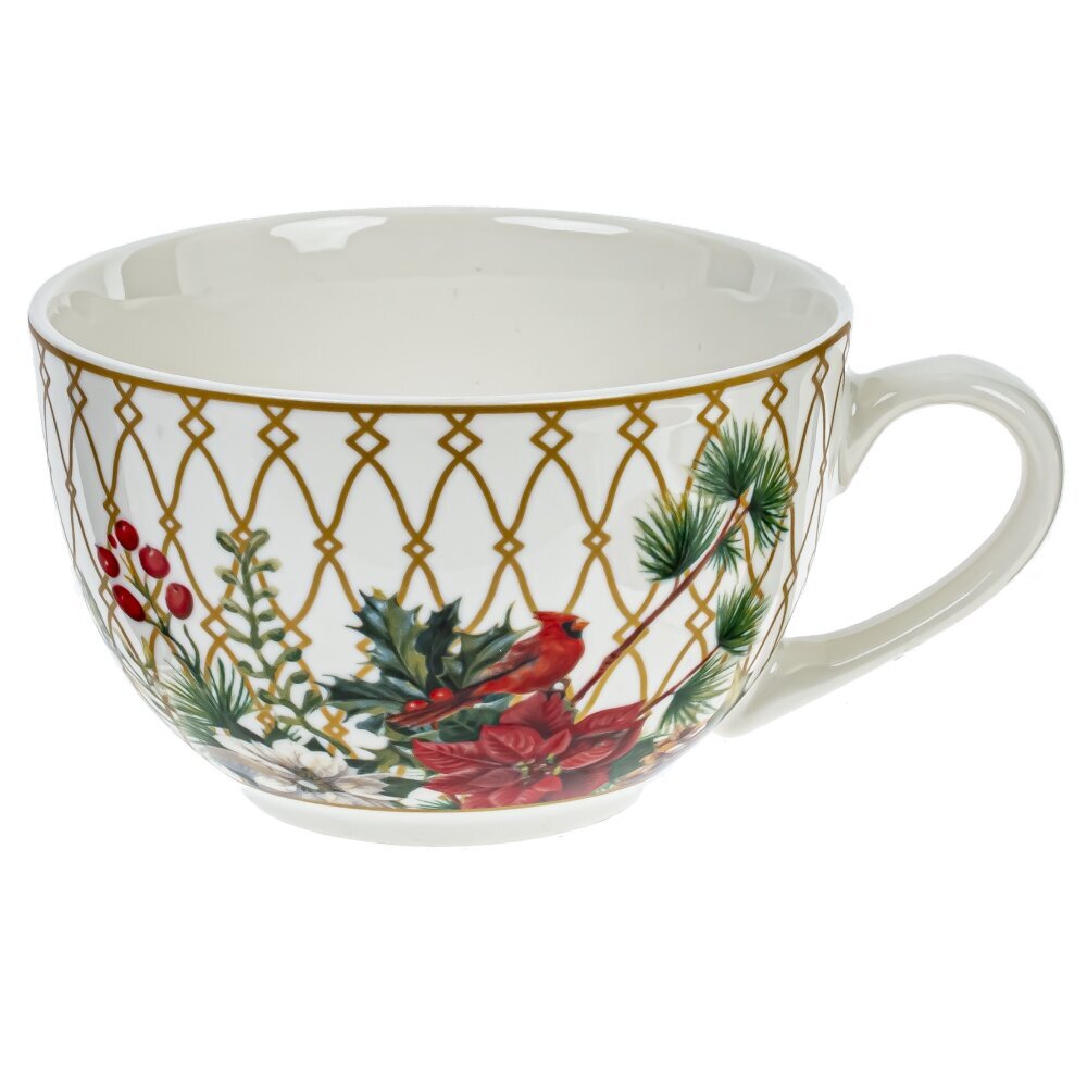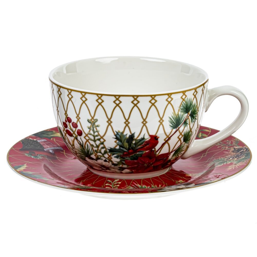 Чашка с блюдцем "Зимнее волшебство" — это элегантный набор, выполненный из тонкостенного фарфора. Диаметр блюдца составляет 15,5 см, оно украшено красной каймой и изысканным золотым решетчатым узором. Нежные новогодние ветви, шишки, яркие цветы пуансеттии создают восхитительную праздничную атмосферу. Чашка объемом 250 мл выполнена в белом цвете, она также декорирована тем же золотым узором и рождественскими элементами, включая птичку красного кардинала, который считается символом Рождества. Уникальный дизайн этой чайной пары делает её идеальным аксессуаром для праздничной сервировки стола и превосходным подарком для ценителей красоты и утонченного стиля.