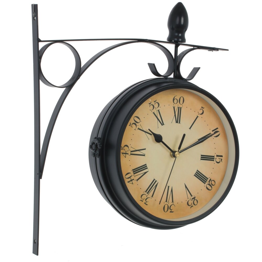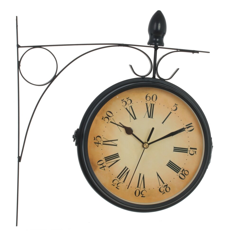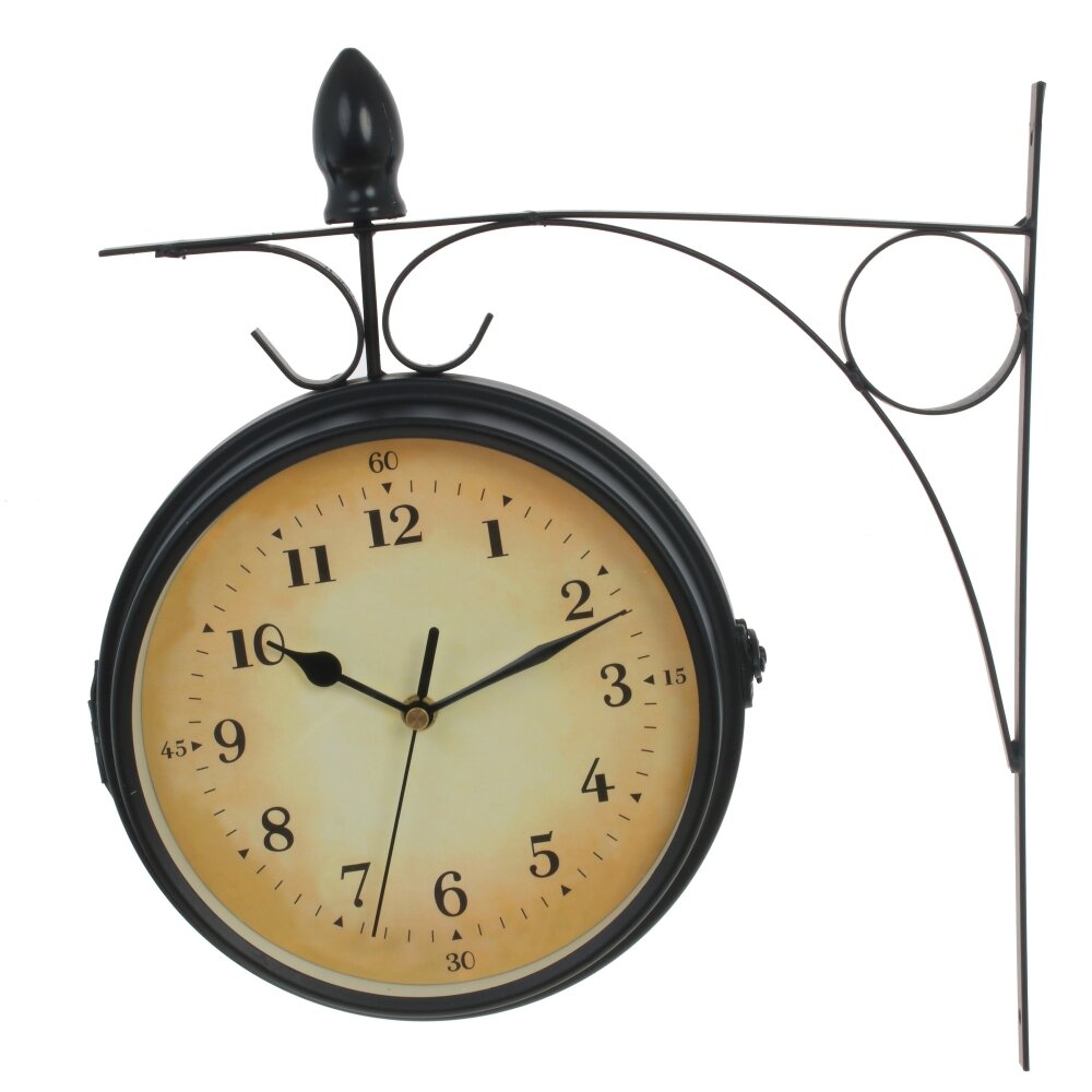 Круглые настенные часы двухсторонние, диаметром 17 см, имеет три стрелки - часовая, минутная, секундная, кварцевый механизм. С одной стороны цифры - арабские, с другой - римские. Крепятся на стену с помощью кронштейна. Работают от 2 батареек типа "АА" ( в комплект не входят).