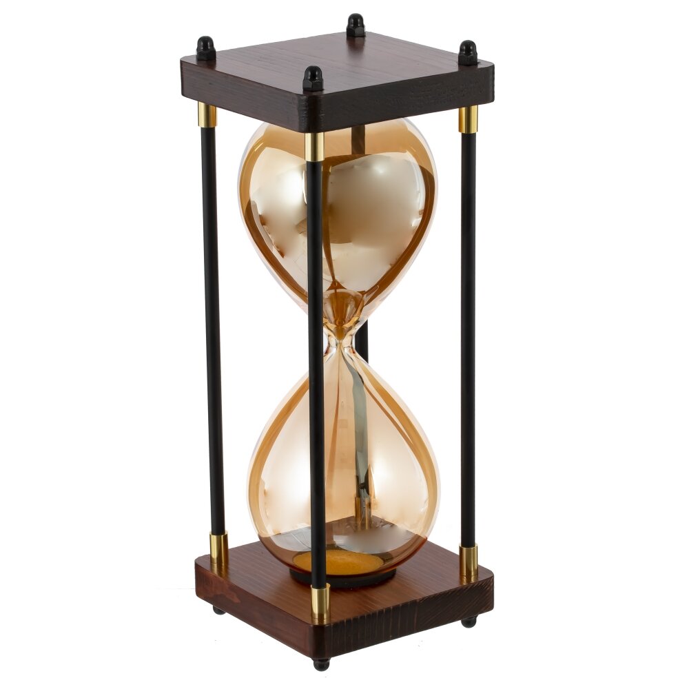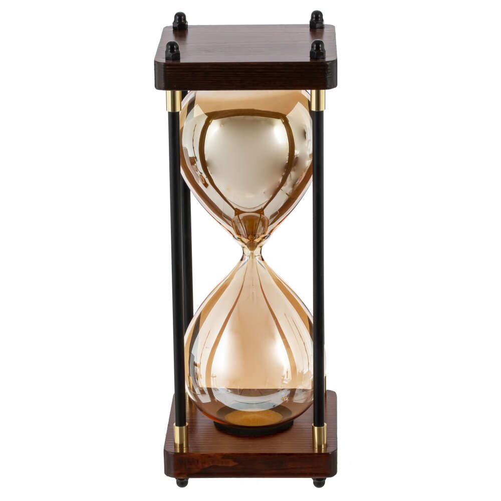 Эти песочные часы на 30 минут — элегантный интерьерный аксессуар. Верхняя и нижняя платформы выполнены из темного дерева с красивой текстурой, соединены четырьмя прочными металлическими стойками с золотистыми акцентами. Колба из толстого стекла теплого янтарного оттенка плавно пропускает мелкий песок, создавая спокойный визуальный ритм времени. Конструкция устойчива, с аккуратными защитными накладками в углах. Часы уместны на рабочем столе, в кабинете, гостиной или кухне; помогут отслеживать перерывы, медитации, учебные сессии и чаепитие. Материалы: дерево, стекло, песок, металл. Рекомендуется переворачивать мягко и протирать сухой салфеткой.