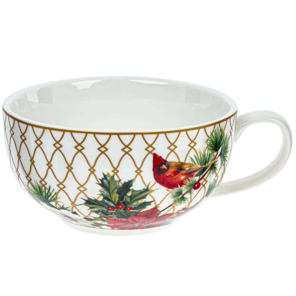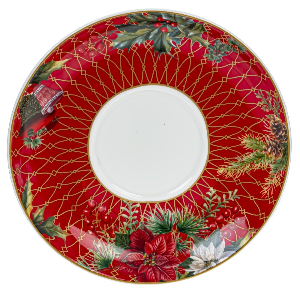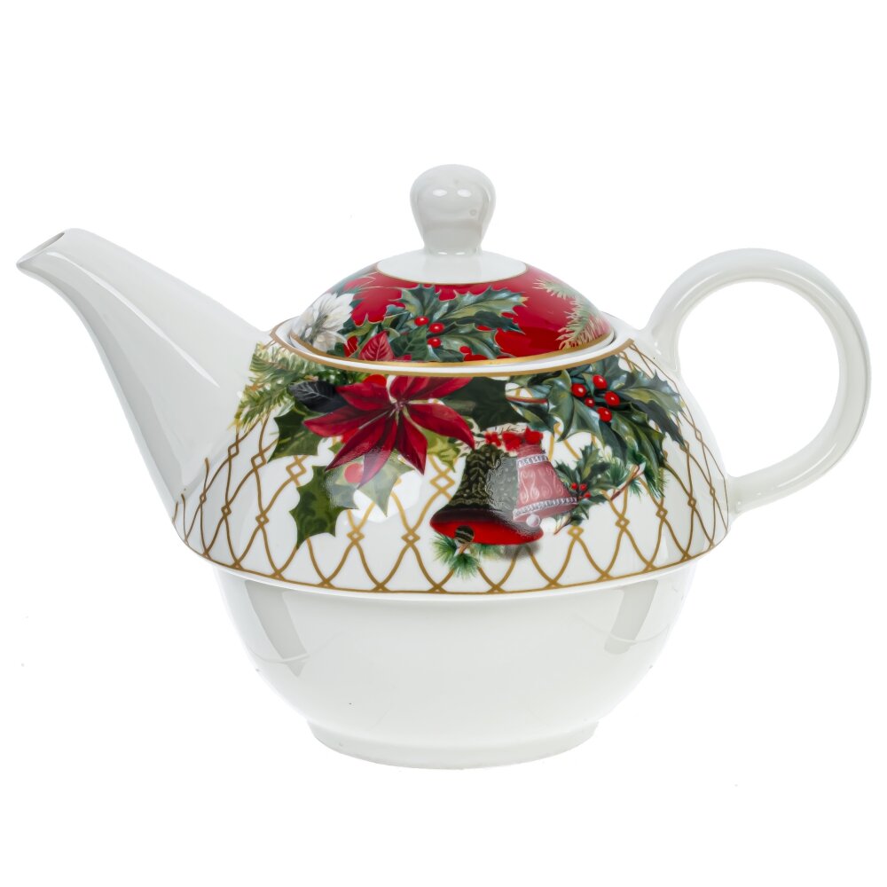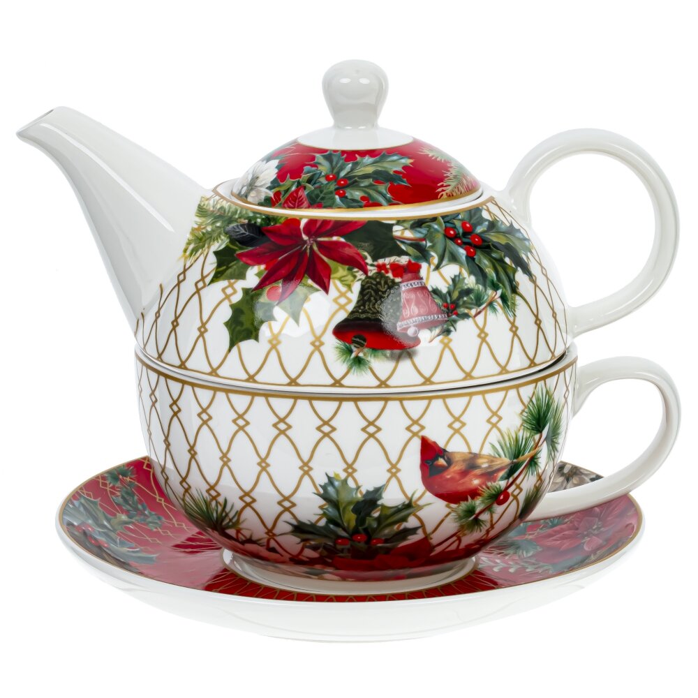 Чайная пара "Зимнее волшебство" включает в себя элегантный чайник вместимостью 400 мл и чашку с блюдцем. Блюдце диаметром 15,5 см привлекает внимание своим декором: красной каймой и изысканным золотым решетчатым узором. Нежные новогодние ветви, шишки и яркие цветы пуансеттии создают атмосферу волшебного праздника. Чашка, объемом 300 мл, выполнена в белом цвете и также украшена этим великолепным золотым узором, дополненным рождественскими мотивами, в числе которых изображение птички красного кардинала, символизирующей Рождество. Чайник гармонично сочетается с чашкой и блюдцем благодаря общему дизайну и цветовой гамме, а также удобно размещается сверху чашки. Уникальный дизайн и тонкостенный фарфор данной чайной пары делают её идеальным элементом для праздничной сервировки стола, а также восхитительным подарком для тех, кто ценит красоту и утонченный стиль.