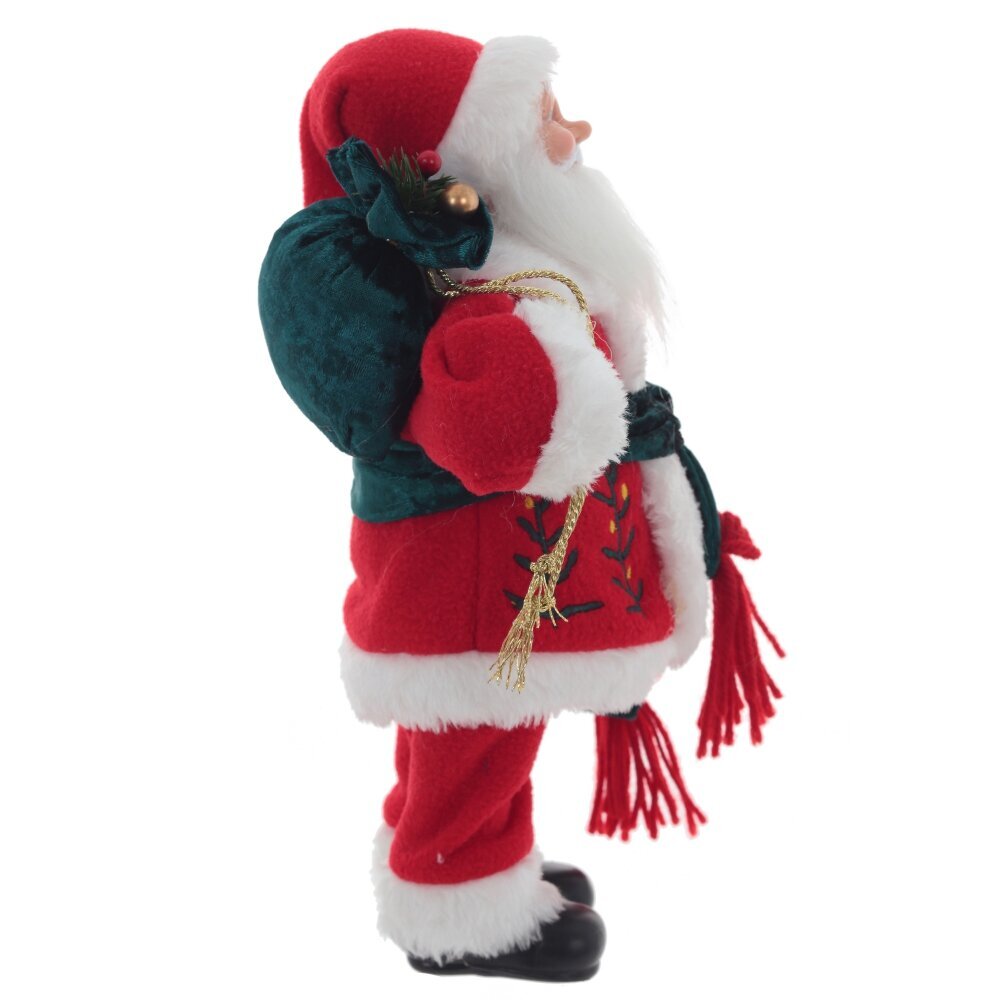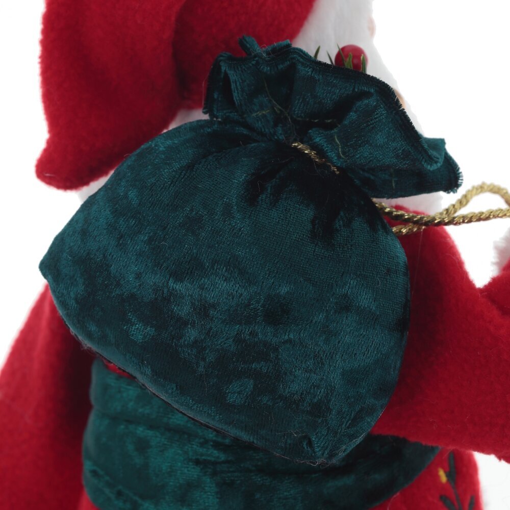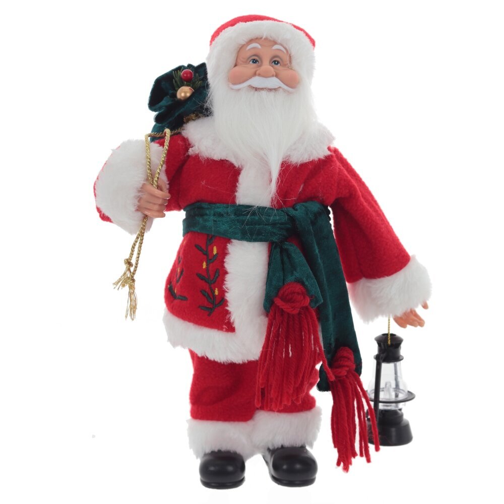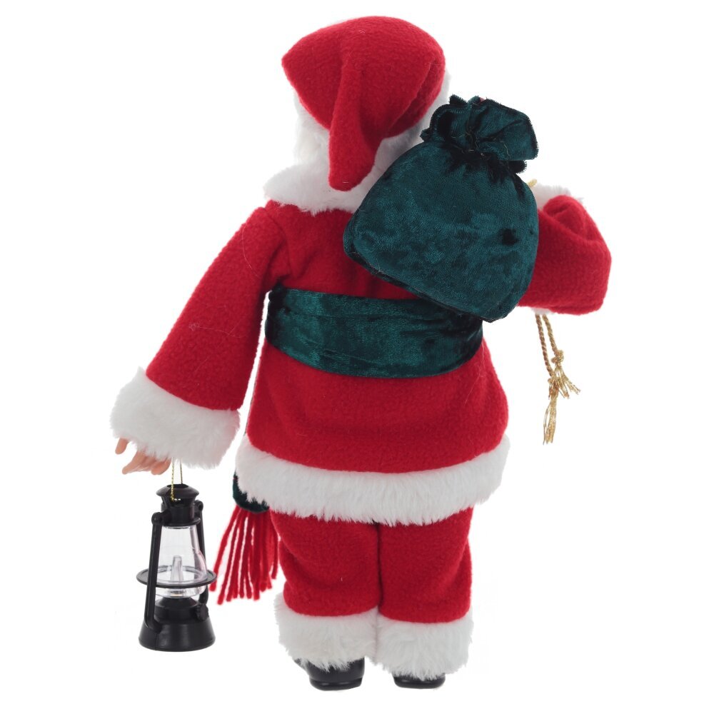 Декоративный Дед Мороз высотой 30 см - очаровательный символ новогоднего праздника! Он одет в традиционный красный костюм с белым мехом, украшенный вышивкой и широким зеленым бархатным поясом. Мешок с подарками перекликается с поясом, создавая гармоничный образ. Руки и лицо из полимерных материалов придают Деду Морозу выразительность и живость. В его руке фонарь, который создает волшебную атмосферу праздника.