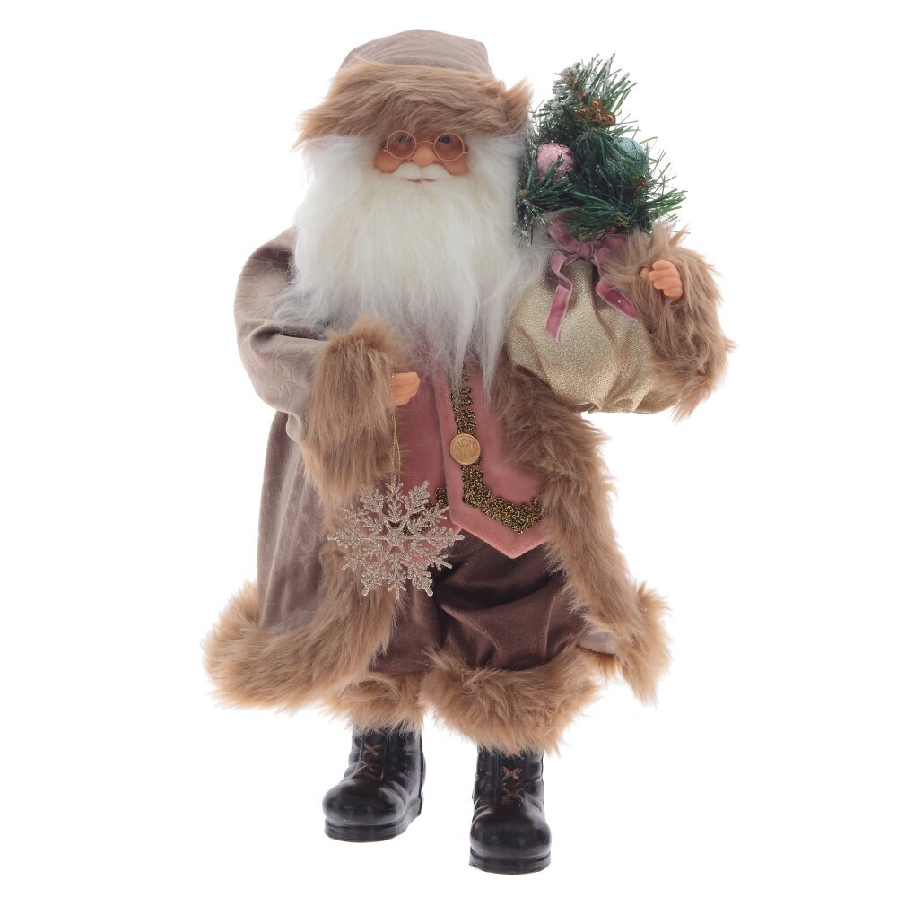 Бежевое пальто и колпак, отделанные мягким мехом, создают ощущение тепла и уюта. Розовый бархатный жилет добавляет образу изысканности и праздничного настроения. Роскошная белая борода и добрый взгляд Деда Мороза вызывают чувство доверия и предвкушения чуда.