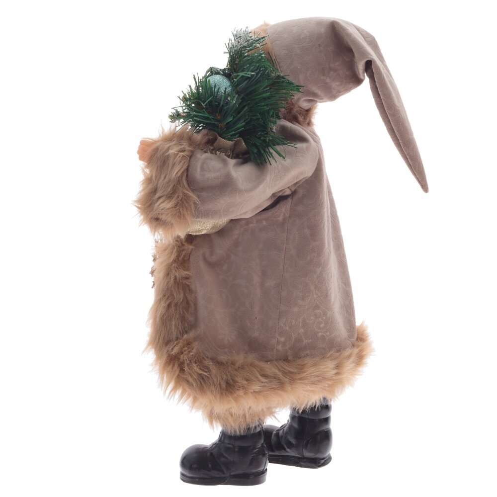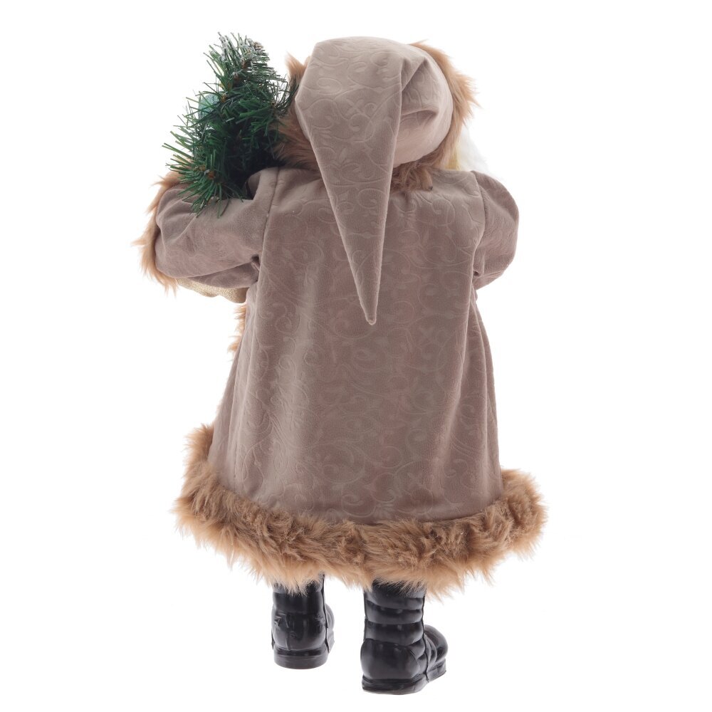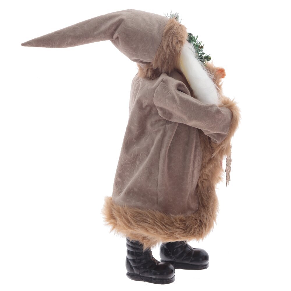 В его руках - маленькая елочка, аккуратно уложенная в мешок, словно готовая к вручению в качестве подарка. Голова, руки и сапоги, изготовленные из полимерных материалов, детализированы до мельчайших подробностей, подчеркивая мастерство работы.