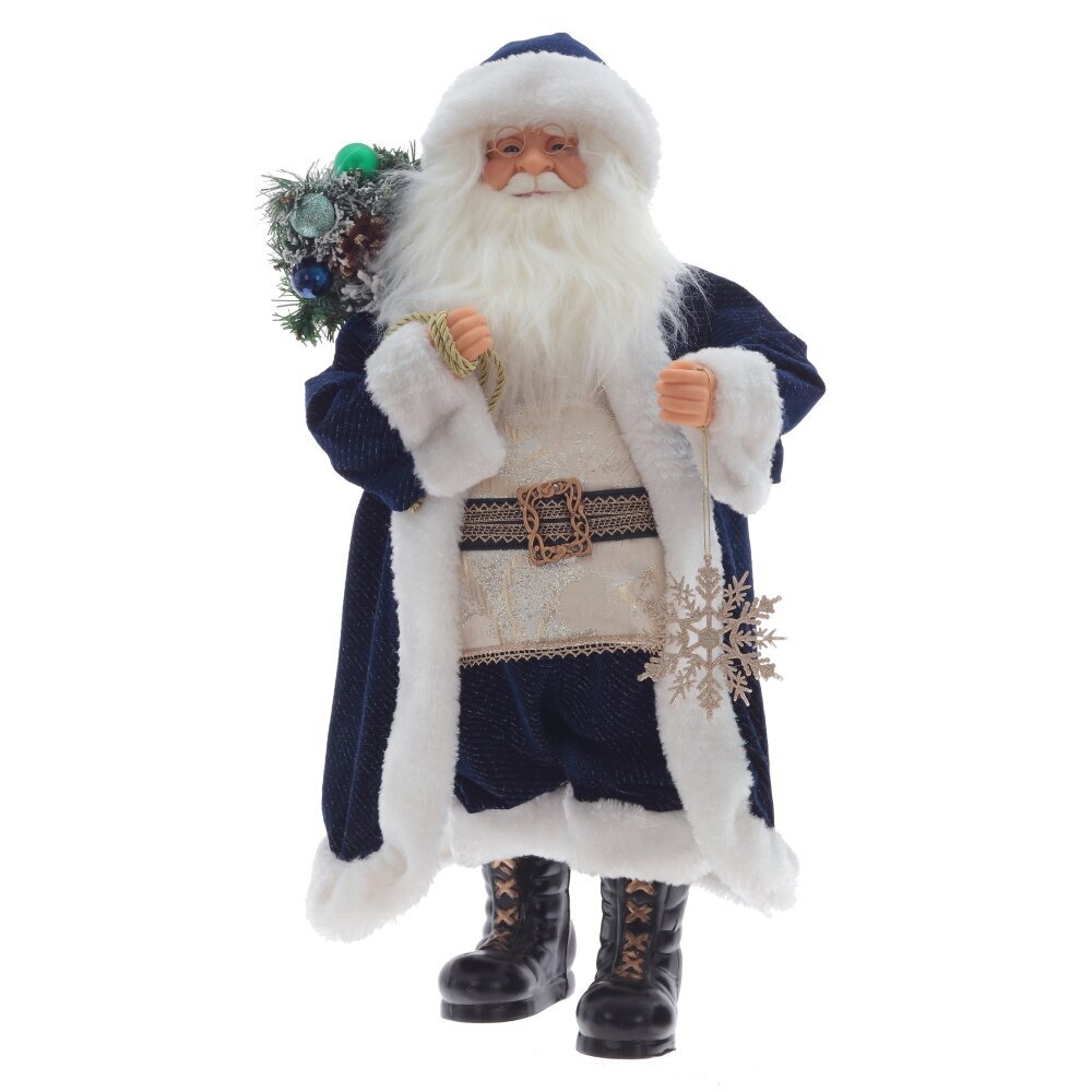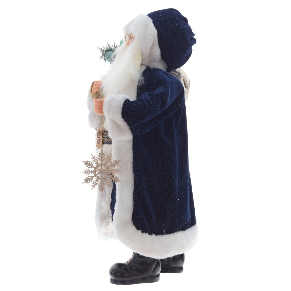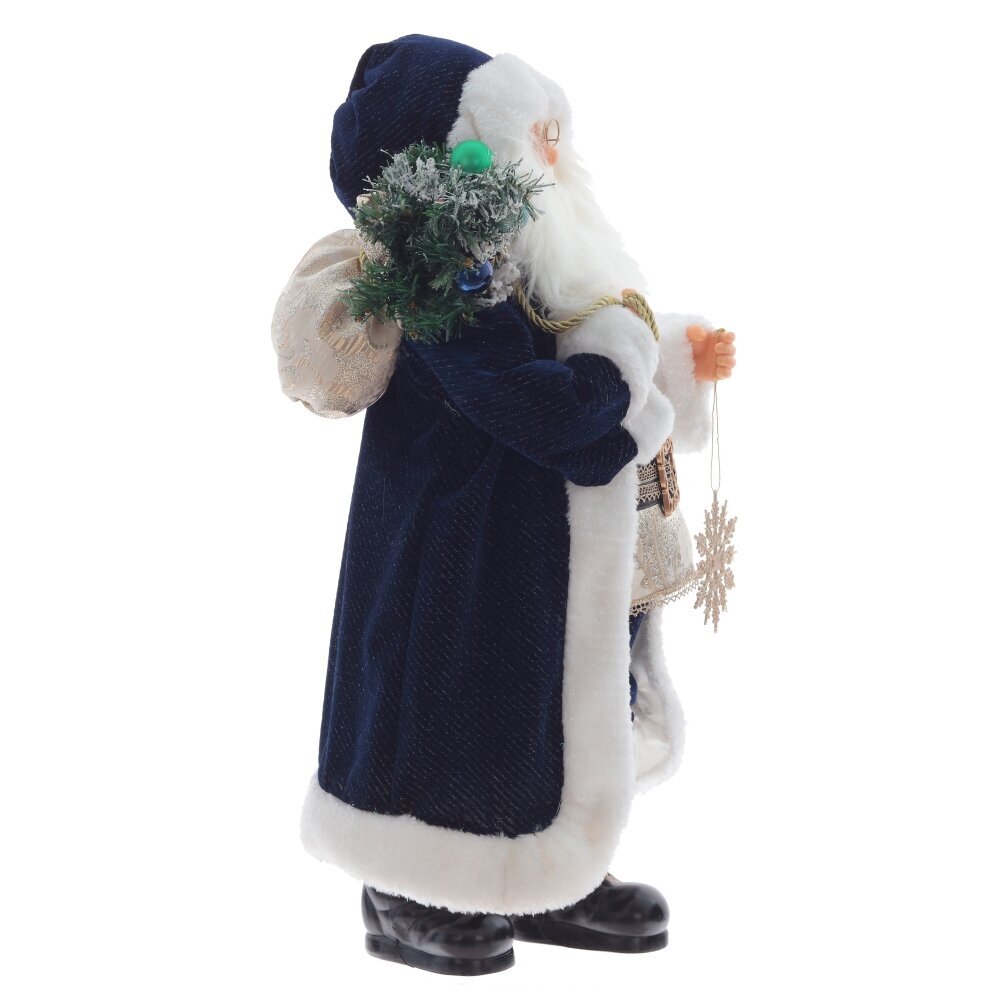 Очаровательный Дед Мороз с изысканным костюмом из синего вельвета, белой меховой отделкой и золотой сорочкой выглядит потрясающе. Аксессуары - мешок для подарков и снежинка - добавляют праздничного настроения. Реалистичное лицо, руки и сапоги из полимерных материалов делают образ живым и выразительным. Эта кукла станет великолепным украшением интерьера и прекрасным подарком к празднику. Отлично дополнит новогоднюю атмосферу в доме.