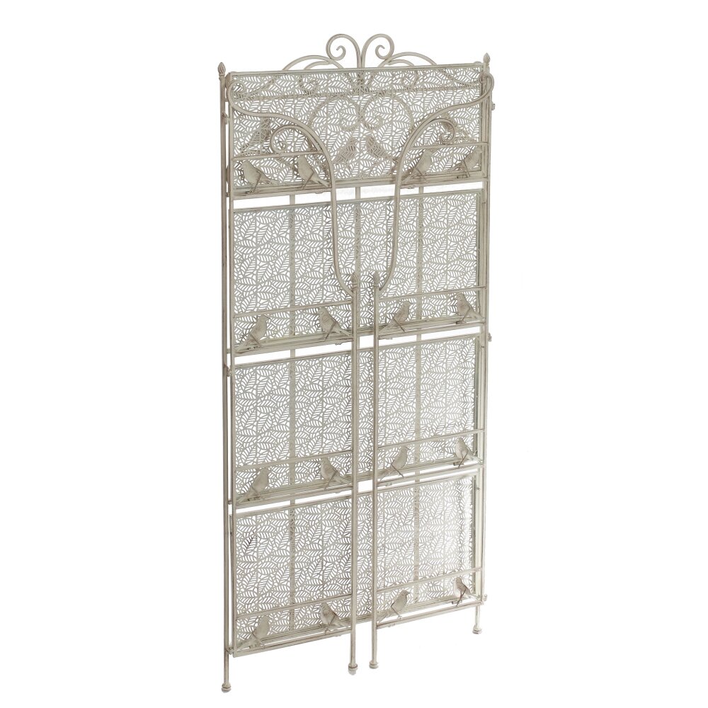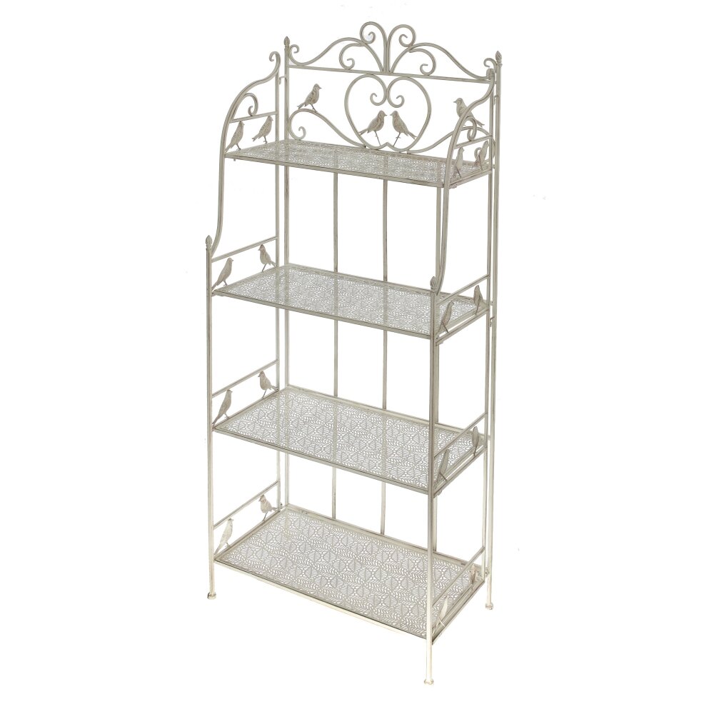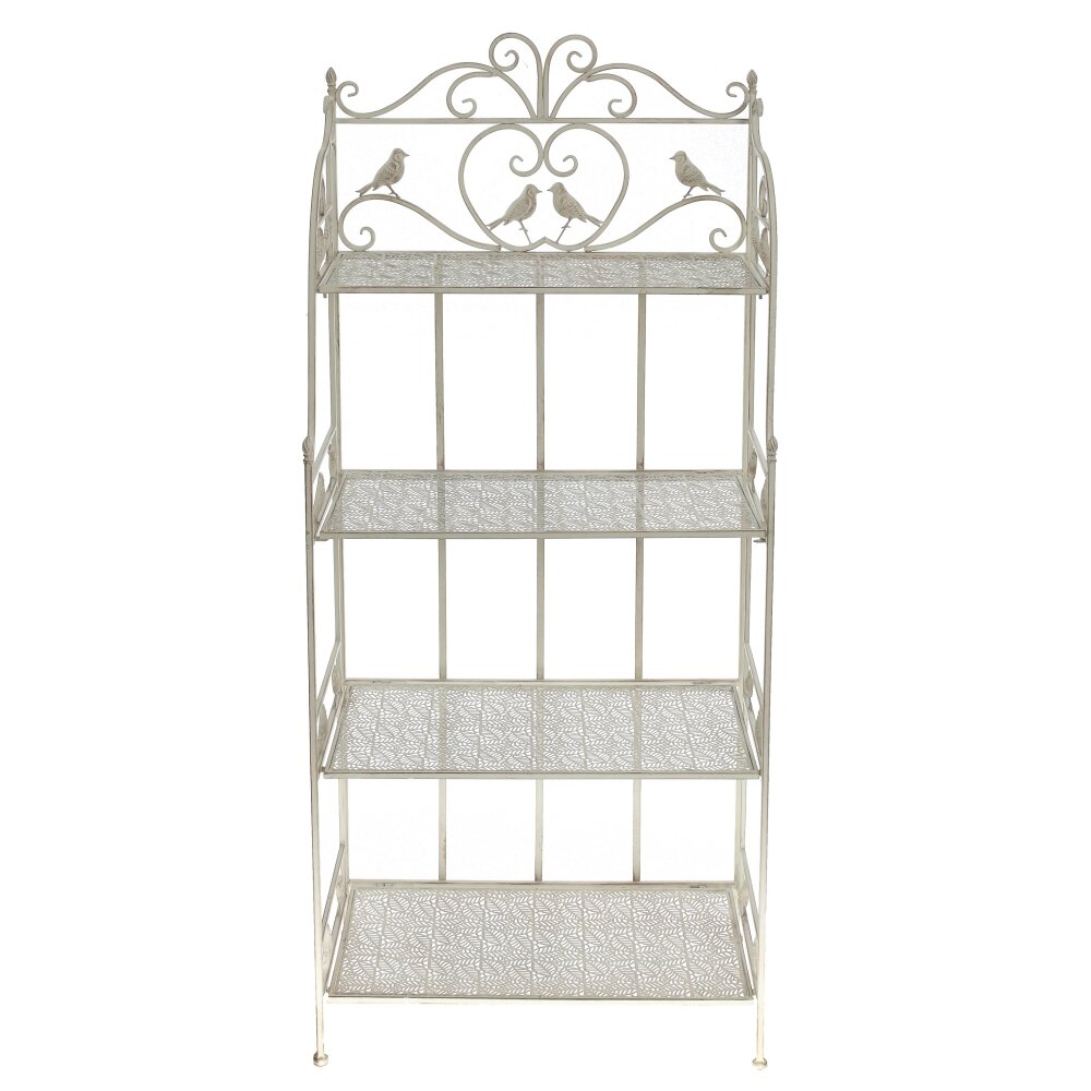 Изящная металлическая этажерка в светлом оттенке станет стильным акцентом вашего интерьера. Конструкция включает четыре просторные полки с аккуратным ажурным узором, который придаёт изделию лёгкость и воздушность. Боковые стойки и верхняя часть украшены фигурками птичек и плавными завитками в духе прованса, что делает этажерку не только функциональной, но и декоративной деталью. Надёжная металлическая рама обеспечивает устойчивость и долговечность, полки выдерживают книги, цветочные горшки, сувениры и другие предметы декора. Этажерка гармонично впишется в гостиную, спальню, прихожую, на лоджию или в загородный дом, подчёркивая уют и индивидуальность пространства.