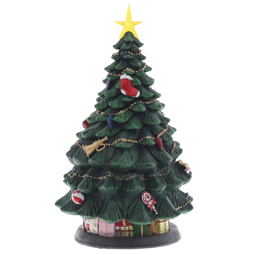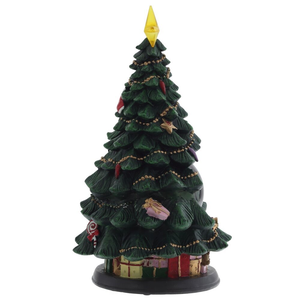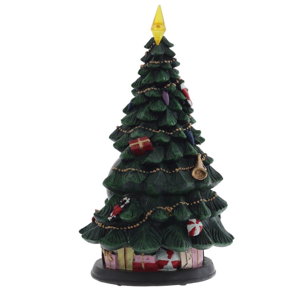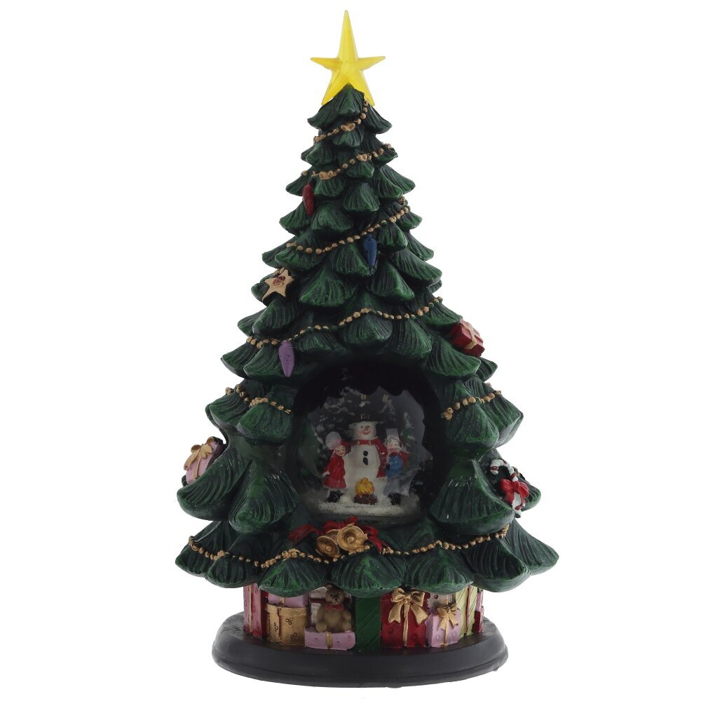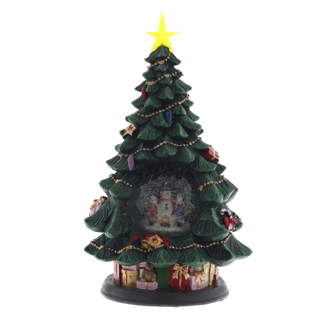 Декоративная фигурка в стеклянном шаре "Елка и Снеговик" - удивительное сочетание праздничного настроения и красоты. Внутри большой рождественской ели из полистоуна украшенной сверкающими деталями и яркой звездой, поставлен стеклянный шар диаметром 10 см. Внутри шара представлена сцена со Снеговиком и детьми. Шар заполнен глицериновой жидкостью с мелким белым глиттером, имитирующим снег. Рычаг на дне активирует цветную подсветку, вьюгу и восемь гармоничных новогодних мелодий. Сувенир имеет два режима работы - с музыкой и без нее. Для работы необходимо три батарейки типа АА, которые не включены в комплект. Погрузитесь в атмосферу чудес и волшебства с этим загадочным сувениром!