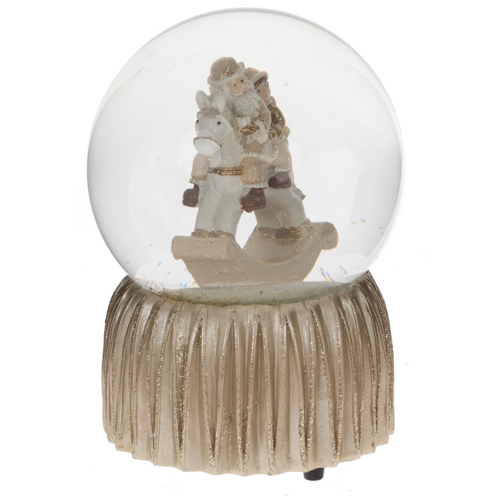 Этот музыкальный стеклянный шар "Дед Мороз на лошадке" звучит как великолепное новогоднее украшение! Шар диаметром 9 см, расположенный на золотой подставке из полистоуна, наполнен глицериновой жидкостью. В центре шара фигурка Деда Мороза с маленькой девочкой на лошадке-качалке придает композиции особое очарование. Если потрясти шар, то мелкий золотой глиттер внутри создаст особую атмосферу волшебства.