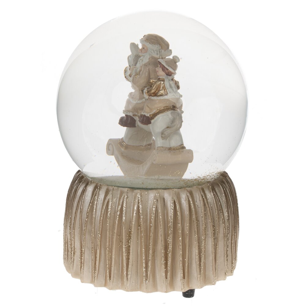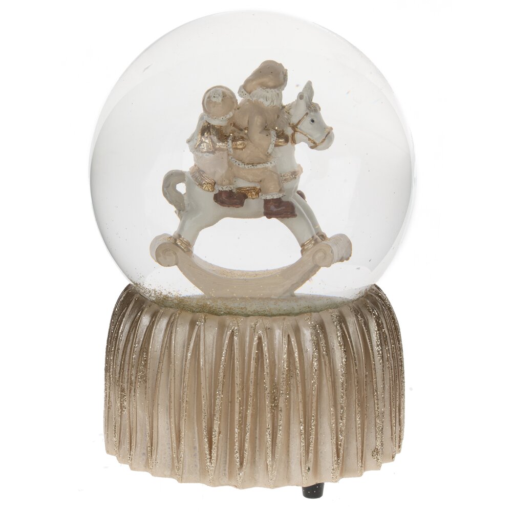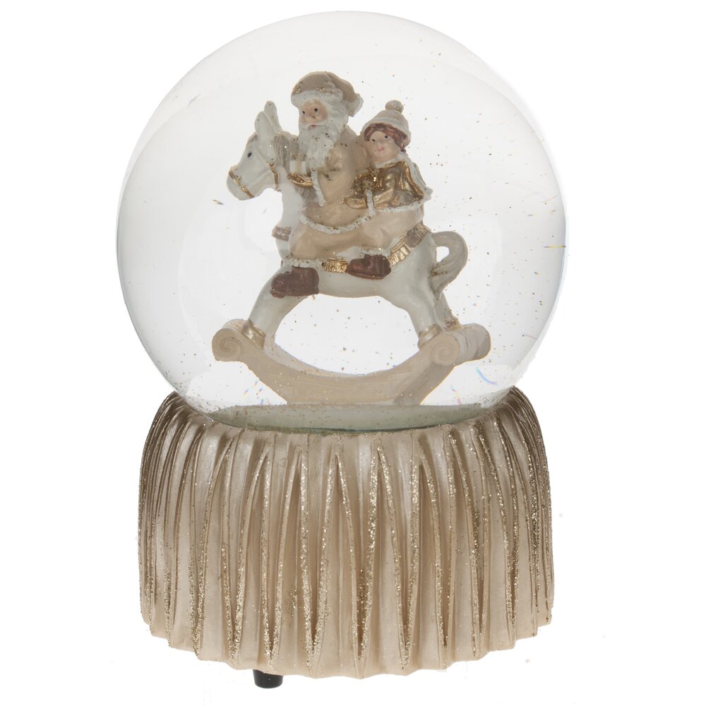 Этот музыкальный стеклянный шар "Дед Мороз на лошадке" звучит как великолепное новогоднее украшение! Шар диаметром 9 см, расположенный на золотой подставке из полистоуна, наполнен глицериновой жидкостью. В центре шара фигурка Деда Мороза с маленькой девочкой на лошадке-качалке придает композиции особое очарование. Если потрясти шар, то мелкий золотой глиттер внутри создаст особую атмосферу волшебства.