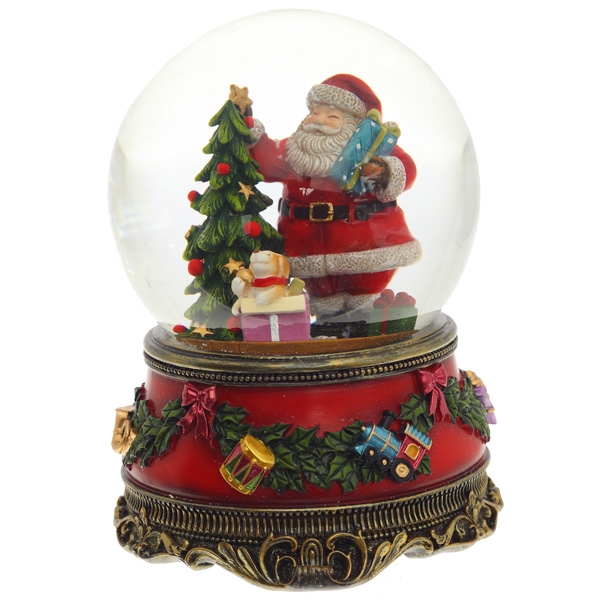 Фигурка новогодняя в стеклянном шаре, диаметр - 10 см. Шар заполнен водой с белыми хлопьями, имитурующем снег при встряхивании. Фигурка Деда Мороза и подставка изготовлены из полистоуна с любовью к деталям. Заводной ключ на дне подставки воспроизводит мелодию "В лесу родилась елочка", даря праздничное настроение.