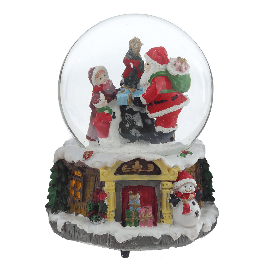 Новогодний снежный шар с фигуркой Деда Мороза с детьми внутри подарит вам праздничное настроение и радость. Завораживающее зрелище разворачивается внутри: при встряхивании поднимаются вверх сотни блёсток, создавая эффект снегопада, а при повороте заводного ключа начинает играть музыка. Изделие станет прекрасным подарком для родных и близких. Внимание: при длительном нахождении в минусовой температуре возможно образование льда, который сместит фигурки и повредит шар. Наличие воздушной прослойки внутри водяного шара является технической необходимостью производства.