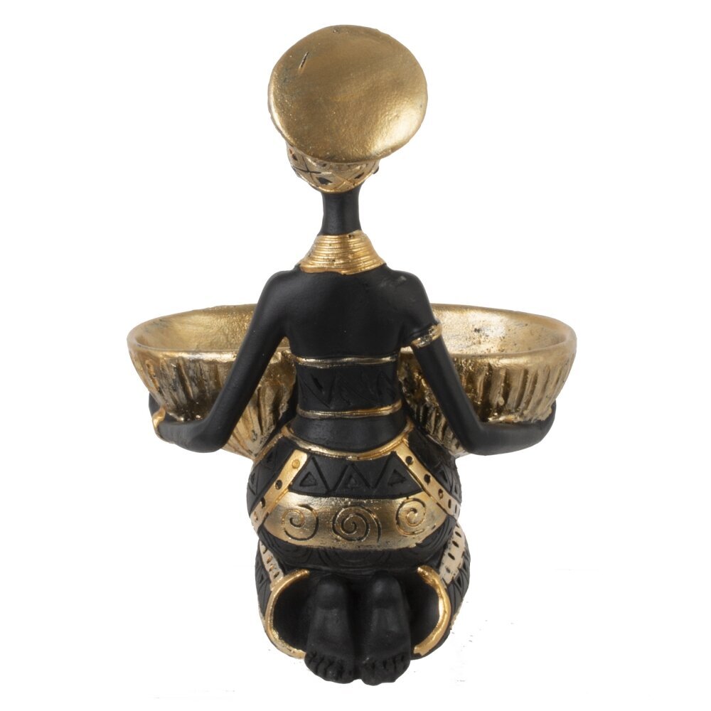 Декоративная фигурка "Африканка" выполнена из полимерных материалов и отличается этническим стилем. Фигурка изображает женщину в традиционном африканском наряде: объемный золотистый головной убор, массивные украшения на шее и руках подчеркивают аутентичность изделия. Основной элемент композиции — крупная чаша, которую женщина держит на вытянутых руках. Золотое покрытие добавляет фигурке торжественности и делает ее выразительным акцентом в интерьере. Элегантное сочетание черного и золотого цветов создает эффект роскоши и утонченности. Такая фигурка станет отличным украшением дома, подчеркивая вкус владельца и придавая помещению уют и оригинальность. Она может использоваться как самостоятельный арт-объект или в качестве подставки для мелочей, конфет или ключей. Отлично подойдет для подарка коллекционерам и любителям этнического декора.