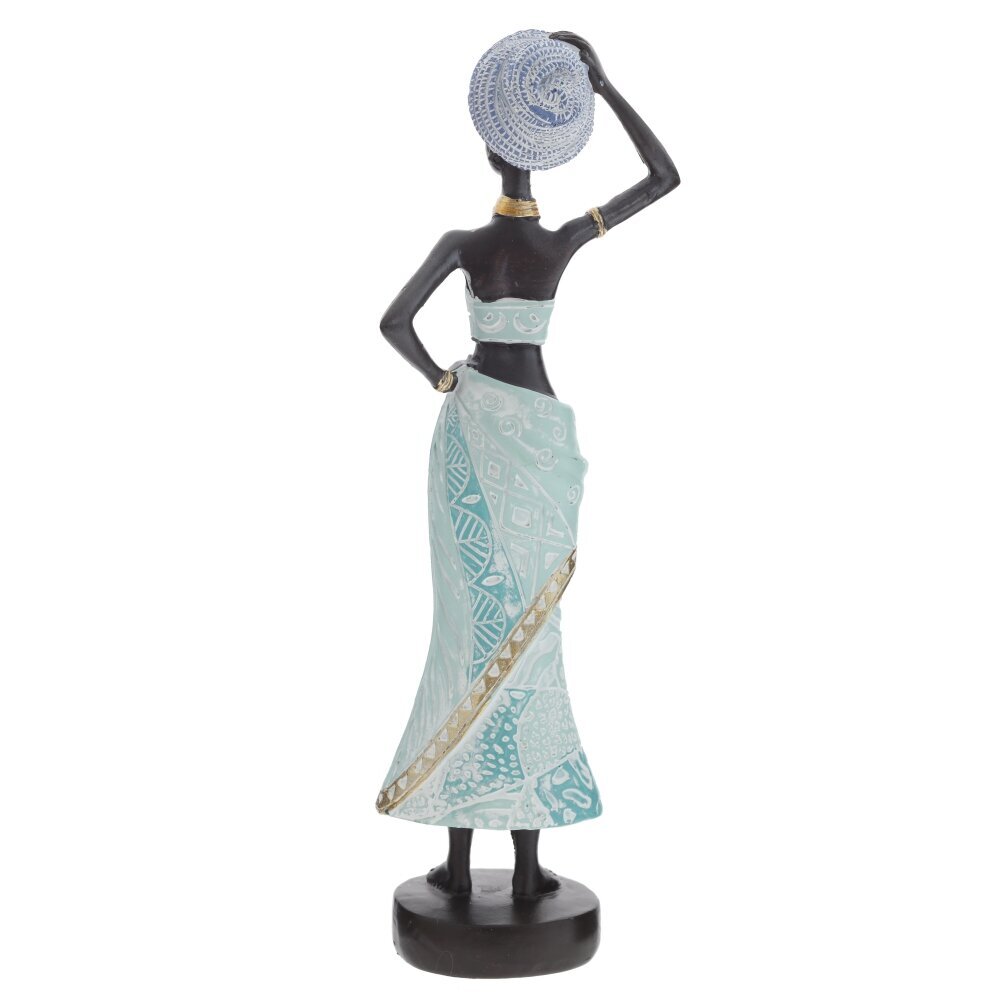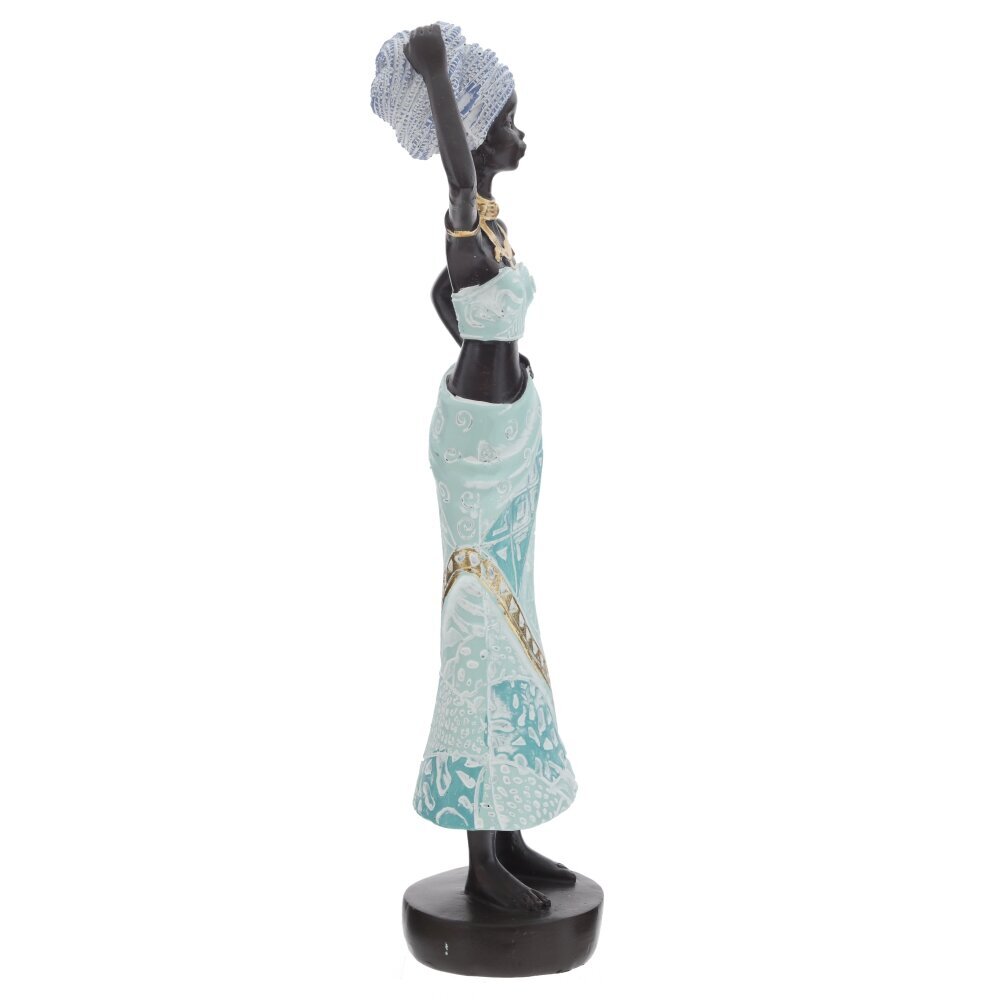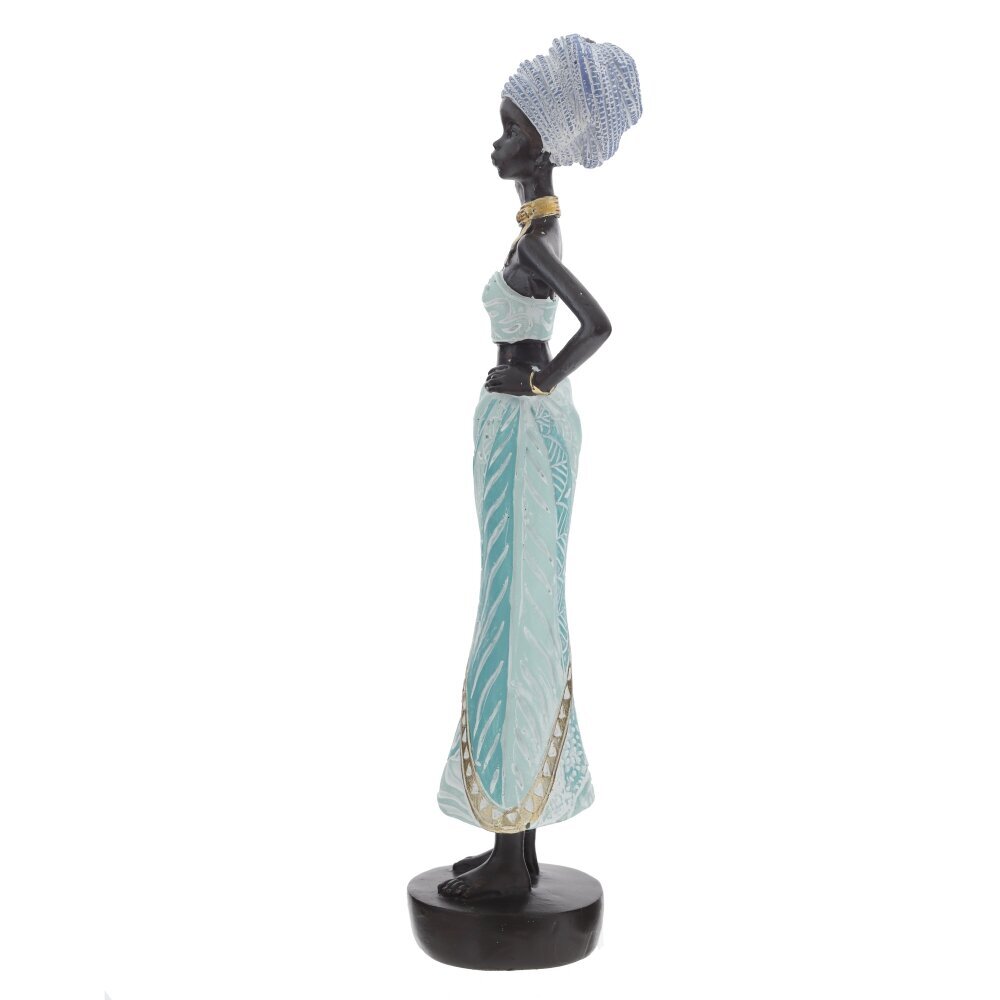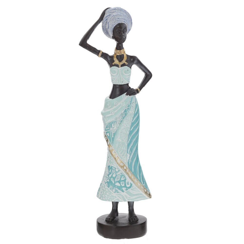 Декоративная фигурка «Африканка» — изящный акцент для современного интерьера. Стройная девушка в длинной бирюзово-белой накидке с этническим орнаментом и изящным топом передает колорит и грацию африканской культуры. Головной убор и украшения с золотистыми деталями подчёркивают утончённость образа. Фигурка выполнена из прочных полимерных материалов, устойчива на круглой подставке и не требует сложного ухода. Подойдёт для оформления гостиной, спальни, кабинета, станет эффектным элементом на полке, каминной полке или в витрине. Прекрасный вариант оригинального подарка ценителям необычного декора и этнического стиля в доме.