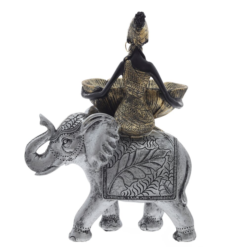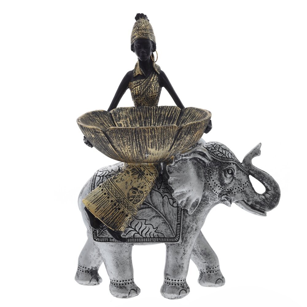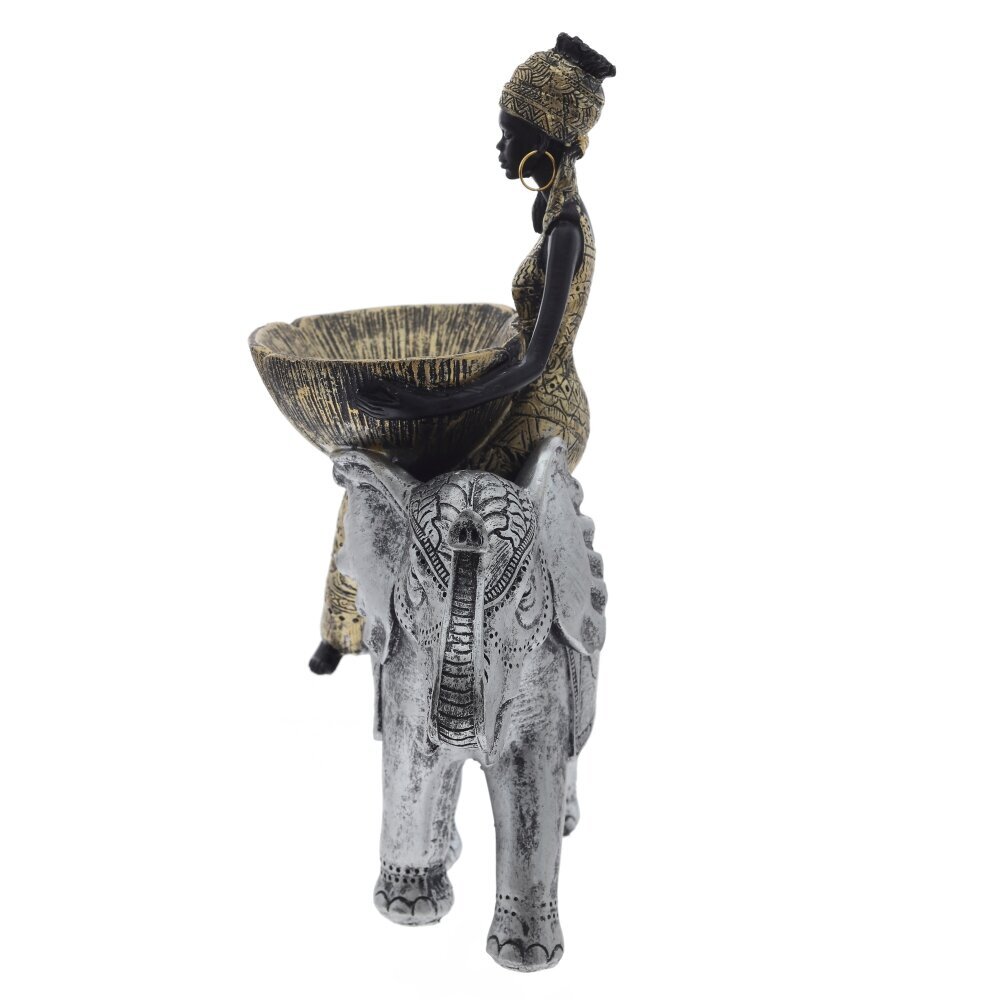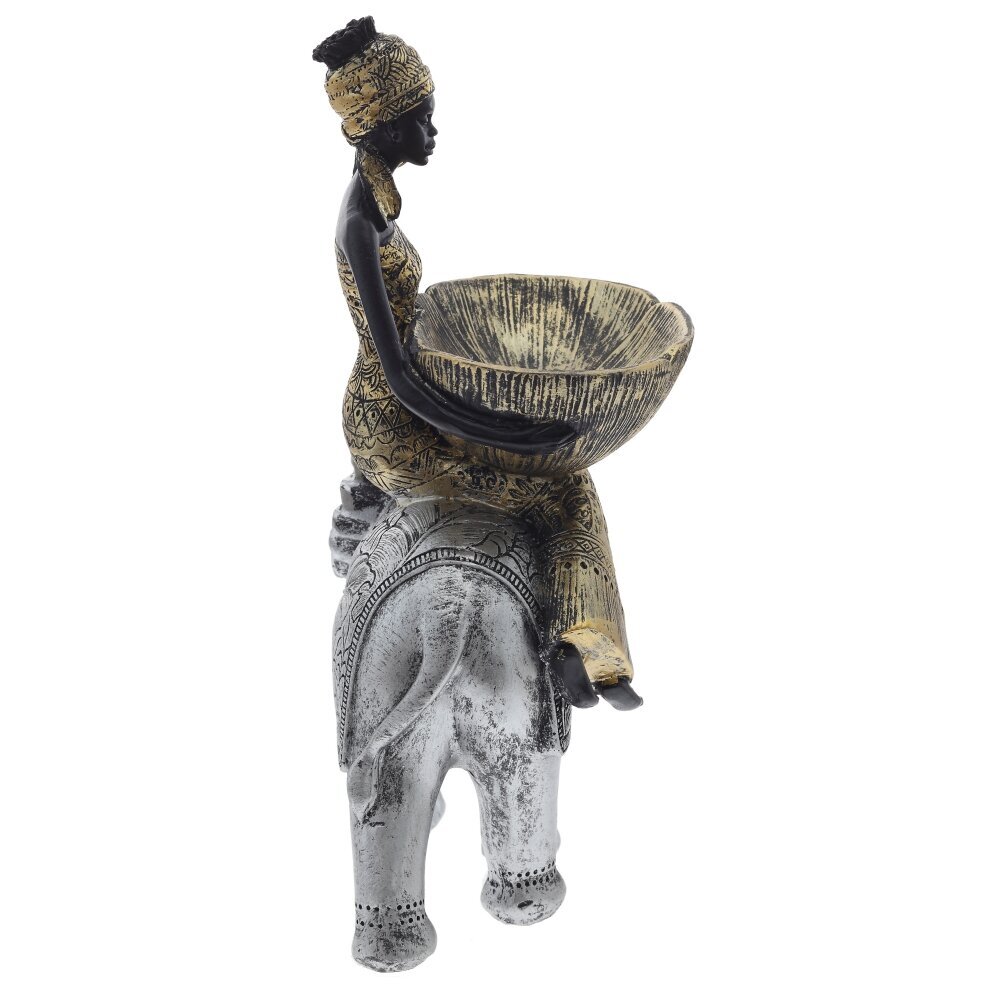 Элегантная декоративная фигурка "Африканка на слоне" станет изысканным украшением интерьера. Композиция выполнена из полимерных материалов и отличается высокой детализацией. Фигурка изображает африканскую женщину в традиционном наряде, сидящую верхом на украшенном орнаментами слоне. В руках она держит изящную чашу в форме лепестков, что делает фигурку не только красивым декоративным элементом, но и функциональной подставкой для мелочей. Цветовая гамма в золотисто-черных и серебристых тонах придает изделию благородный вид. Эта статуэтка прекрасно подойдет для украшения гостиной, офиса или в качестве оригинального подарка для ценителей этнического стиля.
