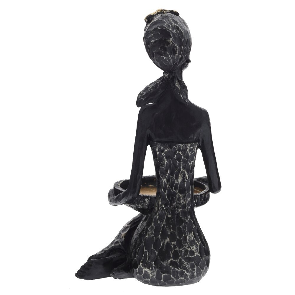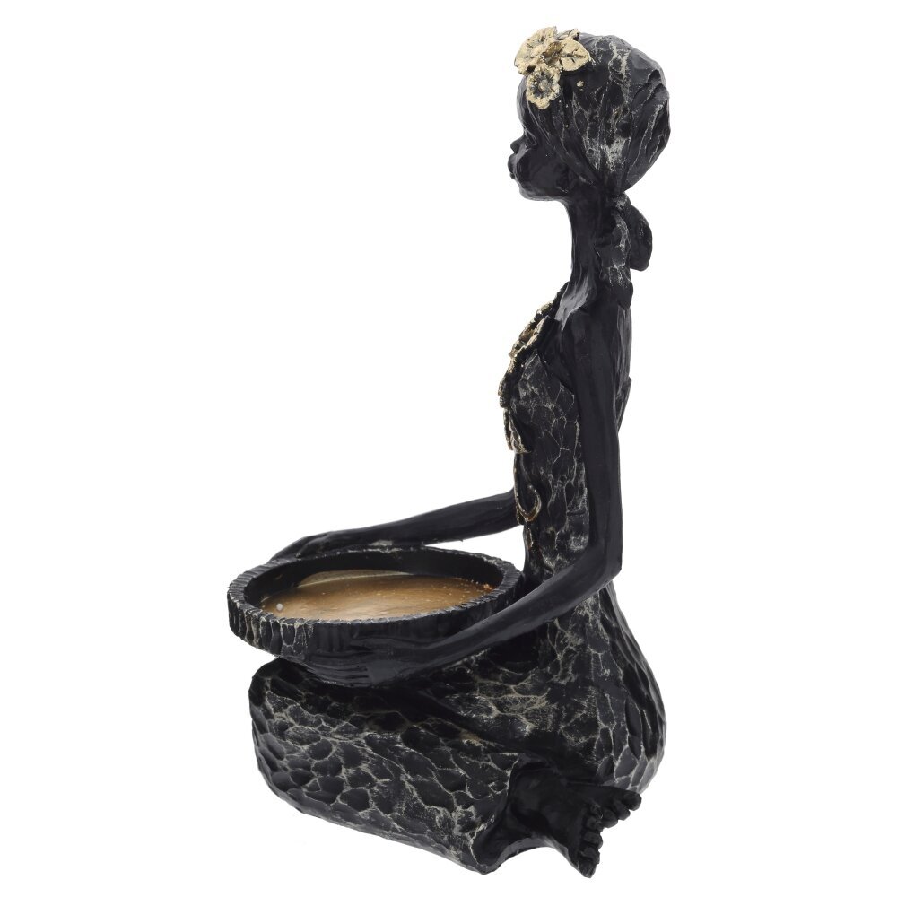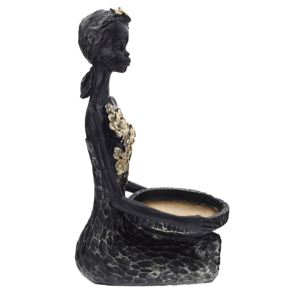 Декоративная фигурка «Африканка» с подставкой для мелочей – изящный акцент для интерьера в этническом или современном стиле. Фигура темного цвета выполнена из прочных полимерных материалов, украшена объемными золотистыми цветами и фактурной поверхностью. В руках героиня держит круглую чашу?подставку, в которую удобно складывать ключи, украшения, монеты и другие небольшие предметы. Компактный размер позволяет разместить статуэтку на прикроватной тумбе, туалетном столике, в прихожей или офисе. Идеально подходит в качестве необычного и стильного подарка.