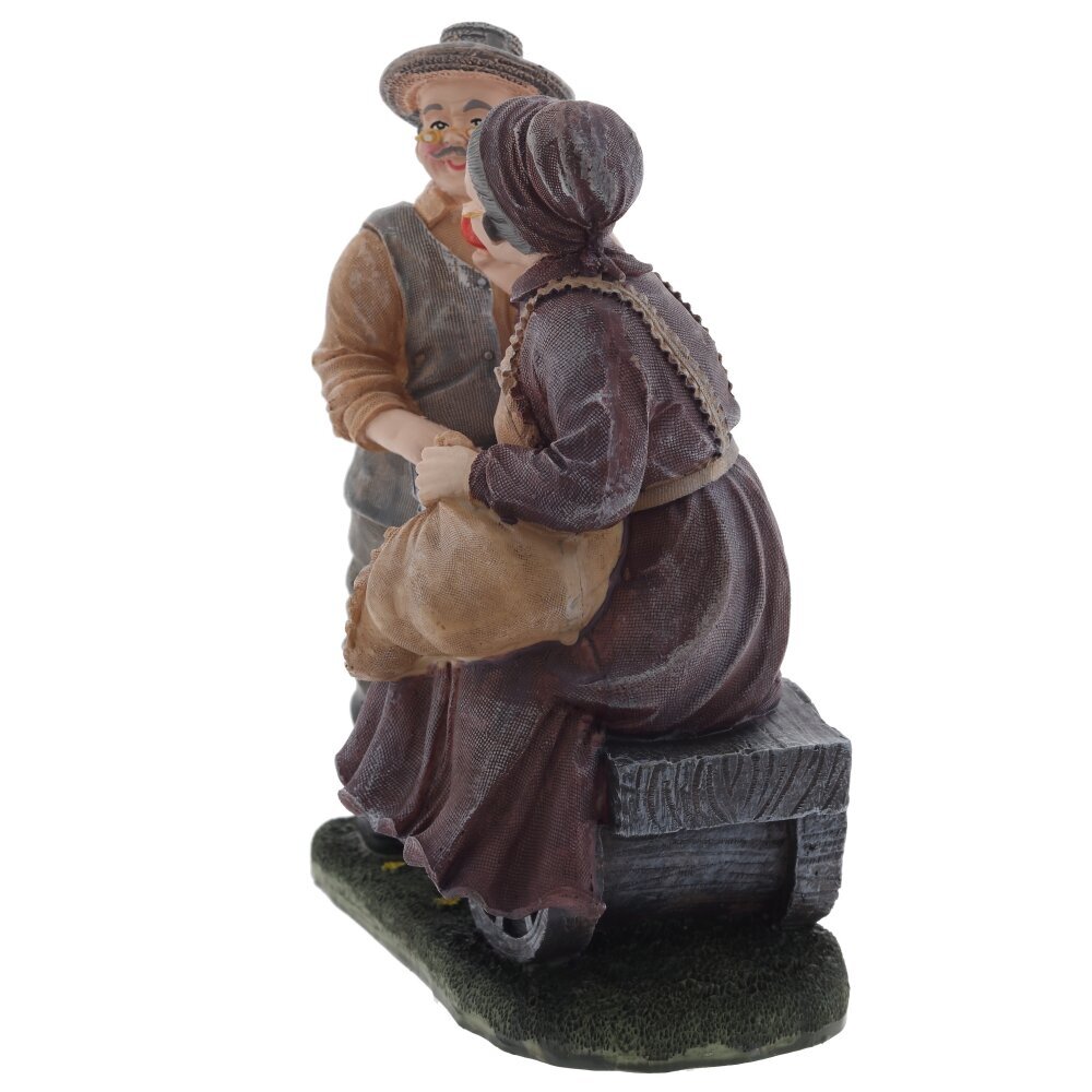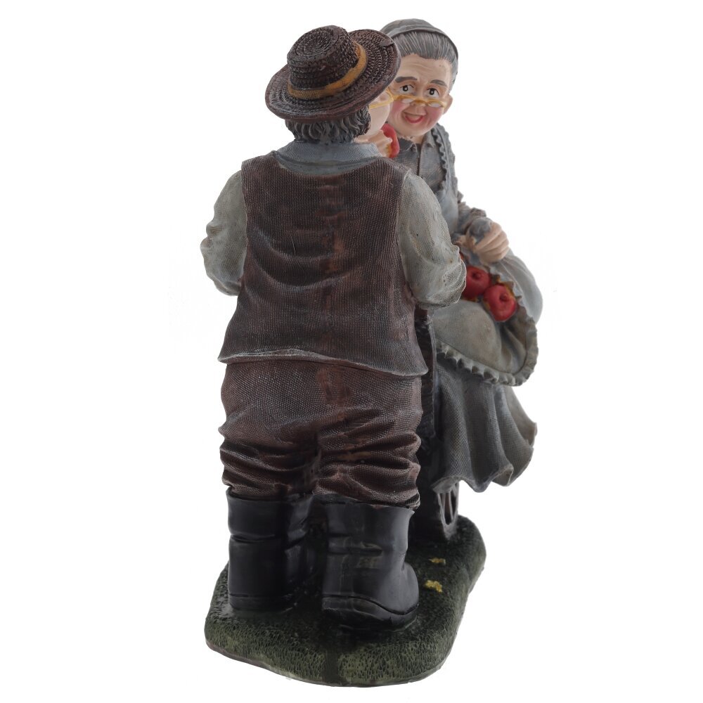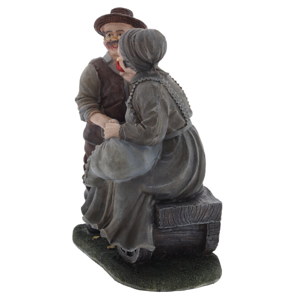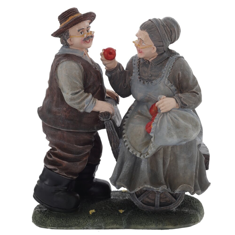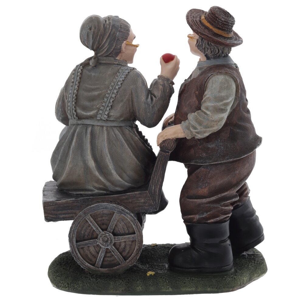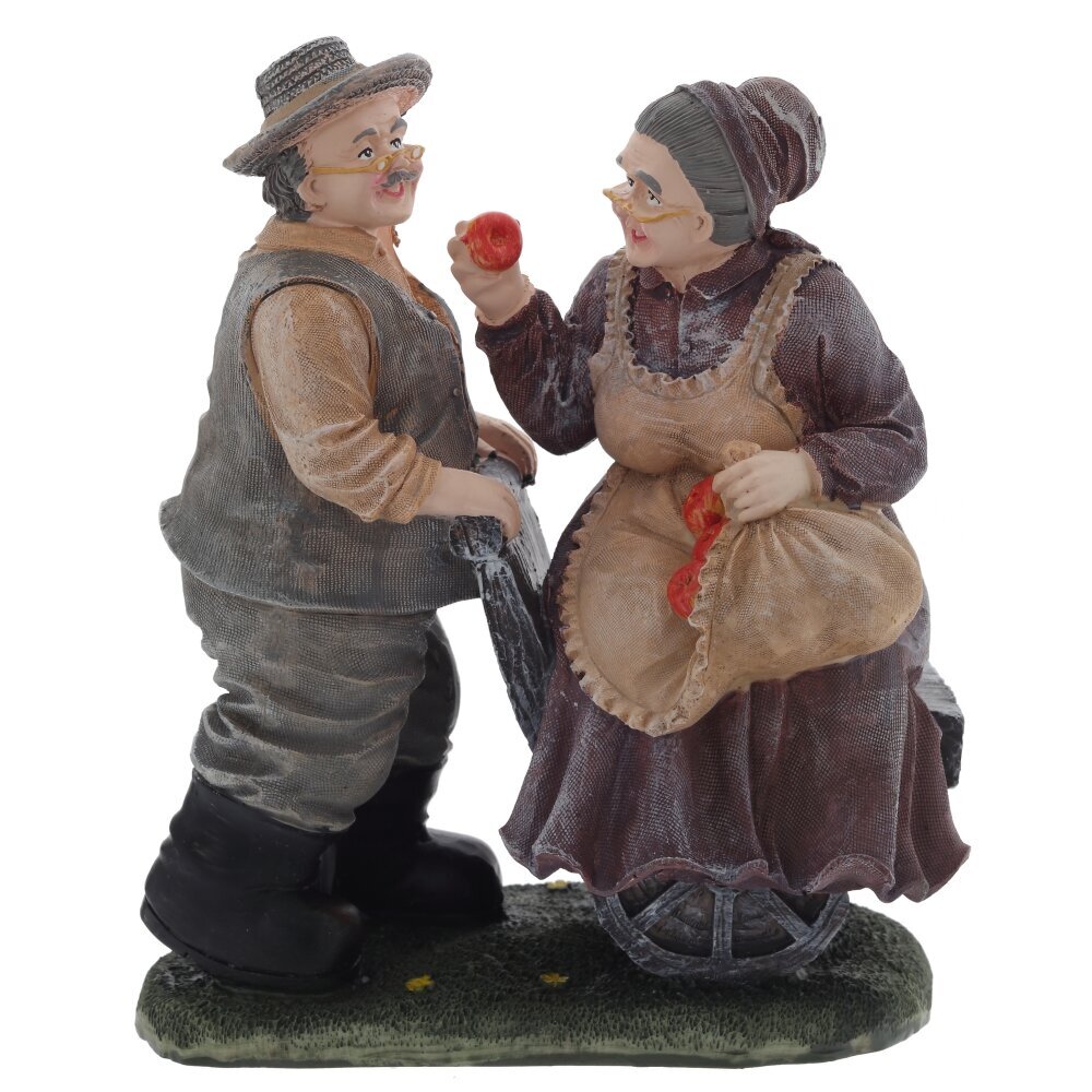 Декоративная фигурка из полимерных материалов, изображающая трогательную пару пожилых супругов. Бабушка в длинном платье и фартке держит в руках яблоко и мешочек, дедушка опирается на ручку тележки и смотрит на неё с улыбкой. Мягкие пастельные оттенки и детальная проработка одежды, лица и аксессуаров создают атмосферу уюта и деревенского тепла. Фигурка станет оригинальным украшением гостиной, кухни или дачи, подчеркнёт семейные ценности и подойдёт в качестве душевного подарка родным, друзьям или коллекционерам интерьерных статуэток. Представлено в двух вариантах.