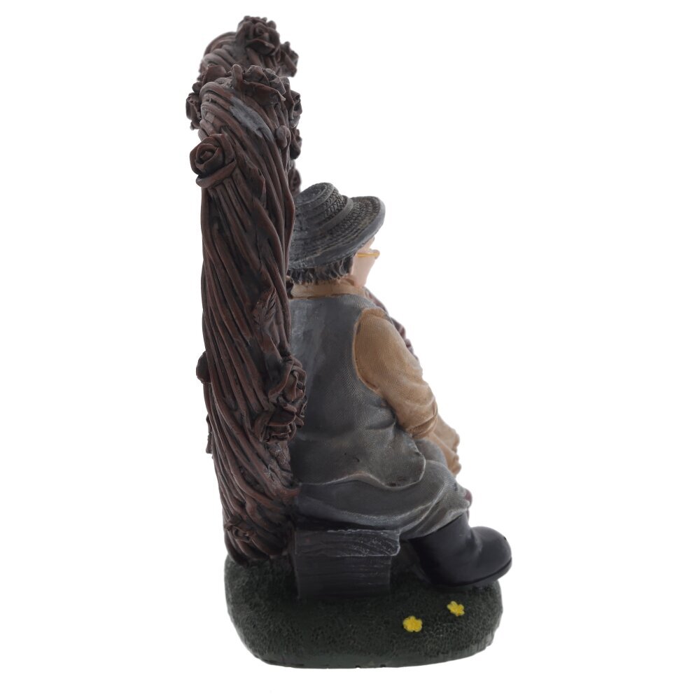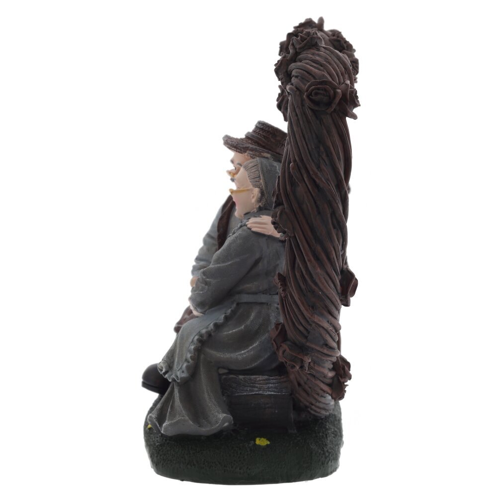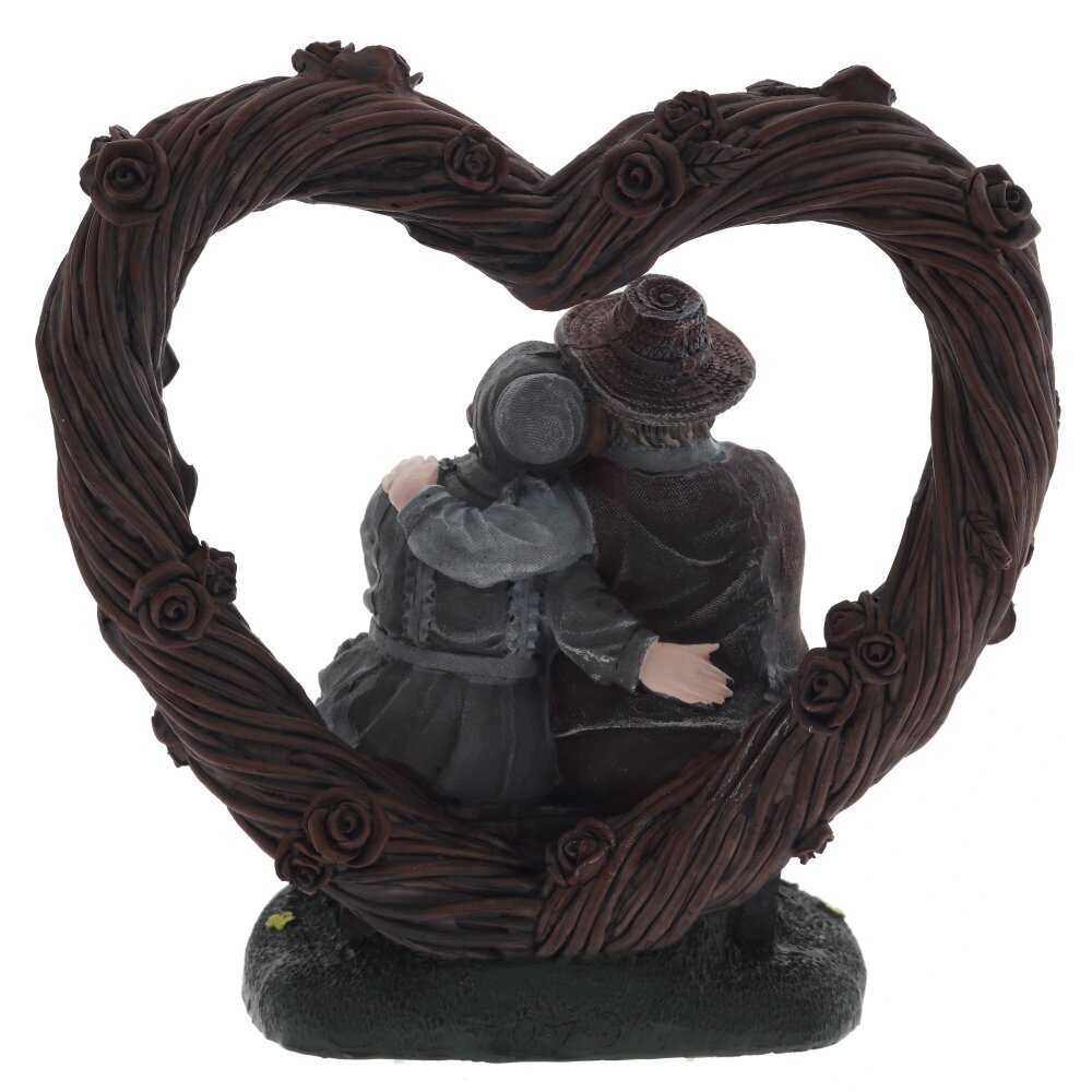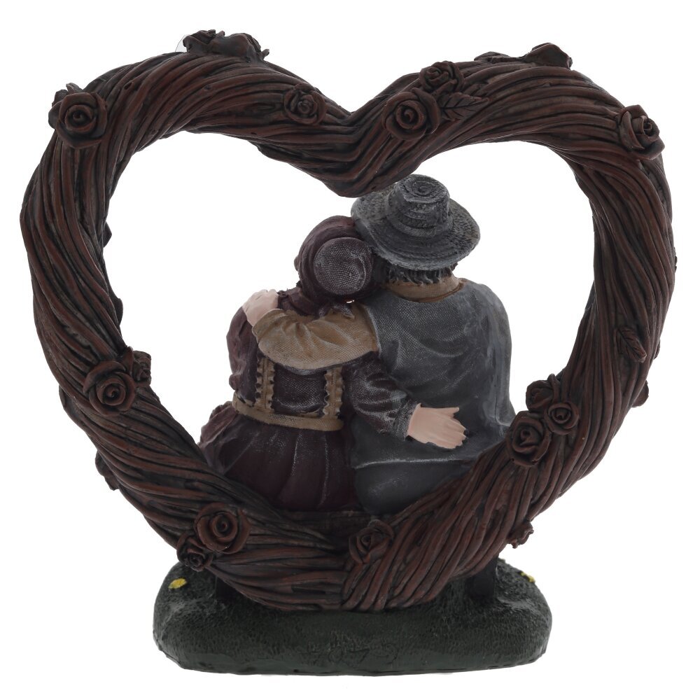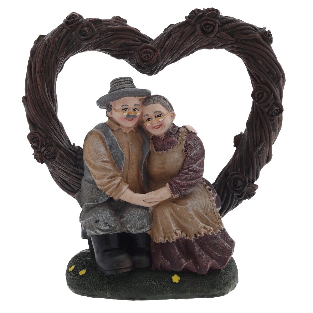 Декоративная фигурка из полимерных материалов, изображающая милую пожилую пару, сидящую рядышком на скамеечке в обнимку. За спинами у них – большое сердце, стилизованное под плетёные ветви с розами, что символизирует долгую и трогательную любовь. Тщательно выполненные детали одежды, лица и фактура «дерева» придают изделию особый шарм. Такая фигурка станет тёплым акцентом в интерьере, украшением полки, каминной или прикроватной тумбы, а также оригинальным подарком к годовщине свадьбы, юбилею родителей или просто знаком внимания близким. Представлено в двух вариантах.