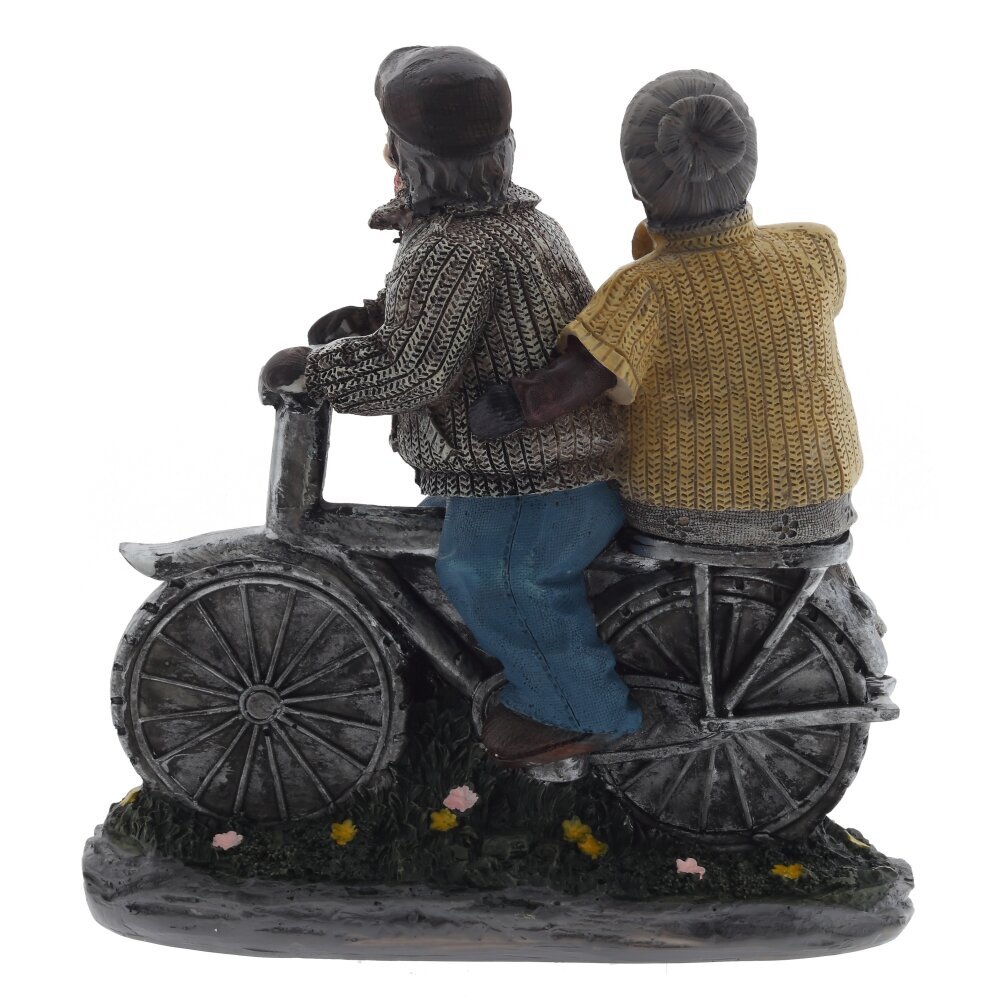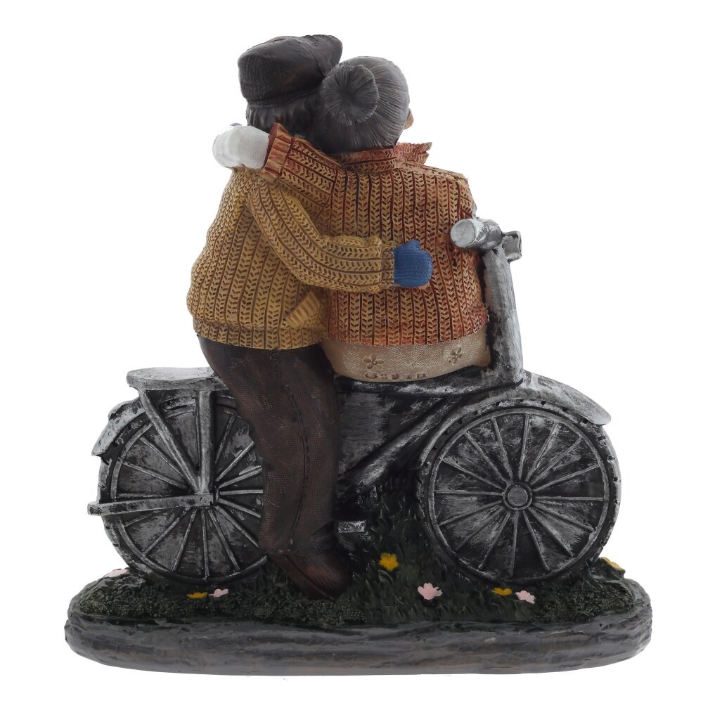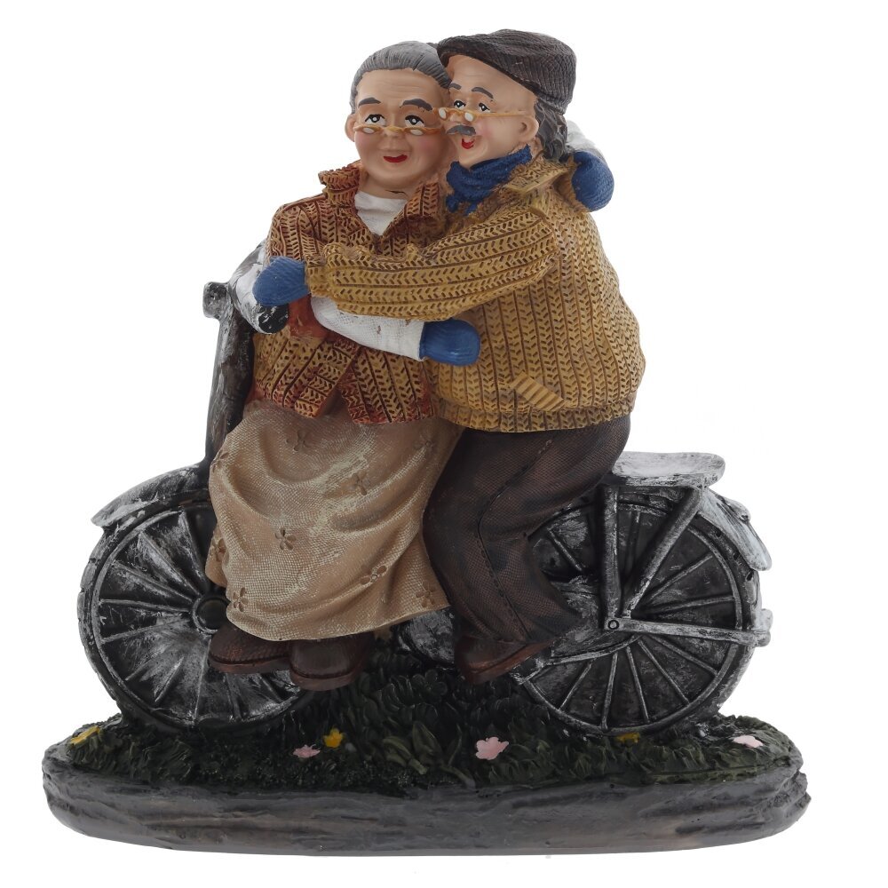 Декоративная фигурка из полимерных материалов, изображающая милую пожилую пару, катающуюся на ретро-велосипеде. Прорисованы детали одежды: объемные вязаные свитера, длинная юбка, шарф и кепка, что придаёт изделию особый уют и реалистичность. Фигурка установлена на фактурном основании с имитацией травы и цветами, поэтому отлично смотрится как самостоятельный элемент декора. Подойдёт для оформления гостиной, спальни или дачи, а также станет трогательным подарком для близких, символизирующим вечную любовь, верность и радость совместных воспоминаний. Представлено в двух вариантах.