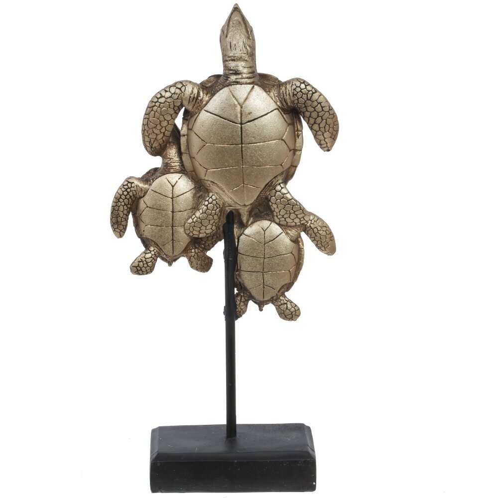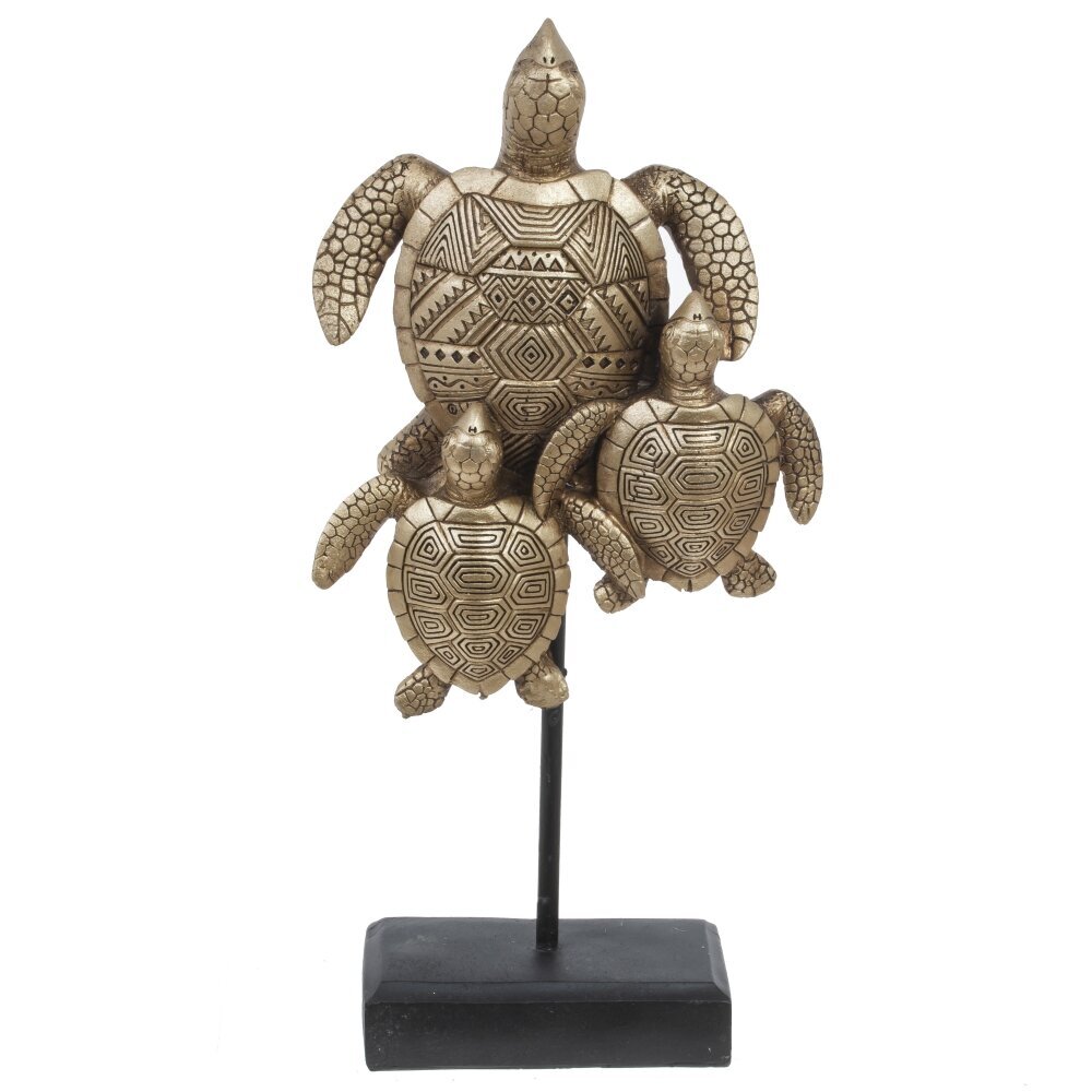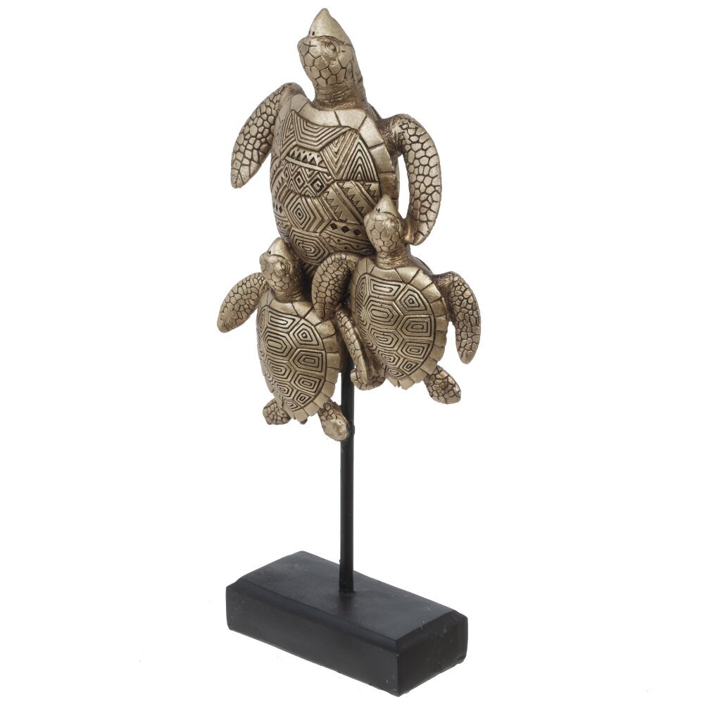 Декоративная фигурка «Черепахи» – стильный акцент для интерьера в этническом или современном стиле. Композиция из трёх черепах, расположенных на изящной металлической ножке с устойчивым прямоугольным основанием, символизирует семейное благополучие, долголетие и неспешное жизненное спокойствие. Поверхность панцирей украшена тонким геометрическим орнаментом, имитирующим ручную резьбу и придающим изделию выразительный, почти скульптурный характер. Изготовлена из прочных полимерных материалов с покрытием под состаренное золото, что делает фигурку визуально благородной и в то же время лёгкой и практичной в уходе. Она отлично смотрится на полке, каминной полке, в витрине, на рабочем столе или прикроватной тумбе. Подойдёт как оригинальный подарок ценителям необычного декора, станет яркой деталью дома, офиса или загородного интерьера, принося атмосферу уюта и гармонии.