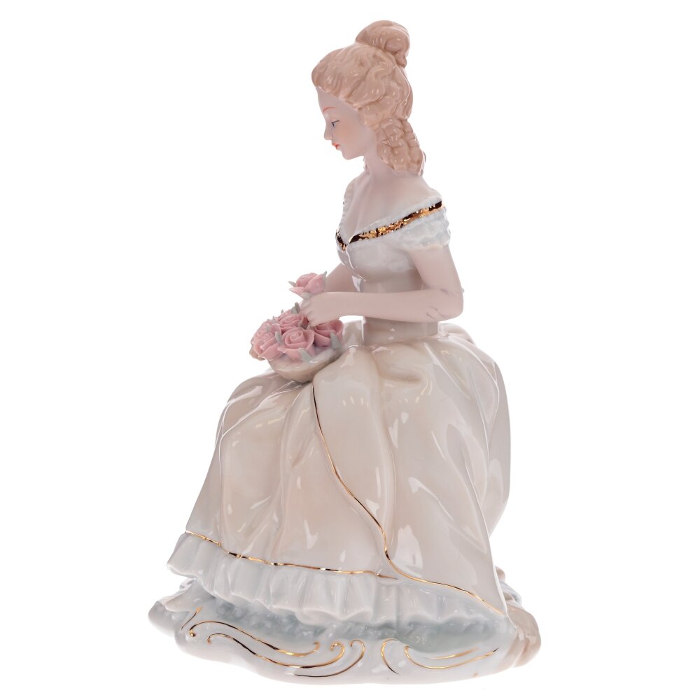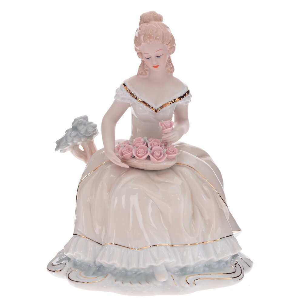 Фарфоровая фигурка изображает прекрасную девушку, которая одета в пышное розовое платье. Ее платье олицетворяет женственность, изящество и элегантность. Девушка держит в руках корзину, наполненную прекрасными розами. Розы являются символом красоты, любви и нежности. Они великолепно смотрятся, придавая фигурке особую грацию и эмоциональную глубину. Великолепное исполнение и качество материалов делают ее идеальным подарком для ценителей прекрасного и элегантного искусства.