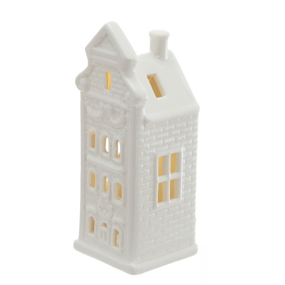 Декоративная фигурка «Домик» из белого фарфора с мягкой подсветкой создаёт уютное, тёплое свечение в окнах. Корпус выполнен с детальной фактурой кирпичной кладки, с аккуратными проёмами, фронтоном и небольшим дымоходом на скатной крыше. Глянцевая глазурь красиво отражает свет, а ровные линии придают миниатюре элегантный вид. Домик гармонично впишется в новогоднюю композицию, уютный уголок в стиле хюгге, на полке, подоконнике или прикроватной тумбе. Компактный и лёгкий, безопасен для использования как ночник-акцент. Универсальный белый цвет легко сочетается с другой декором, а тёплая подсветка создаёт атмосферу спокойствия и праздничной сказки. Отличная идея для подарка.