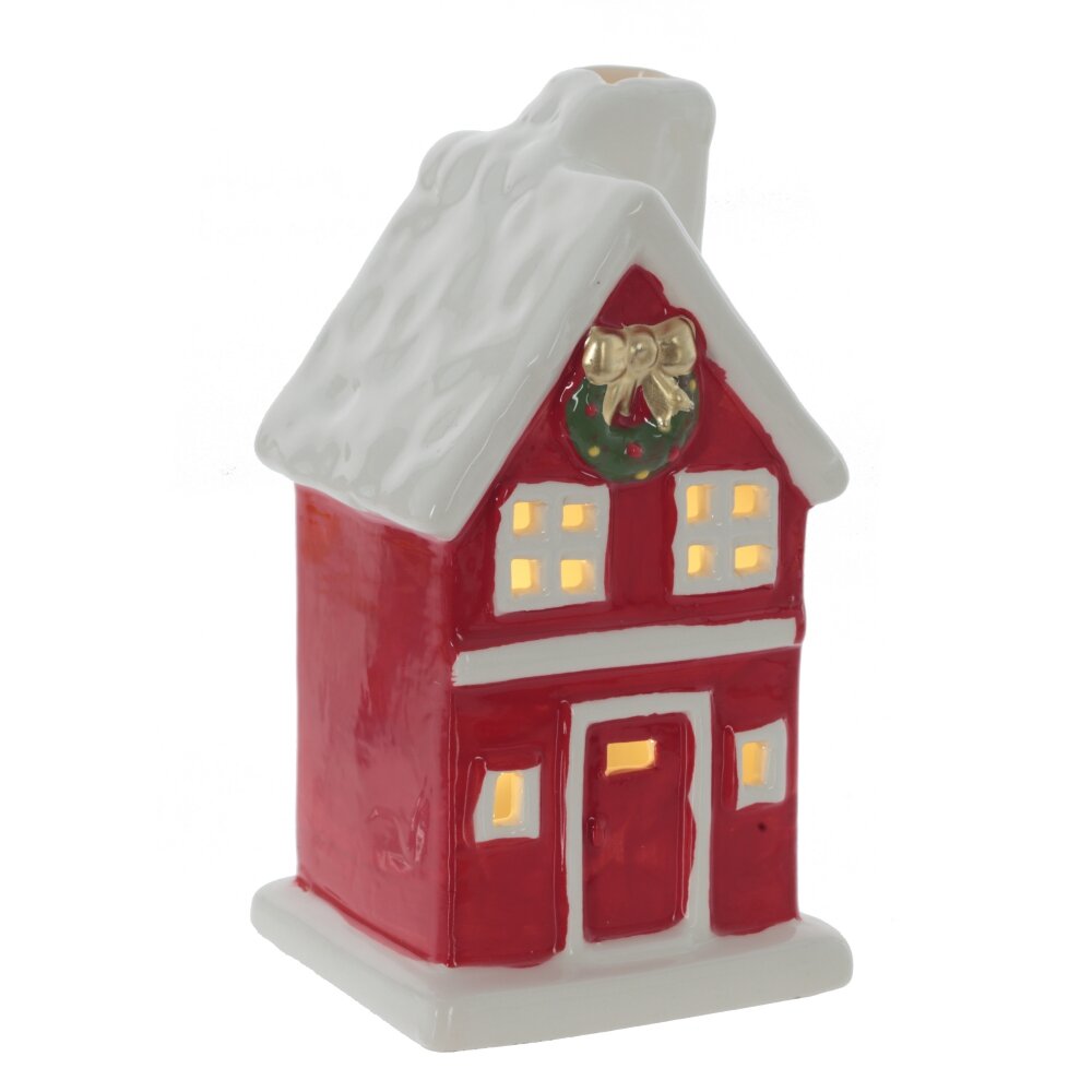 Декоративная фигурка "Домик" с подсветкой станет ярким акцентом в вашем интерьере. Изготовлен из керамики с глянцевым покрытием и оформлен в виде красного таун-хауса с треугольной заснеженной крышей, трубой и рождественским венком. При включении через прорези в окнах пробивается мягкий теплый свет, создавая уютную атмосферу. Фигурка работает от трех батареек типа LR44, которые входят в комплект. С фигуркой "Домик" каждый вечер будет напоминать о тепле домашнего очага, создавая атмосферу праздника в любое время года.