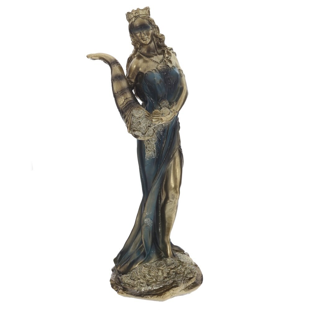 Декоративная фигурка «Фортуна» – изящный акцент для интерьера и символ удачи в доме. Богиня изображена в длинном струящемся платье глубокого синего оттенка с золотистым покрытием, подчеркивающим складки ткани и плавные линии силуэта. В руках она держит рог изобилия, из которого высыпаются монеты и драгоценности, что традиционно означает достаток, благополучие и исполнение желаний. Фигурка выполнена из прочных полимерных материалов, устойчива к выцветанию и легко очищается от пыли. Идеально подойдёт для гостиной, рабочего кабинета или в качестве оригинального подарка на новоселье, юбилей, профессиональный праздник.