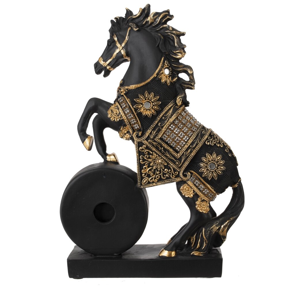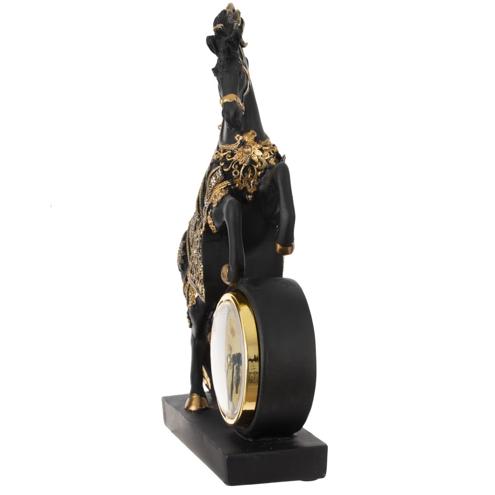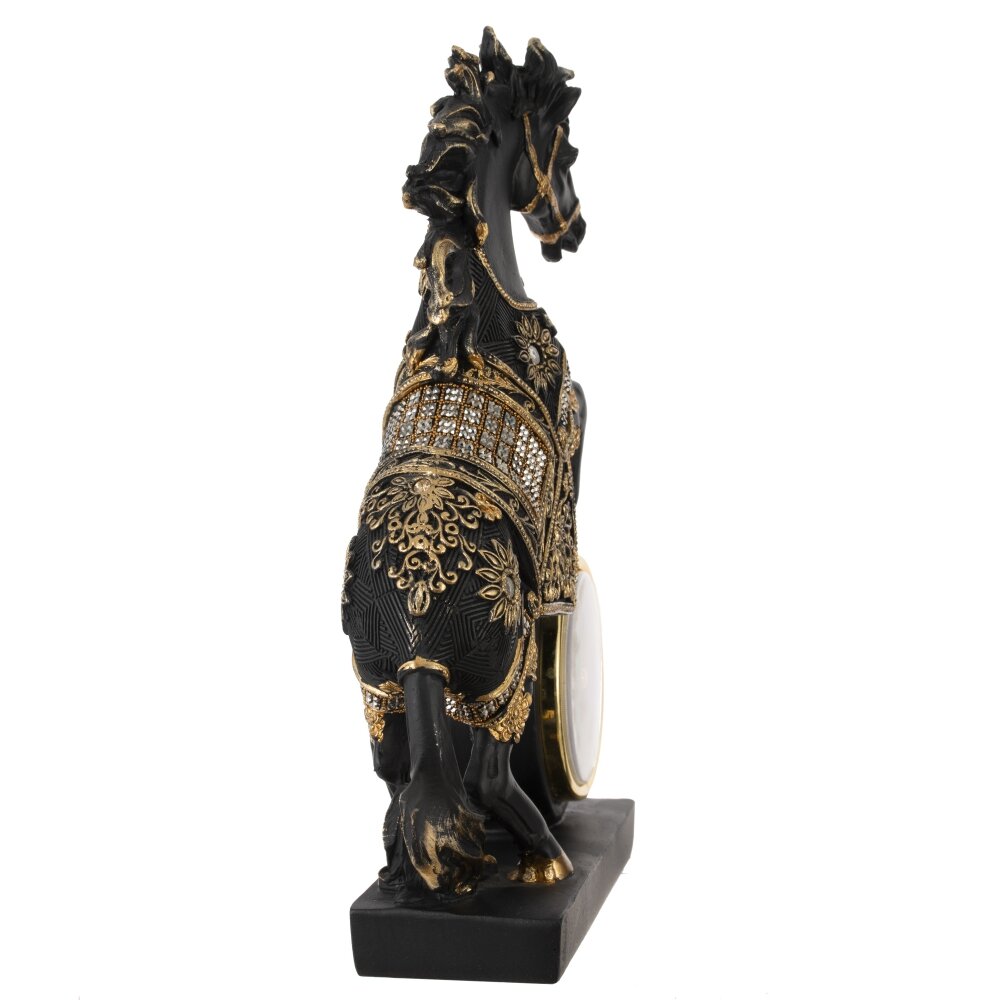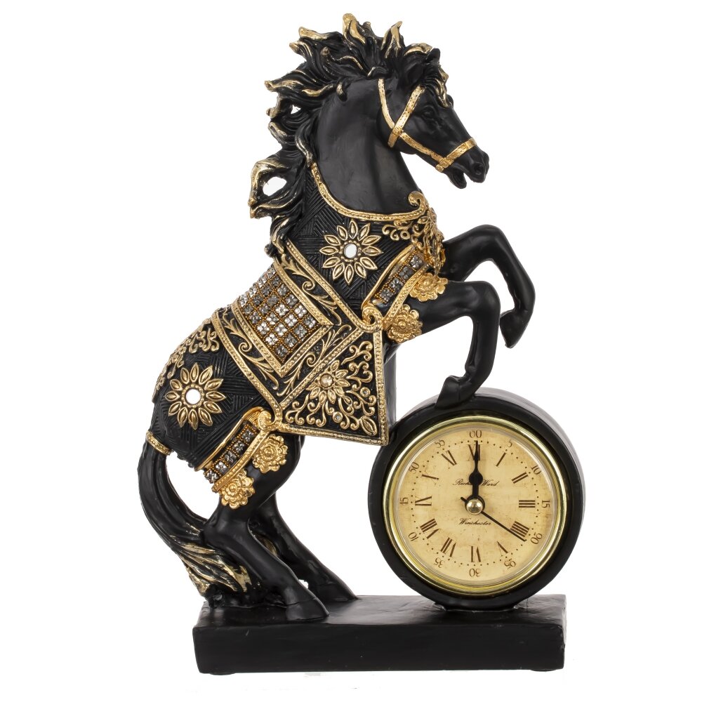 Декоративная фигурка "Лошадь" с часами — это изысканный и функциональный акцент для вашего интерьера, сочетающий элегантность и практичность! Выполнена из прочного полистоуна, устойчивого к царапинам и пыли. Установлена на подставке. Фигурка изображает реалистичную черную лошадь в динамичной позе курбет (на задних ногах), с высокой детализацией: мускулистое тело, выразительная морда, развивающаяся грива и хвост, словно ожившие под ветром. Нарядная попона украшена изысканным золотым узором, придающим праздничный шарм. Круглые часы с диаметром циферблата 6 см имеют римские цифры и работают от одной батарейки ААА (батарейки не прилагаются). Это практичный подарок как символ года Лошади, идеальный для коллекционеров, любителей лошадей и ценителей стильного декора. Прекрасно дополнит полку, стол или витрину, принося нотку грации и функциональности в любое пространство!