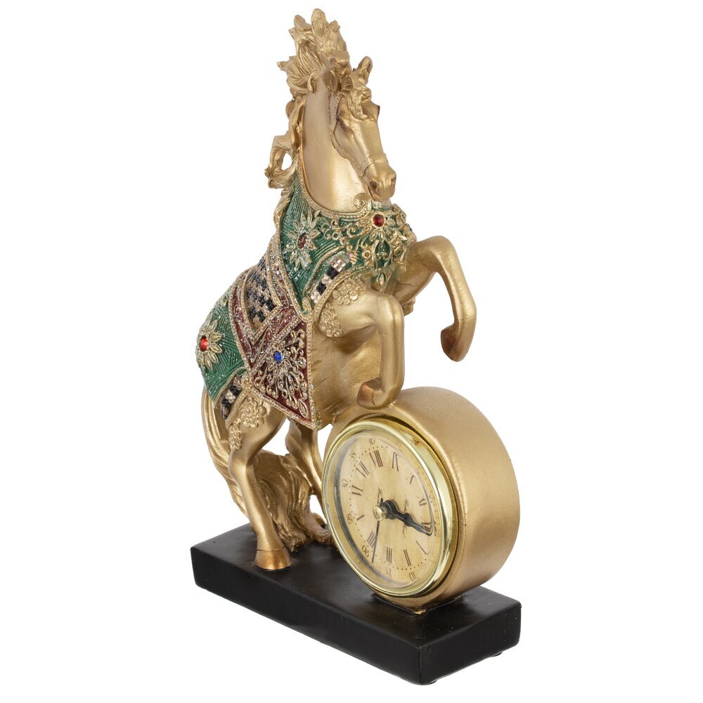 Декоративная фигурка "Лошадь" с часами — это изысканный и функциональный акцент для вашего интерьера, сочетающий элегантность и практичность! Выполнена из прочного полистоуна, устойчивого к царапинам и пыли. Установлена на подставке. Фигурка изображает реалистичную золотую лошадь в динамичной позе курбет (на задних ногах), с высокой детализацией: мускулистое тело, выразительная морда, развивающаяся грива и хвост, словно ожившие под ветром. Нарядная зеленая попона украшена изысканным узором и старазми, придающим праздничный шарм. Круглые часы с диаметром циферблата 6 см имеют римские цифры и работают от одной батарейки ААА (батарейки не прилагаются). Это практичный подарок как символ года Лошади, идеальный для коллекционеров, любителей лошадей и ценителей стильного декора. Прекрасно дополнит полку, стол или витрину, принося нотку грации и функциональности в любое пространство!