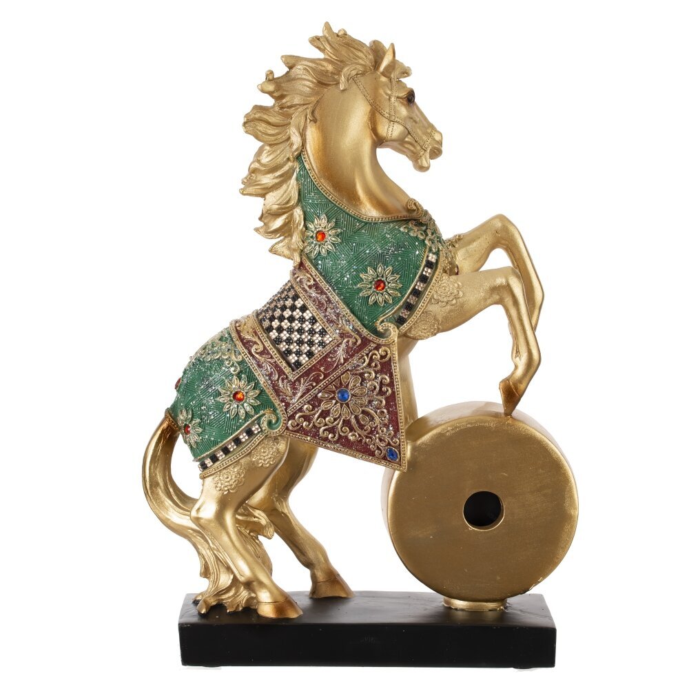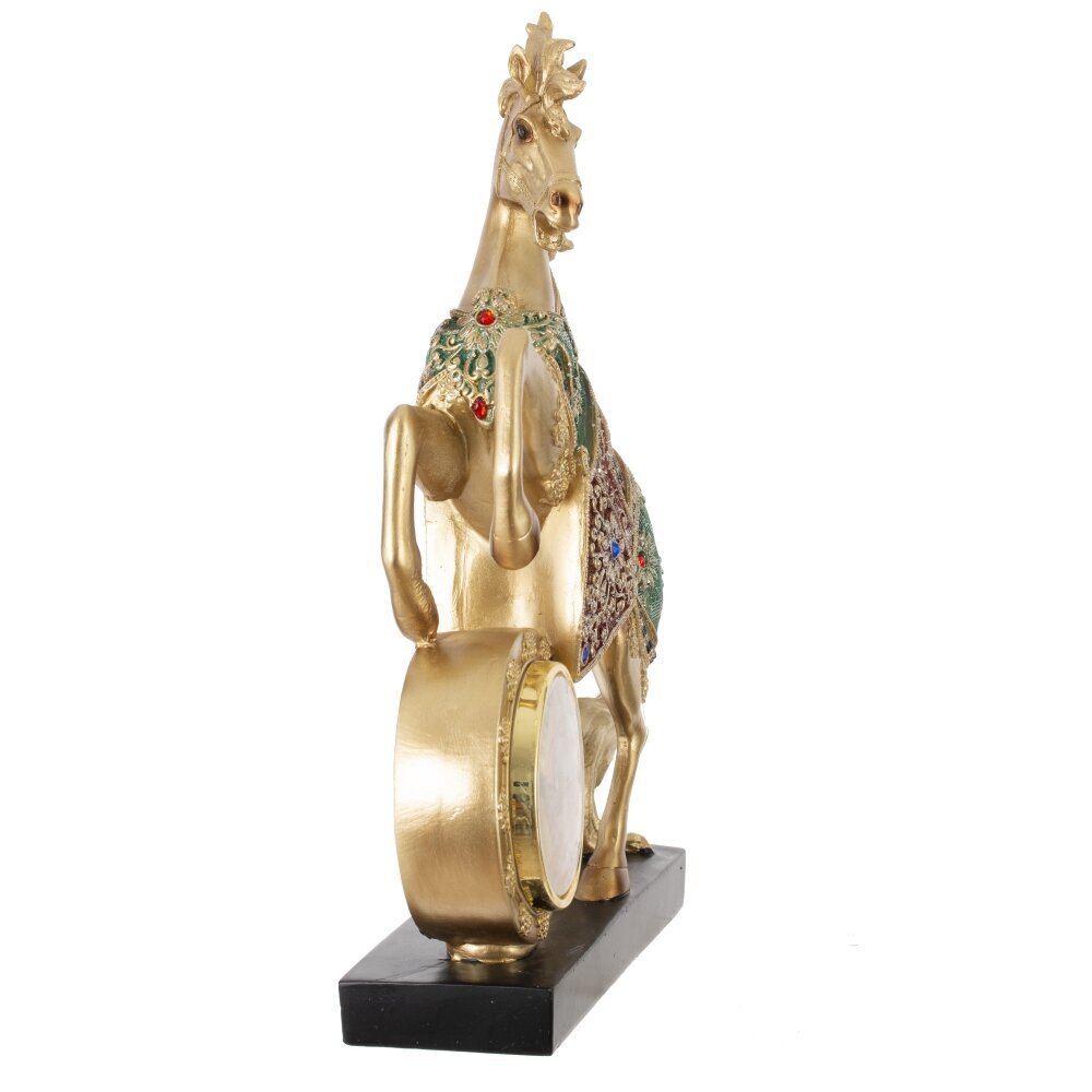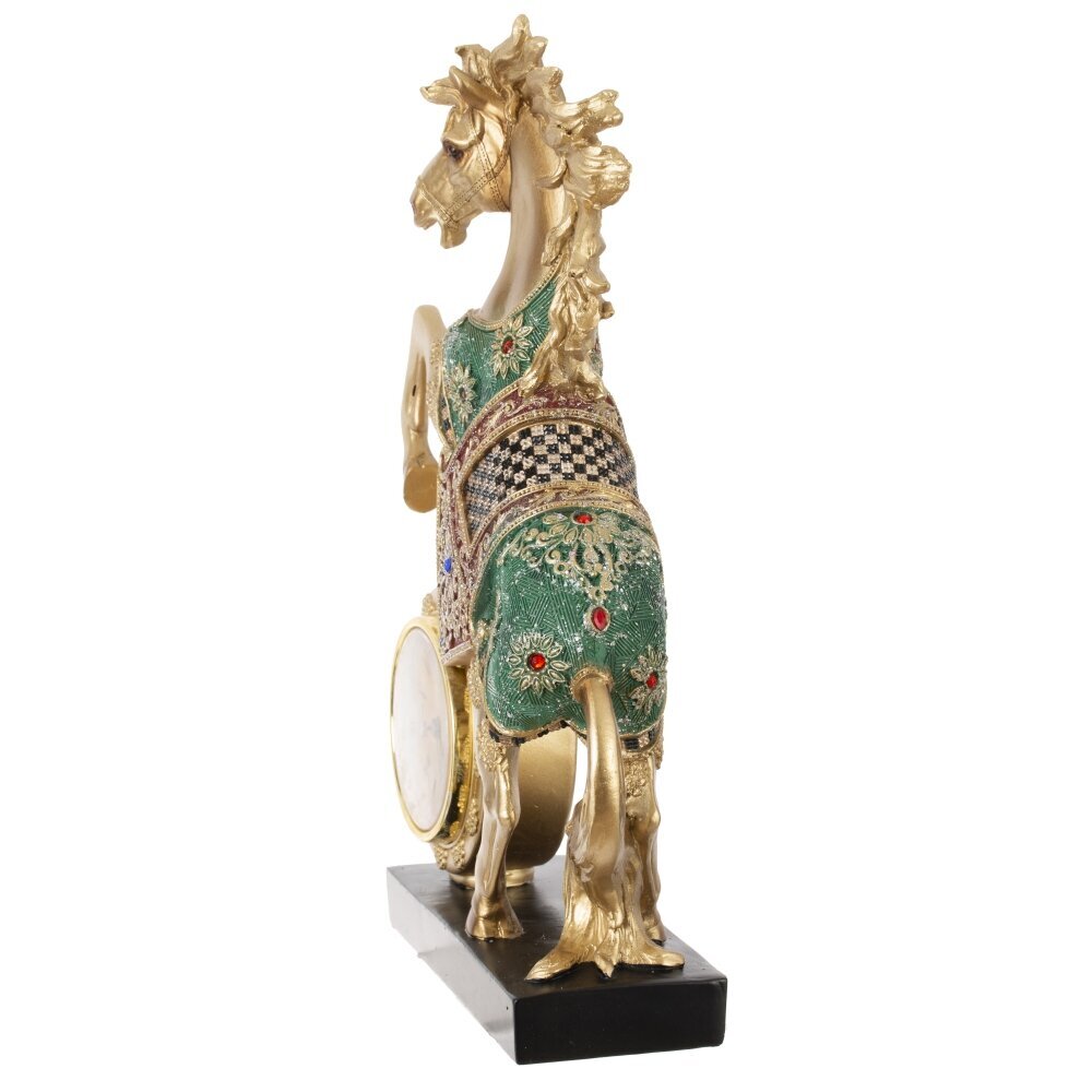 Декоративная фигурка "Лошадь" с часами — это изысканный и функциональный акцент для вашего интерьера, сочетающий элегантность и практичность! Выполнена из прочного полистоуна, устойчивого к царапинам и пыли. Установлена на подставке. Фигурка изображает реалистичную золотую лошадь в динамичной позе курбет (на задних ногах), с высокой детализацией: мускулистое тело, выразительная морда, развивающаяся грива и хвост, словно ожившие под ветром. Нарядная зеленая попона украшена изысканным узором и старазми, придающим праздничный шарм. Круглые часы с диаметром циферблата 7 см имеют римские цифры и работают от одной батарейки АА (батарейки не прилагаются). Это практичный подарок как символ года Лошади, идеальный для коллекционеров, любителей лошадей и ценителей стильного декора. Прекрасно дополнит полку, стол или витрину, принося нотку грации и функциональности в любое пространство!