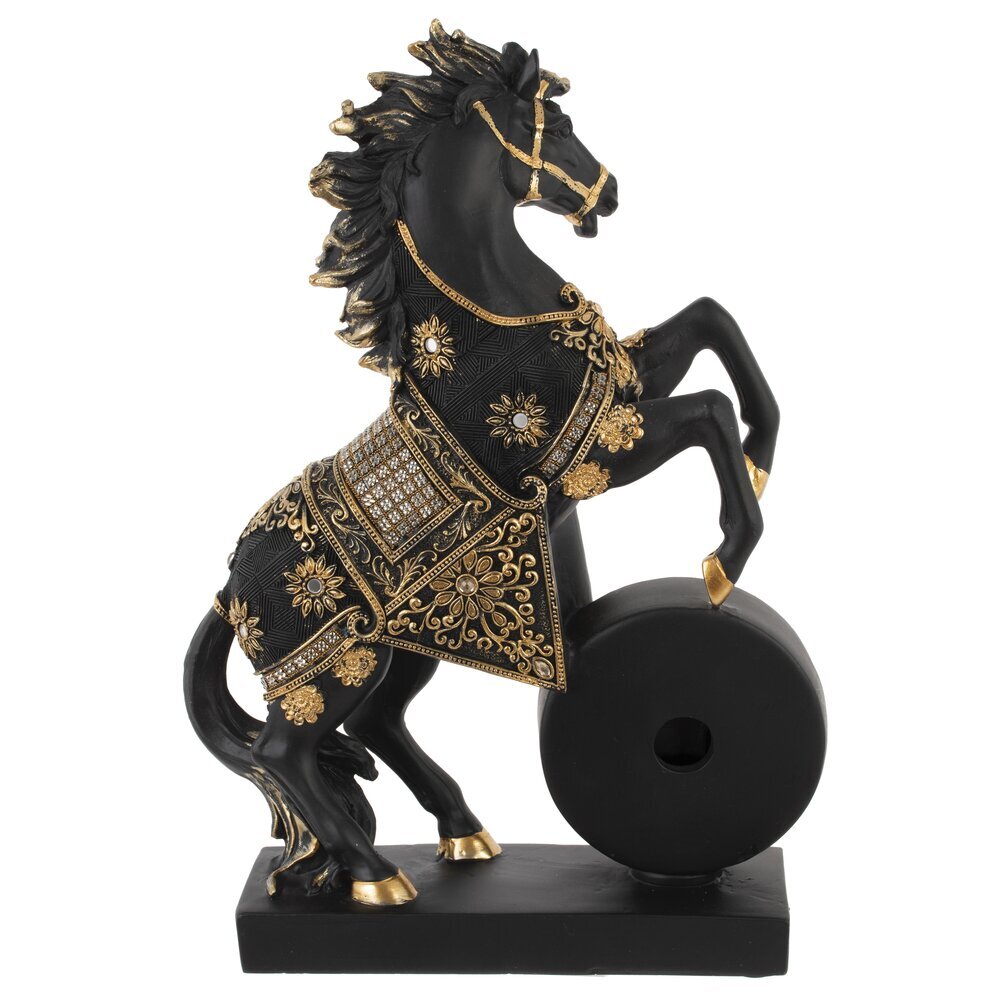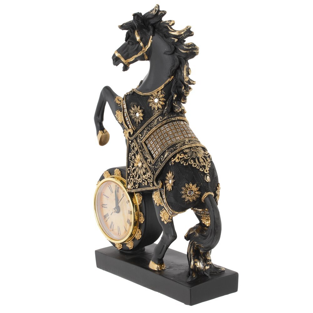 Декоративная фигурка "Лошадь" с часами — это изысканный и функциональный акцент для вашего интерьера, сочетающий элегантность и практичность! Выполнена из прочного полистоуна, устойчивого к царапинам и пыли. Установлена на подставке. Фигурка изображает реалистичную черную лошадь в динамичной позе курбет (на задних ногах), с высокой детализацией: мускулистое тело, выразительная морда, развивающаяся грива и хвост, словно ожившие под ветром. Нарядная попона украшена изысканным узором и старазми, придающим праздничный шарм. Круглые часы с диаметром циферблата 7 см имеют римские цифры и работают от одной батарейки АА (батарейки не прилагаются). Это практичный подарок как символ года Лошади, идеальный для коллекционеров, любителей лошадей и ценителей стильного декора. Прекрасно дополнит полку, стол или витрину, принося нотку грации и функциональности в любое пространство!