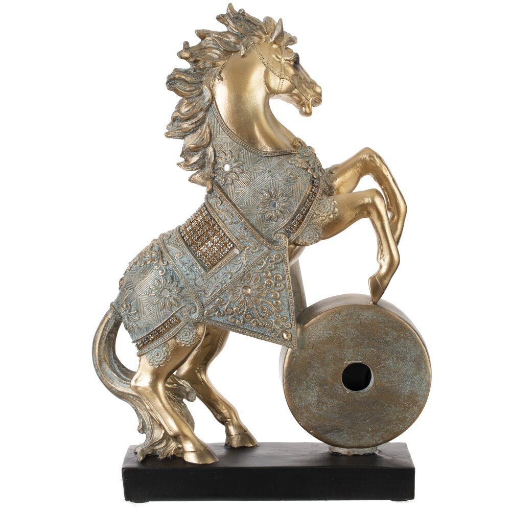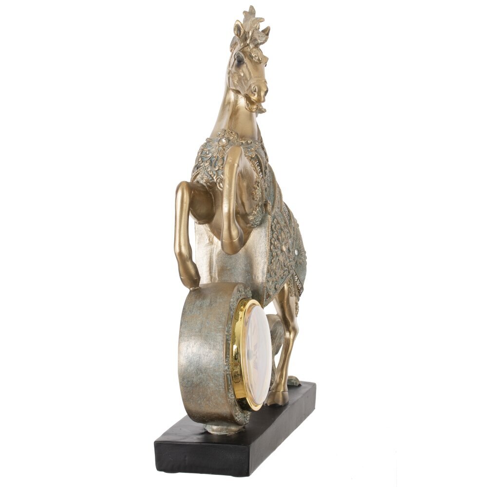 Декоративная фигурка "Лошадь" с часами — это изысканный и функциональный акцент для вашего интерьера, сочетающий элегантность и практичность! Выполнена из прочного полистоуна, устойчивого к царапинам и пыли. Установлена на подставке. Фигурка изображает реалистичную золотую лошадь в динамичной позе курбет (на задних ногах), с высокой детализацией: мускулистое тело, выразительная морда, развивающаяся грива и хвост, словно ожившие под ветром. Нарядная попона украшена изысканным узором и старазми, придающим праздничный шарм. Круглые часы с диаметром циферблата 7 см имеют римские цифры и работают от одной батарейки АА (батарейки не прилагаются). Это практичный подарок как символ года Лошади, идеальный для коллекционеров, любителей лошадей и ценителей стильного декора. Прекрасно дополнит полку, стол или витрину, принося нотку грации и функциональности в любое пространство!