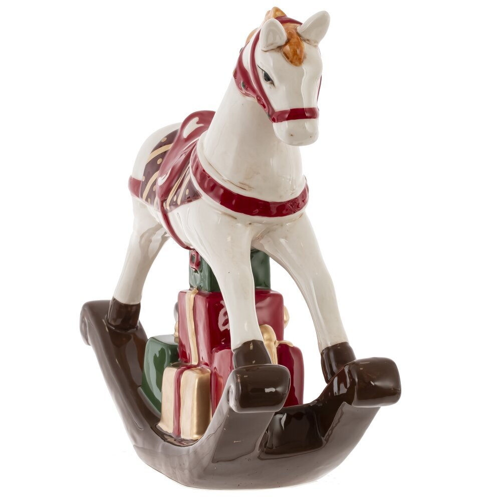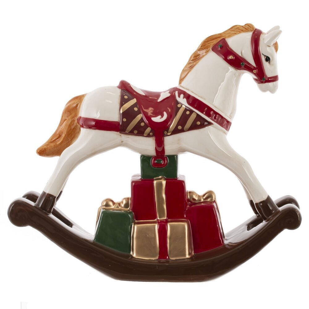 Декоративная фигурка "Лошадка" — это изысканный элемент интерьера в стиле ретро. Она выполнена из керамики и представляет собой классическую лошадку-качалку с изящными деталями. Белый цвет, украшения на седле и золотистая отделка придают этому предмету очарование и элегантность. Эта лошадка станет замечательным акцентом в любом уголке вашего дома, добавляя ностальгический уют и придавая атмосферу детства.