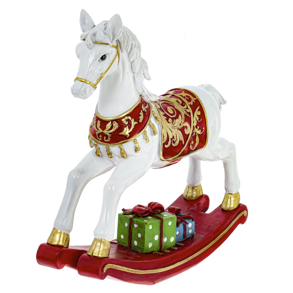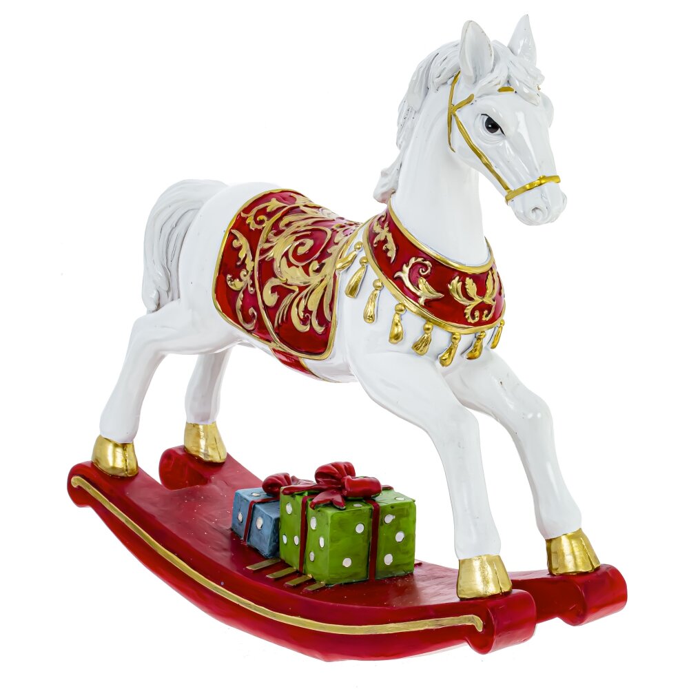 Декоративная фигурка в виде детской лошадки-качалки, высотой 24 см, выполнена из прочного полистоуна. Белоснежная лошадка украшена изысканным красно-золотым седлом и золотыми копытами, добавляя ей элегантности и блеска. На красной подставке размещены яркие подарочные коробки, которые придают композиции новогоднего настроения. Эта изящная фигурка станет прекрасным украшением для вашего интерьера, привнося в него детскую радость.