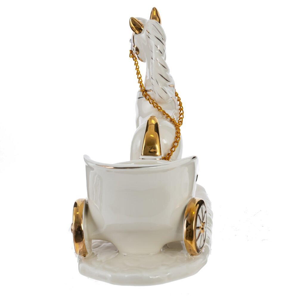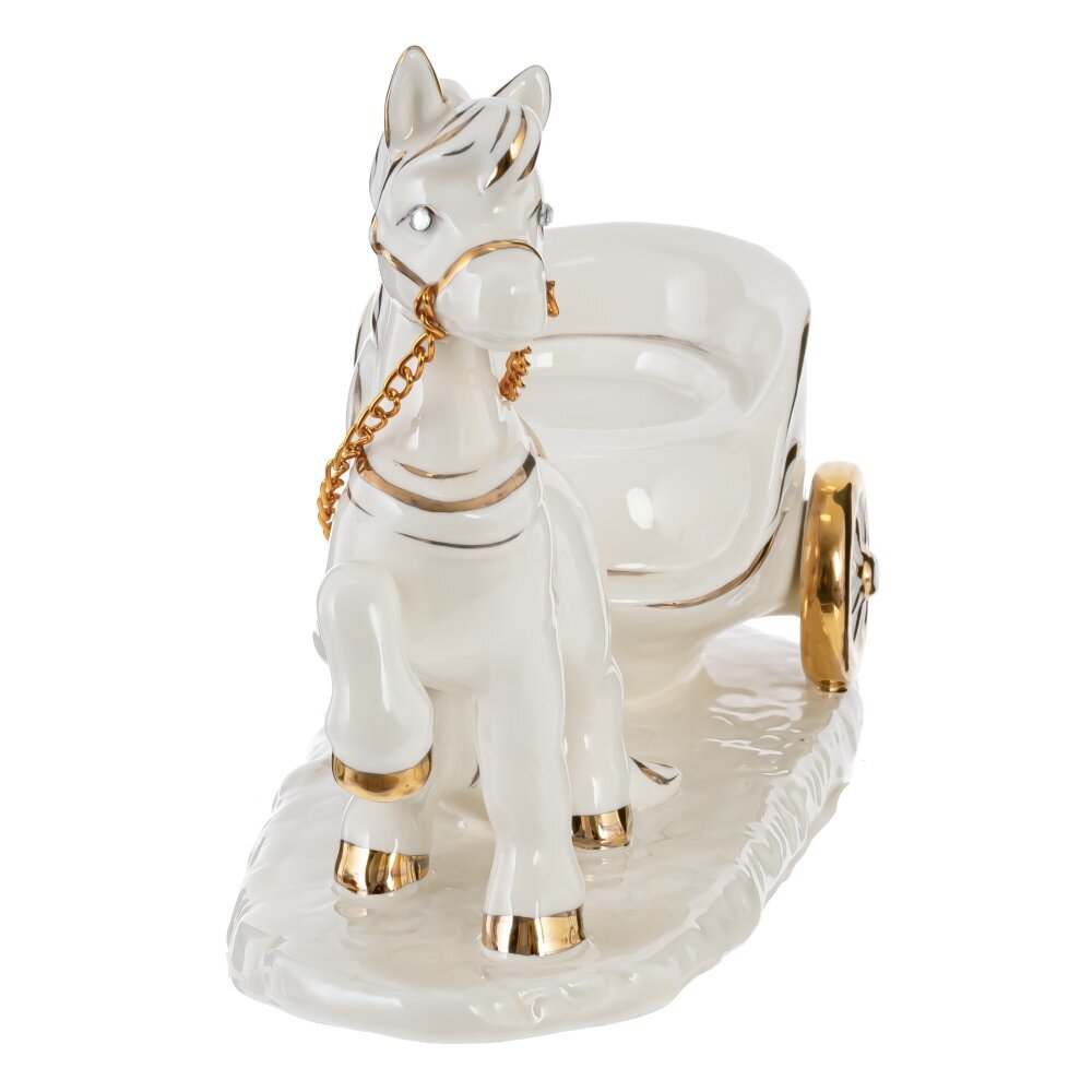 Элегантная декоративная фигурка в виде лошадки с подсвечником— это не только красивый элемент интерьера, но и практичный аксессуар. Изготовлена из высококачественного белого фарфора и украшена утонченными золотыми элементами, она придаёт пространству изысканность и уют. Такая фигурка станет прекрасным подарком, символизирующим удачу, движение вперёд и гармонию. Идеально впишется в классический и современный интерьер, украсит полку, туалетный столик или рабочее место. Благородное сочетание белого и золотого цветов делает изделие универсальным и по-настоящему праздничным.