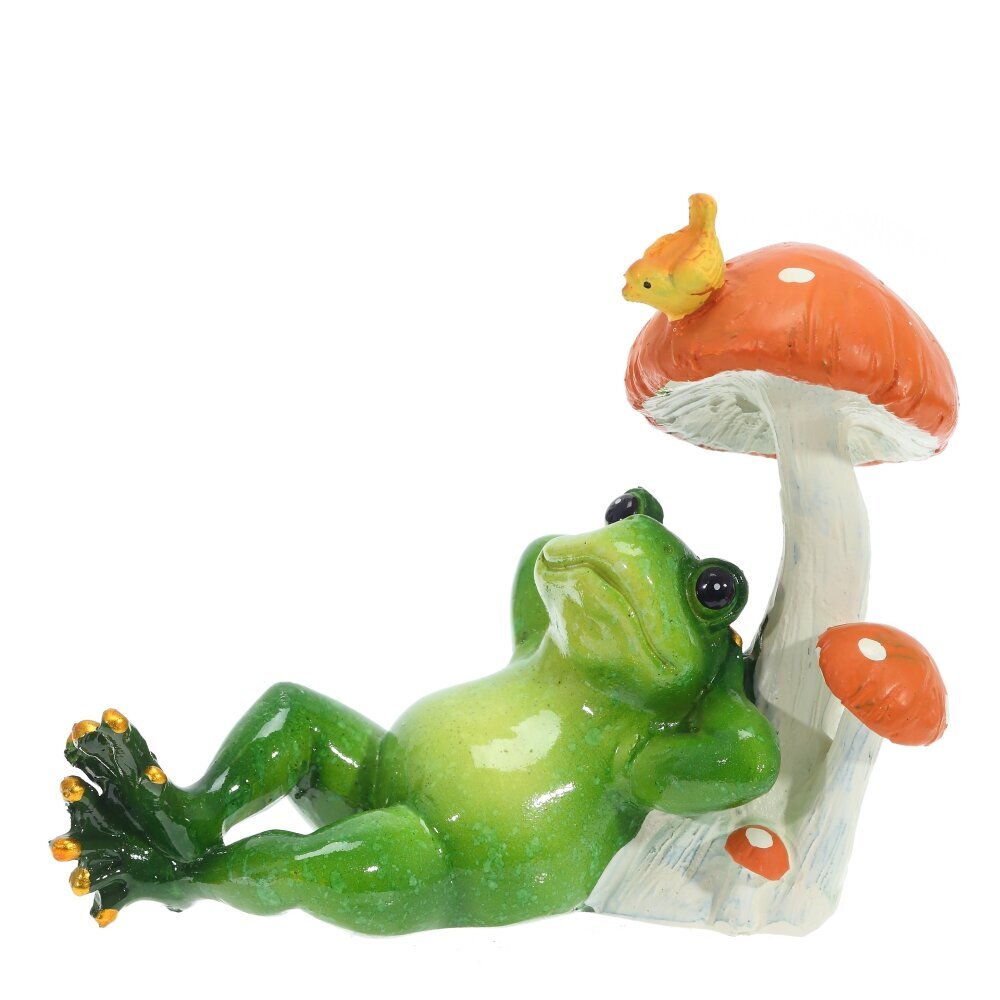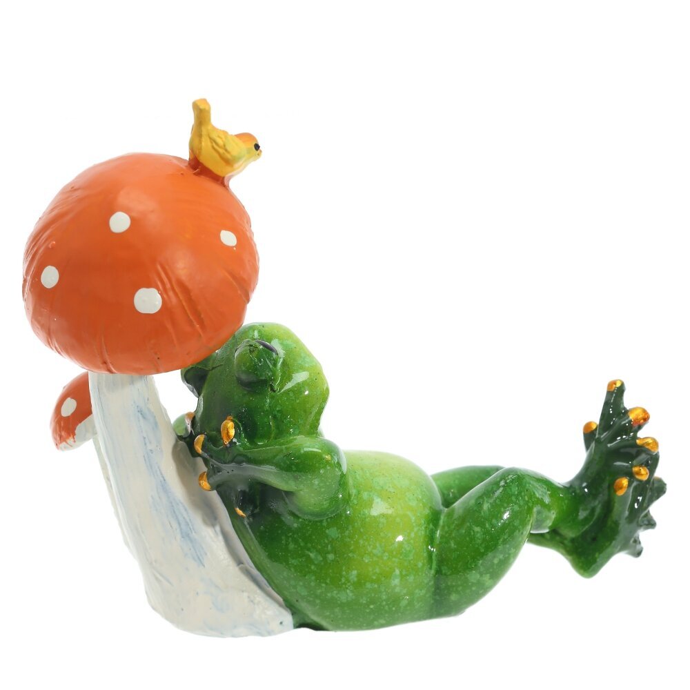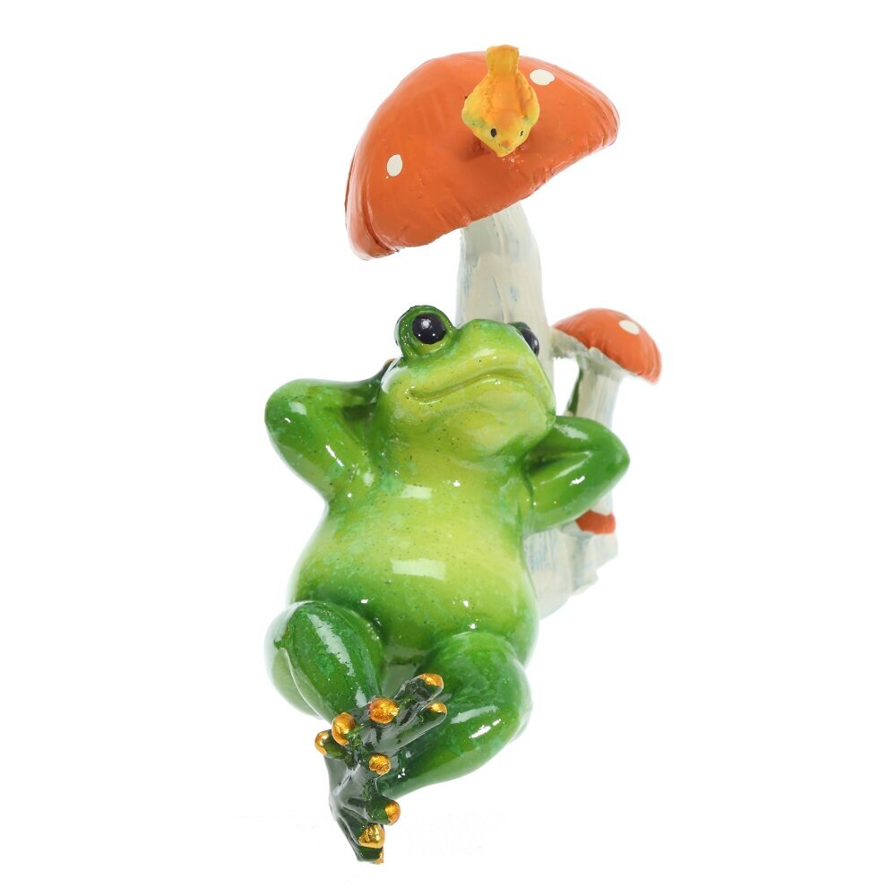 Декоративная фигурка, выполненная из полимерных материалов, изображает забавную зеленую лягушку, которая уютно устроилась, опираясь спиной на большой гриб с ярко-оранжевой шляпкой. Лягушка кажется полностью расслабленной и довольной, что придаёт композиции особую жизнерадостность. На верхушке большого гриба расположилась маленькая желтая птичка, что добавляет композиции ещё больше уюта и очарования. Детализированная проработка элементов, яркие насыщенные цвета и милый сюжет делают эту декоративную фигурку идеальным украшением для дома, сада или офисного рабочего стола. Она создаёт атмосферу уюта, гармонии с природой и беззаботности, привнося в интерьер нотку радости и позитива.