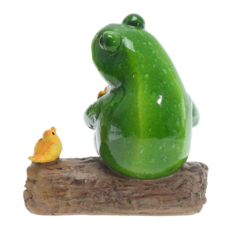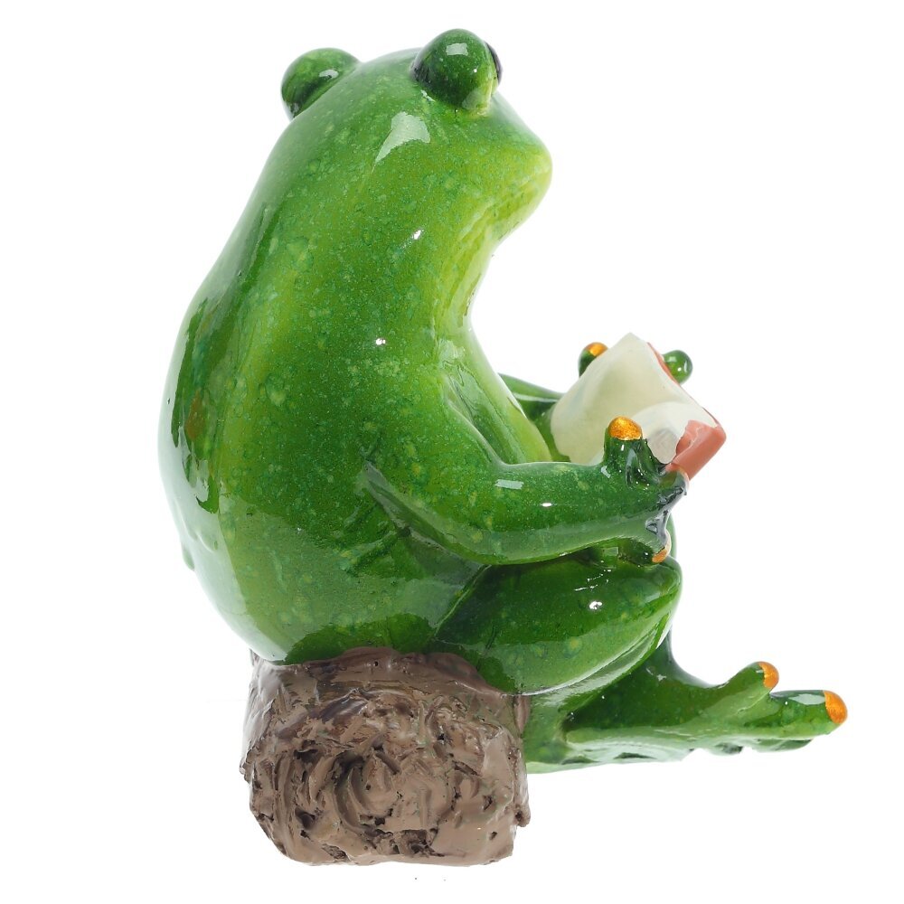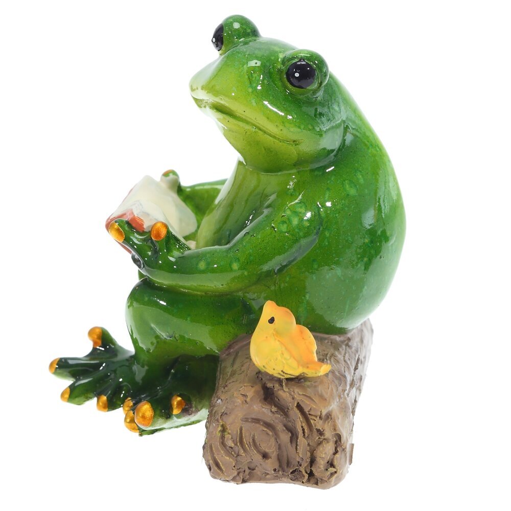 Декоративная фигурка, выполнена из полимерных материалов и представляет собой забавную композицию: зелёная лягушка с выразительными глазами, в руках она держит раскрытую книгу. Рядом с лягушкой, на бревне, расположилась маленькая жёлтая птичка, будто бы внимательно слушающая «чтение». Поверхность фигурки гладкая и блестящая, что подчёркивает насыщенность зелёного цвета и придаёт изделию дополнительную привлекательность. Эта оригинальная статуэтка отлично подойдёт для украшения интерьера, сада или рабочего стола, создавая атмосферу уюта и хорошего настроения, а также наполнит пространство ноткой сказочного волшебства.