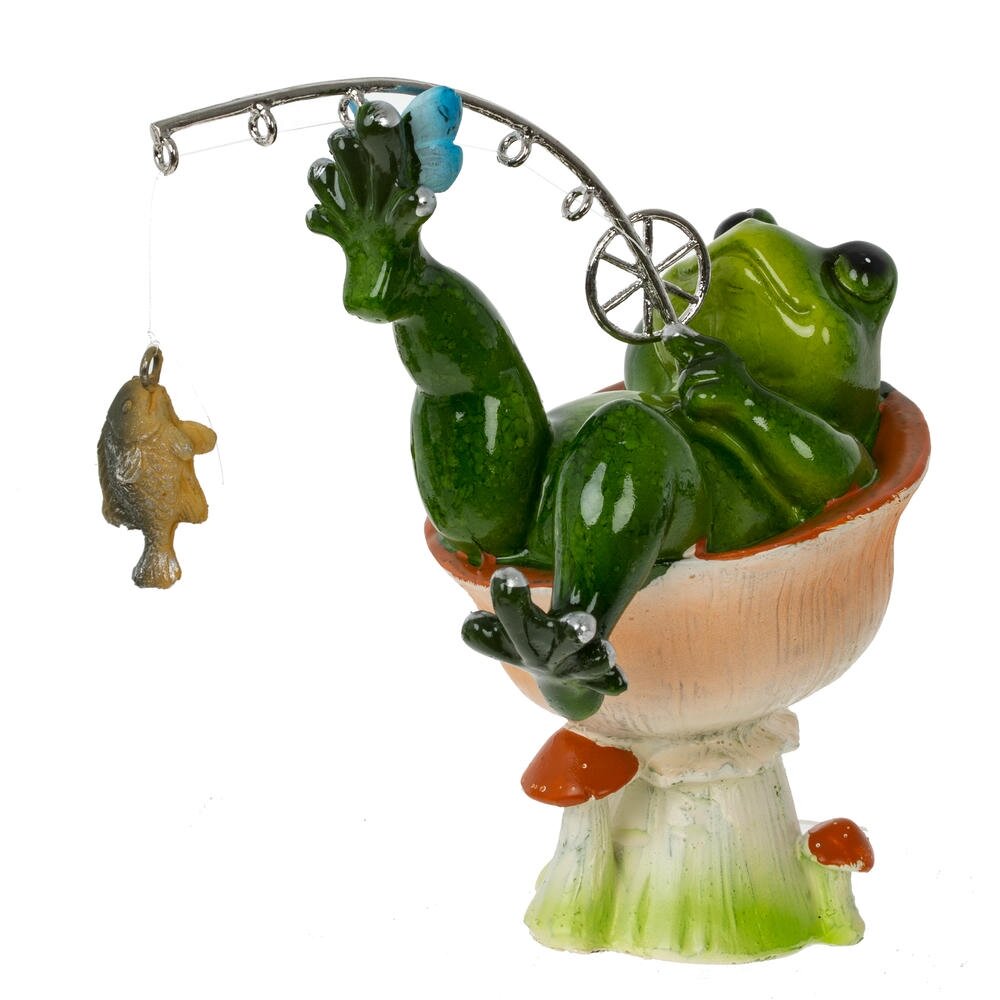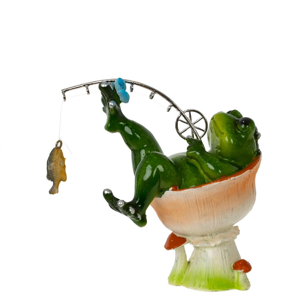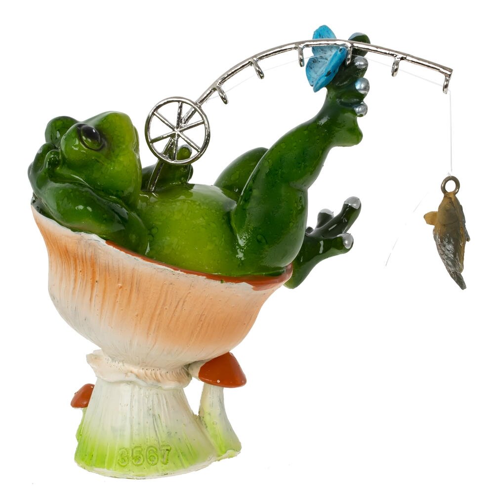 Декоративная фигурка из полимерных материалов в виде забавной лягушки-рыбака. Зеленая лягушка удобно расположилась в импровизированном кресле-грибочке, закинув ногу на ногу и держа в лапах изящное удилище с подвешенной на леске рыбкой. Яркие глянцевые краски, аккуратная проработка деталей и юмористический сюжет создают игривое настроение и притягивают внимание. Фигурка станет оригинальным украшением дома, офиса, дачи или сада, подчеркнет любовь хозяина к природе и рыбалке, а также послужит милым сувениром для друзей и близких. Легко сочетается с другими декоративными элементами и не требует особого ухода.