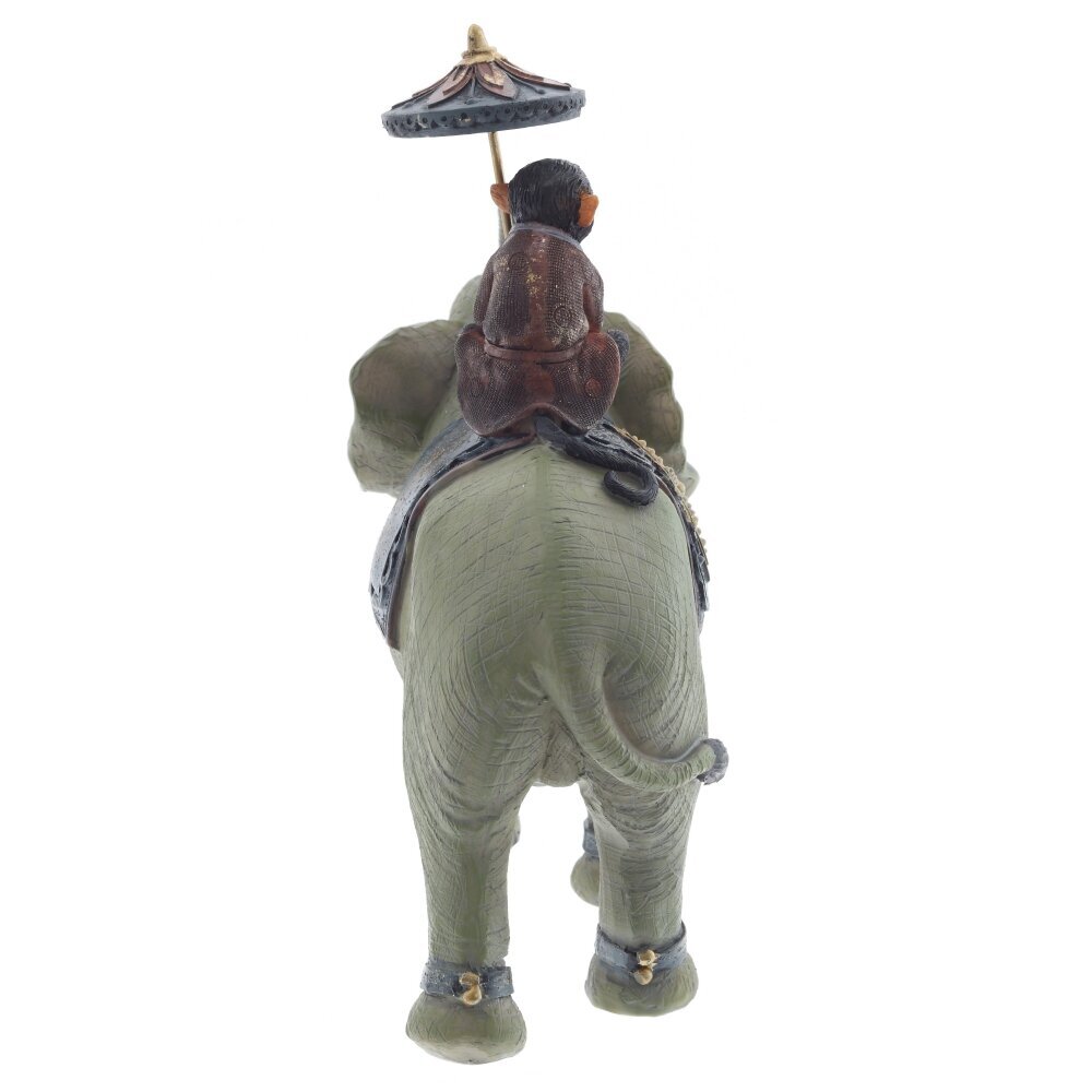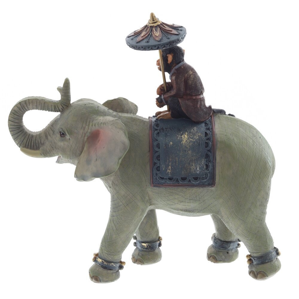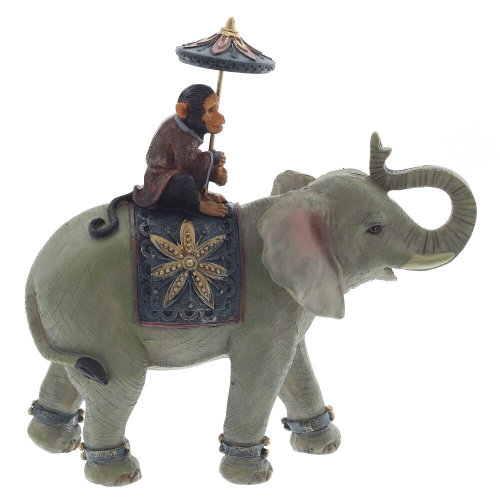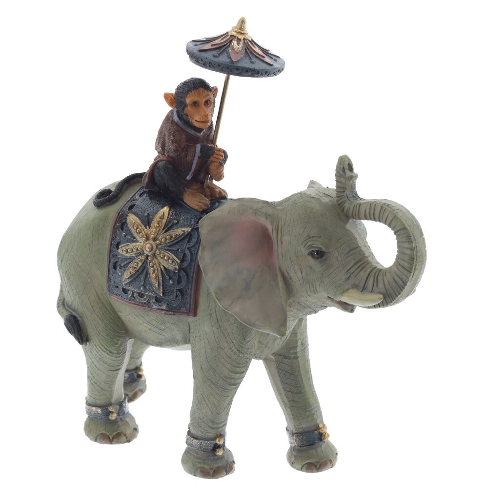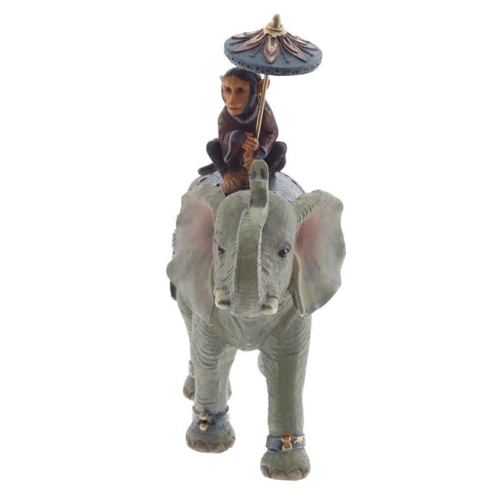 Декоративная фигурка "Обезьяна на слоне" выполнена из полимерных материалов с элементами металла, что придает ей особую изысканность и прочность. На спине расположилась обезьянка, держащая в руках изящный зонт. Тщательно прорисованные детали, такие как украшения на седле и браслеты на ногах слона, а также уникальный дизайн фигурки делают ее привлекательным украшением для интерьера. Такая композиция символизирует гармонию, дружелюбие и необычный союз между разными животными, отлично впишется в коллекцию или подарит уют любому дому.